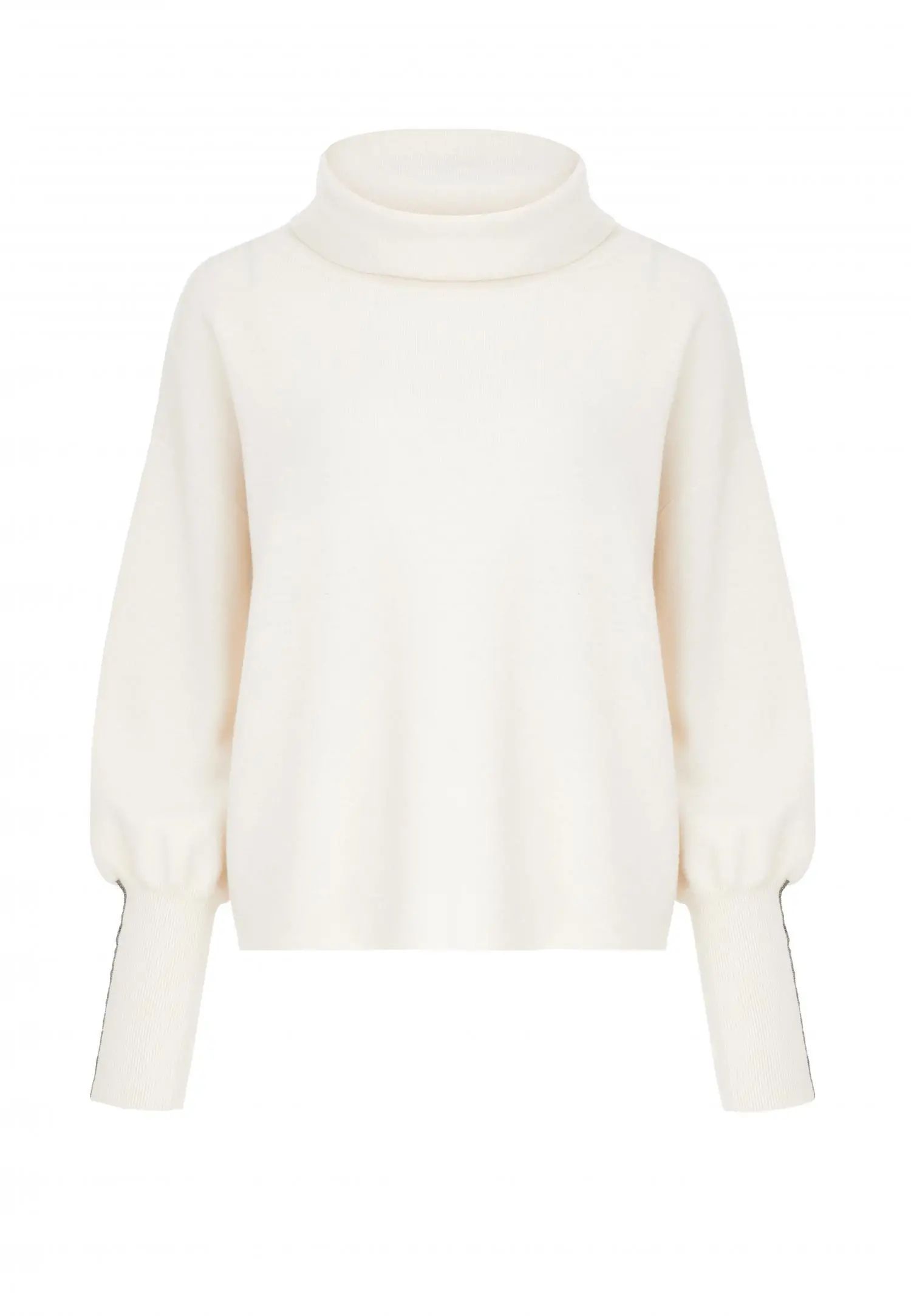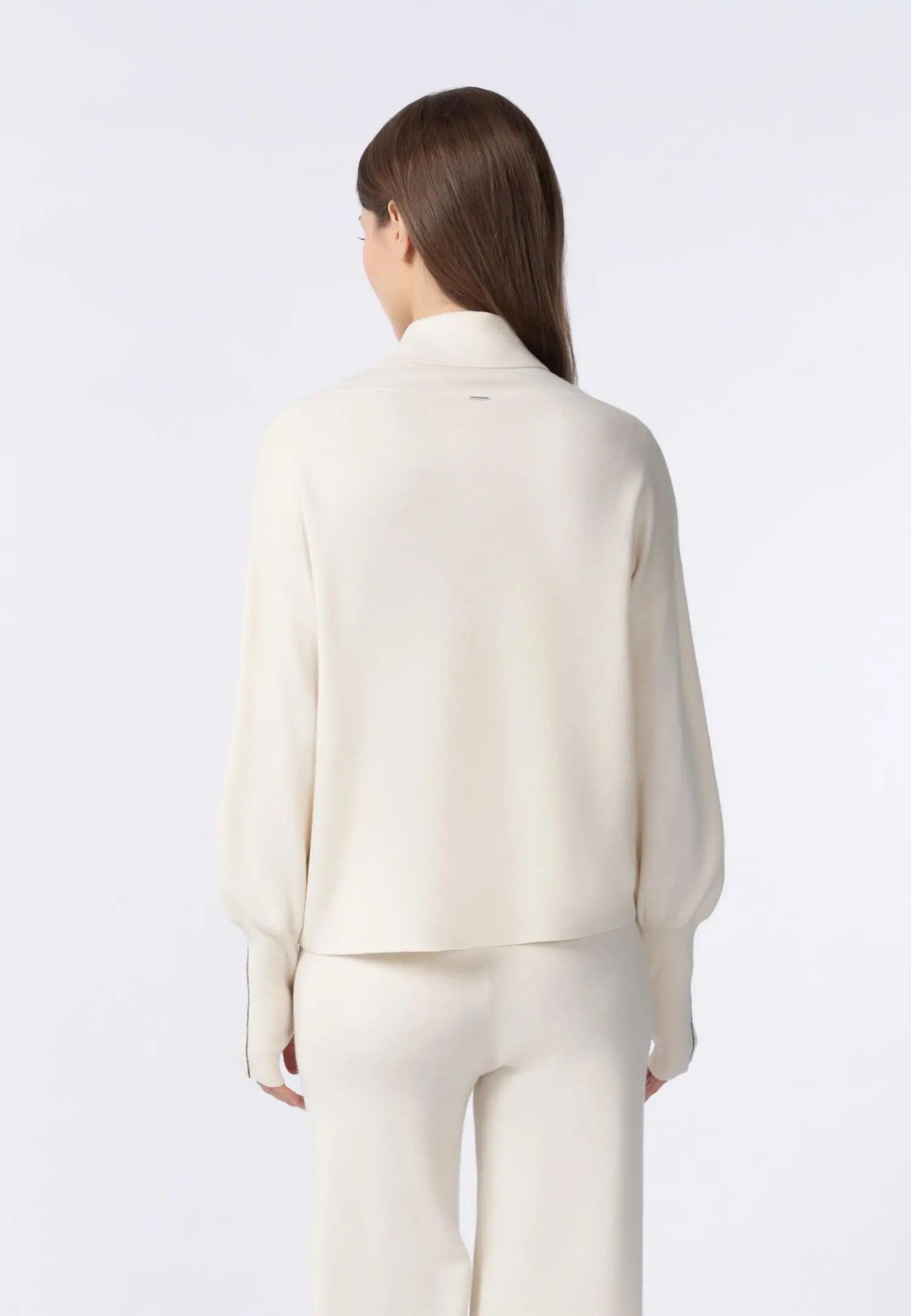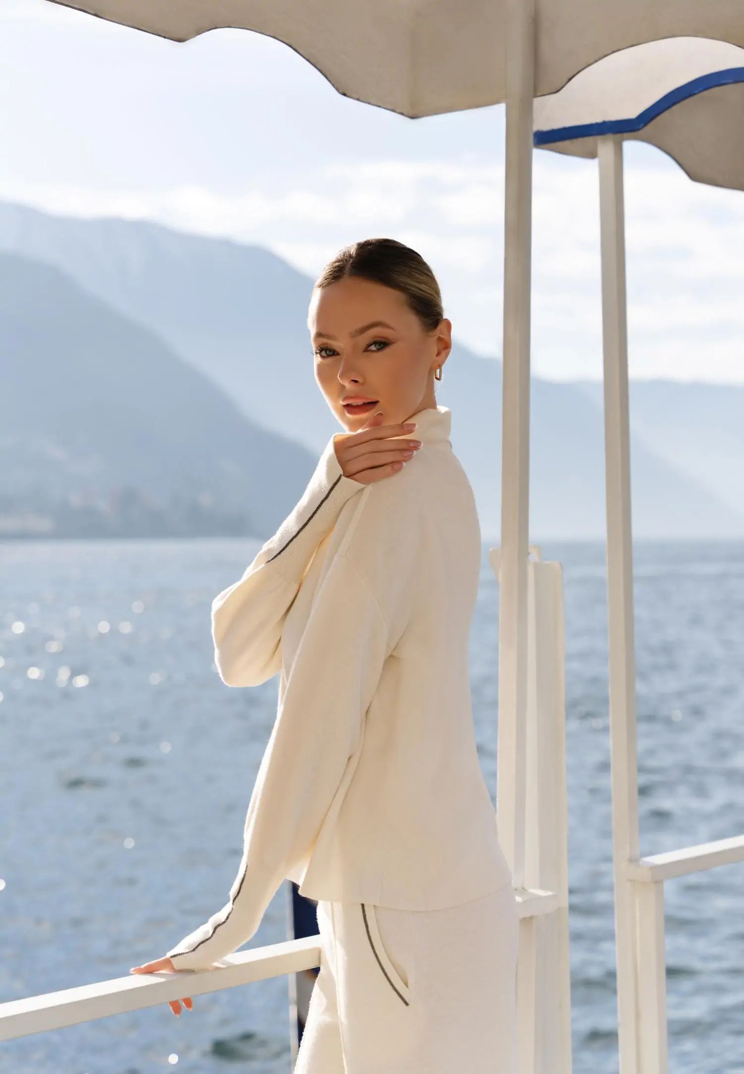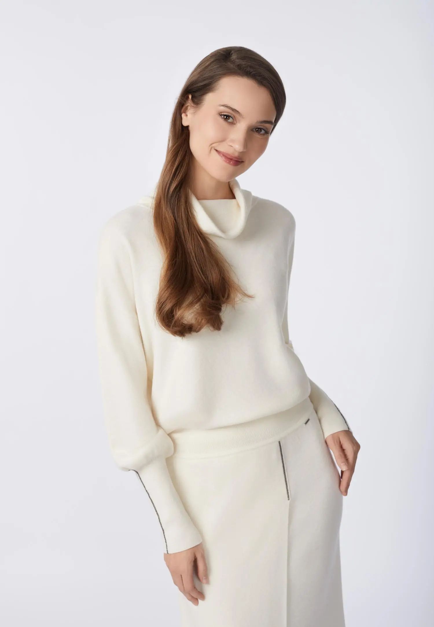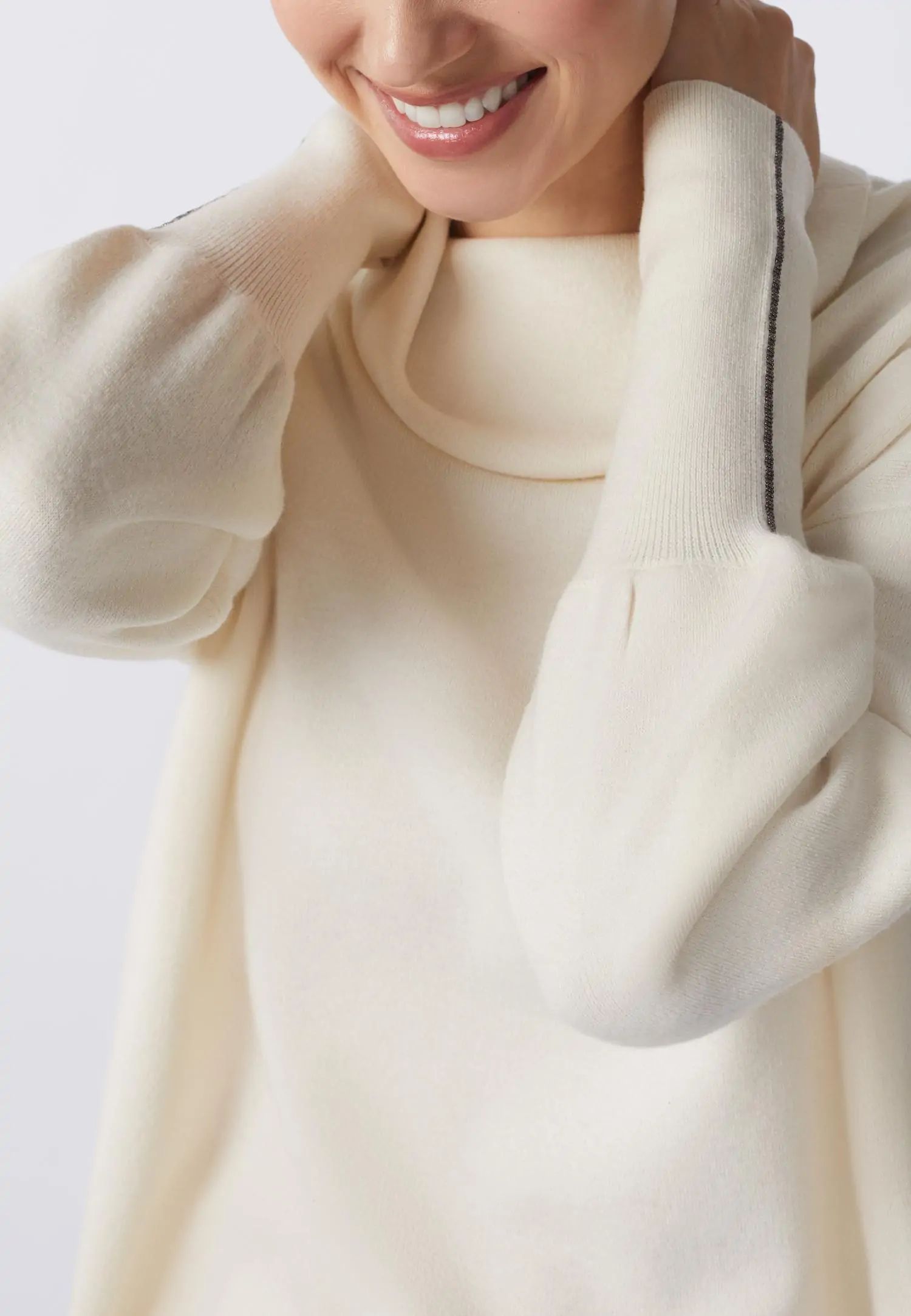 Пулвер с права кройка и дължина до талията с елегантни буф ръкави е изтъкан от луксозна прежда от смес от кашмир и мериносова вълна, която придава на продукта копринена мекота и изключителна топлина.Свободна и красиво падаща висока яка придава елегантност на пуловера. Издължената линия на раменете придава простор и комфорт на анцуга. Фината тъмносива метална верига на ръкава подчертава лукса и уникалността на джъмпера. Пуловерът е изплетен от интерлок плат, при който двете страни на плетката са с еднаква гладка и плътна повърхност. Тази тъкан поддържа добре формата си, абсорбира по-добре влагата, запазва топлината и се разтяга по-малко. Комбинирайте с панталон с висока талия от същата серия. Продуктът е с гордост проектиран в Естония! • Луксозна и мека текстура • Отлична топлоизолация • Дишаща и лека • Устойчив и вечен дизайн • Естествен и екологичен избор