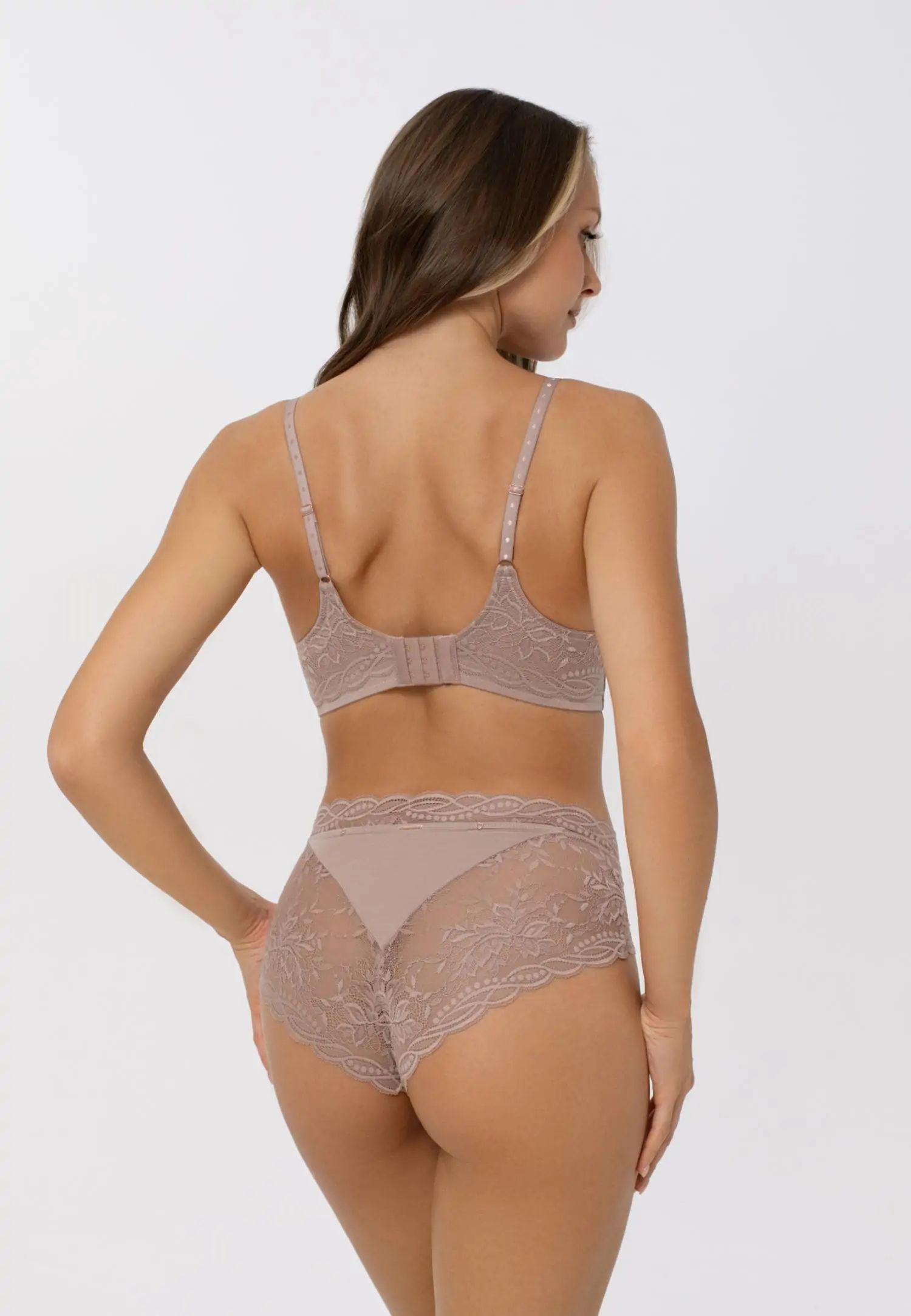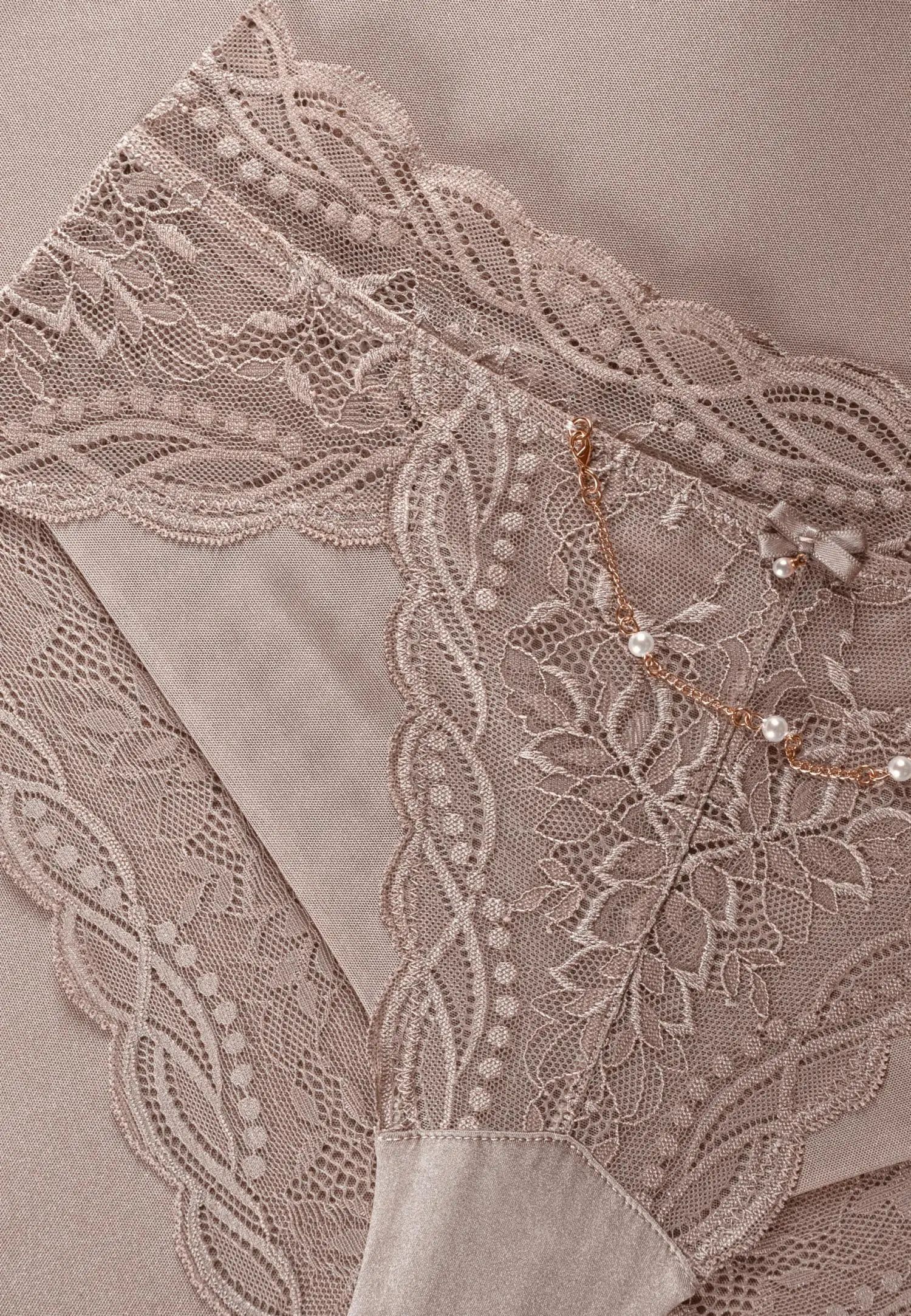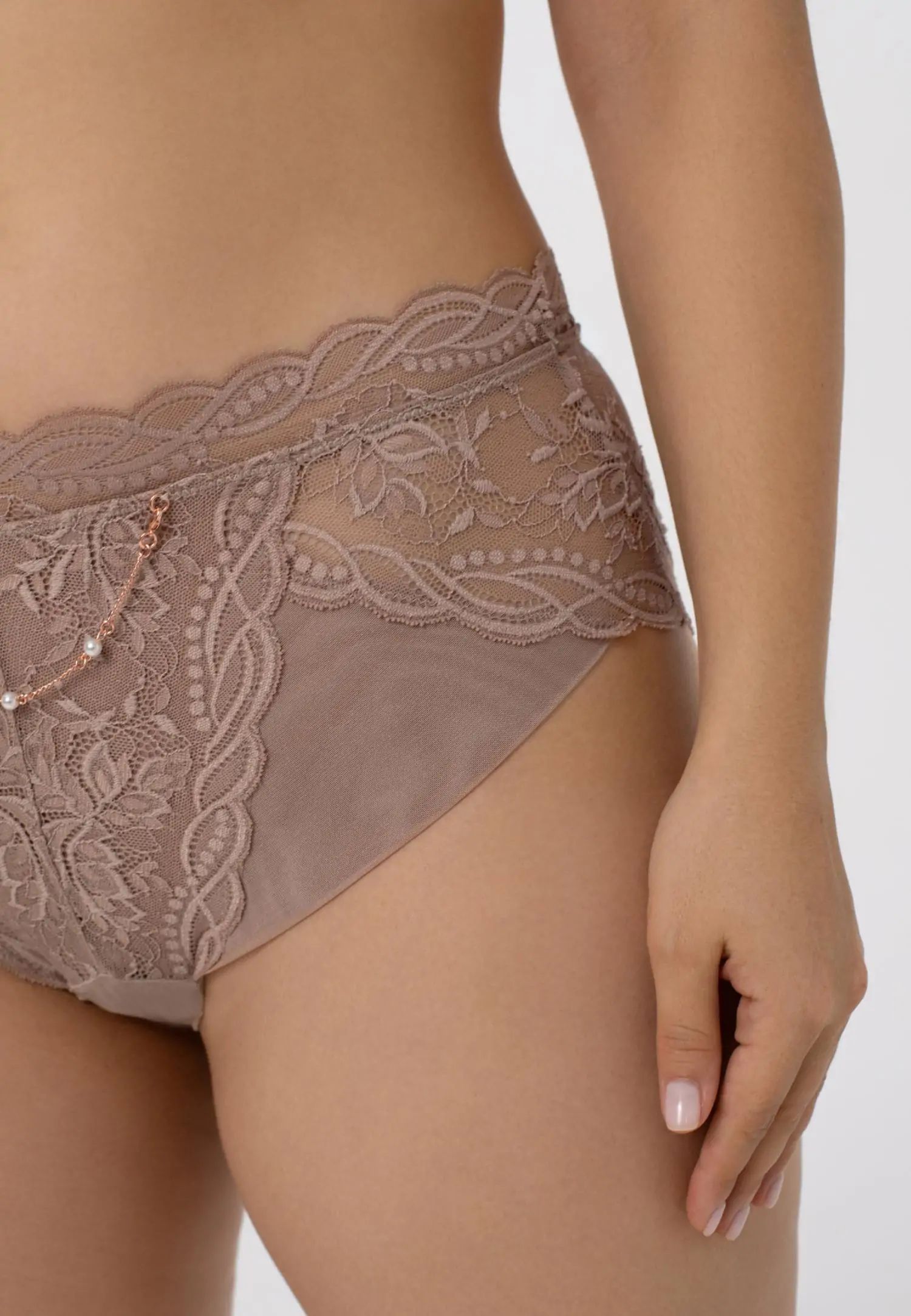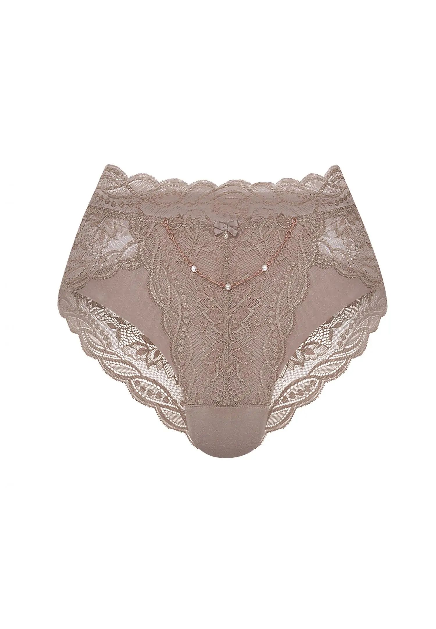 Серията бельо CHARMING в богат цвят мока е перфектна комбинация от мека дантела и луксозни детайли. Аксесоарите с дълги верижки и перли придават игрива елегантност и блясък на бельото. Бикини с висока талия, бразилска кройка. Продуктът е проектиран и разработен в Естония!