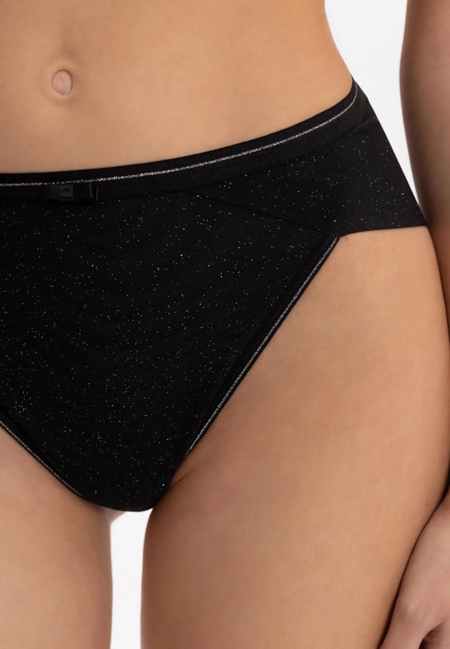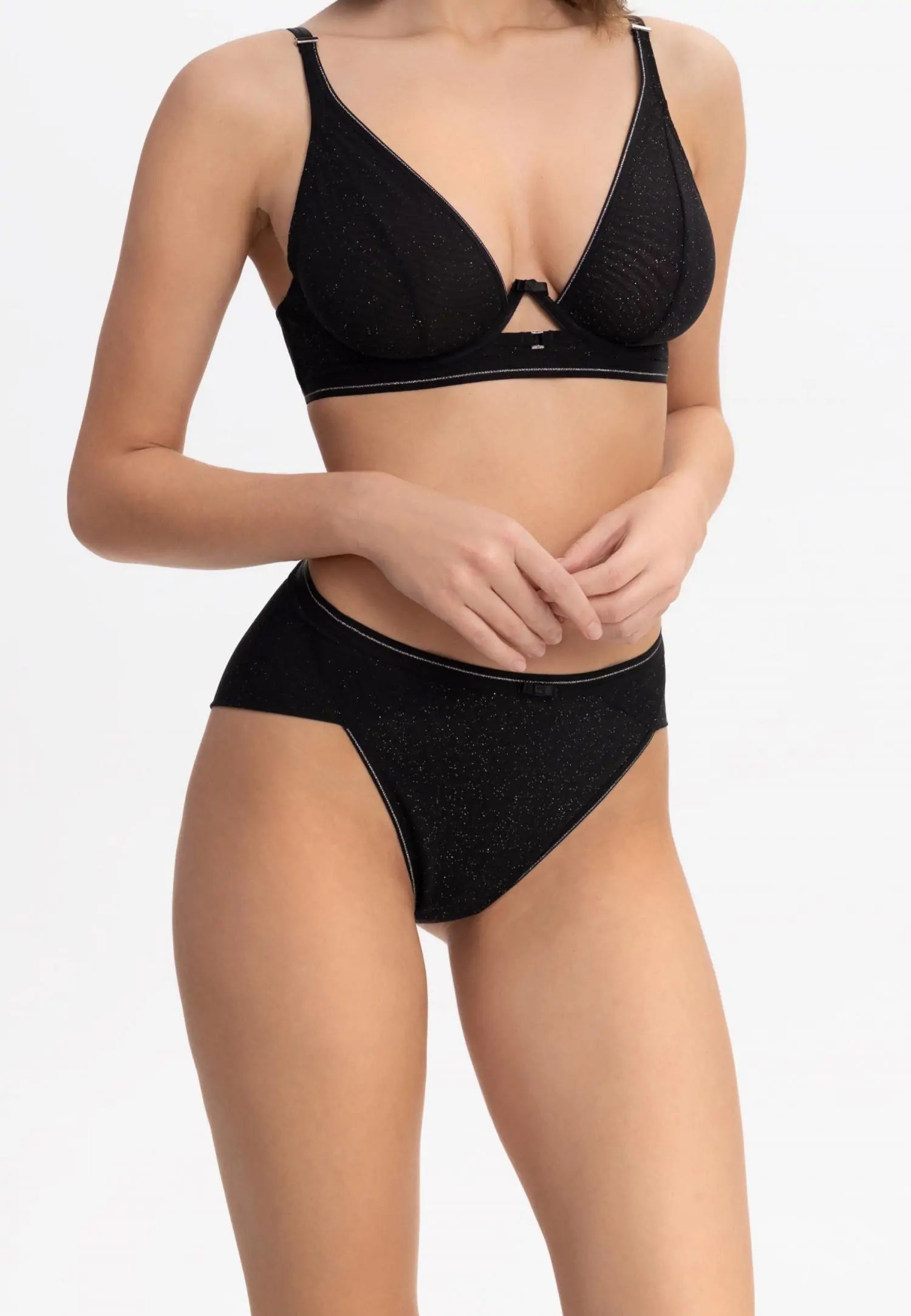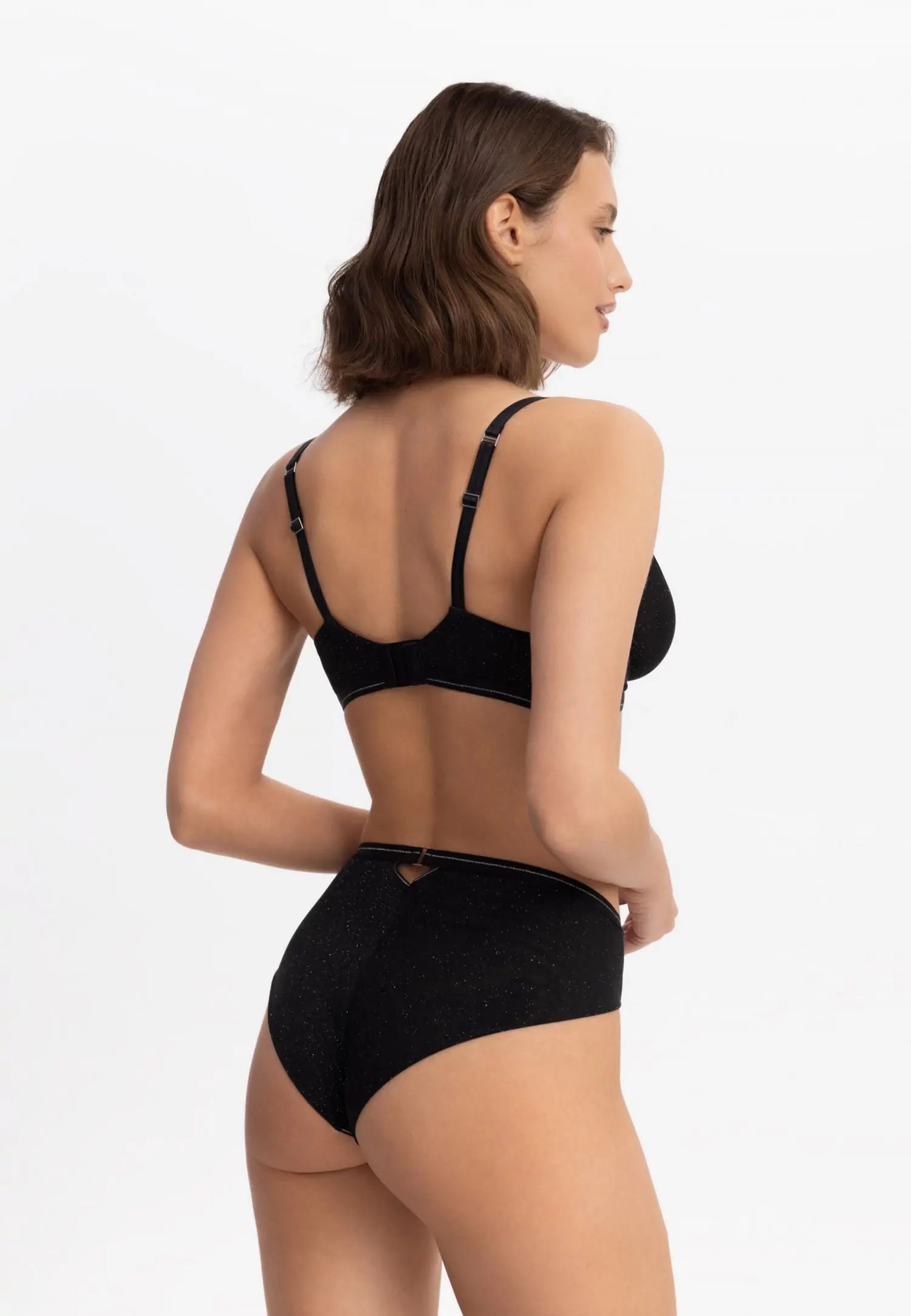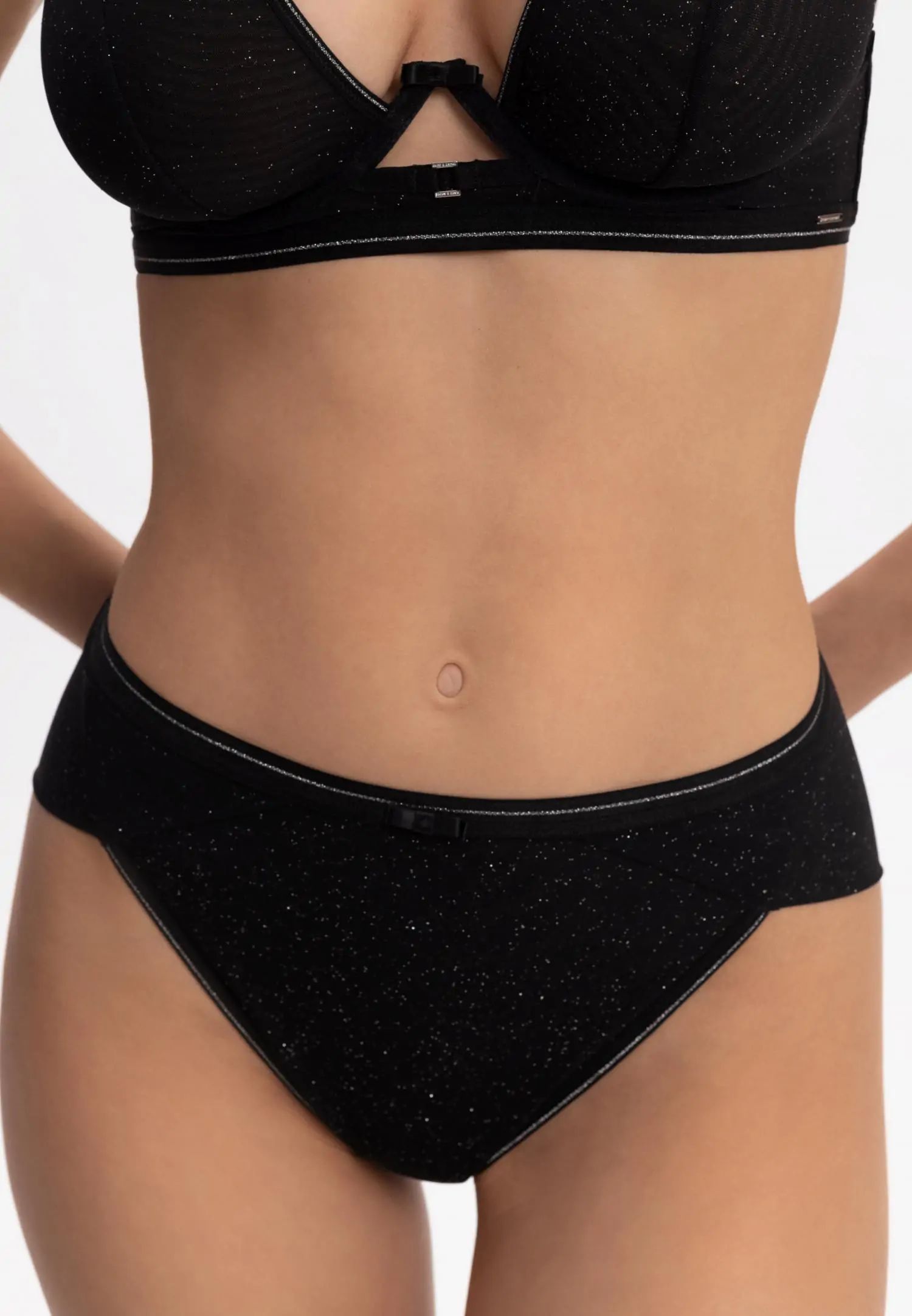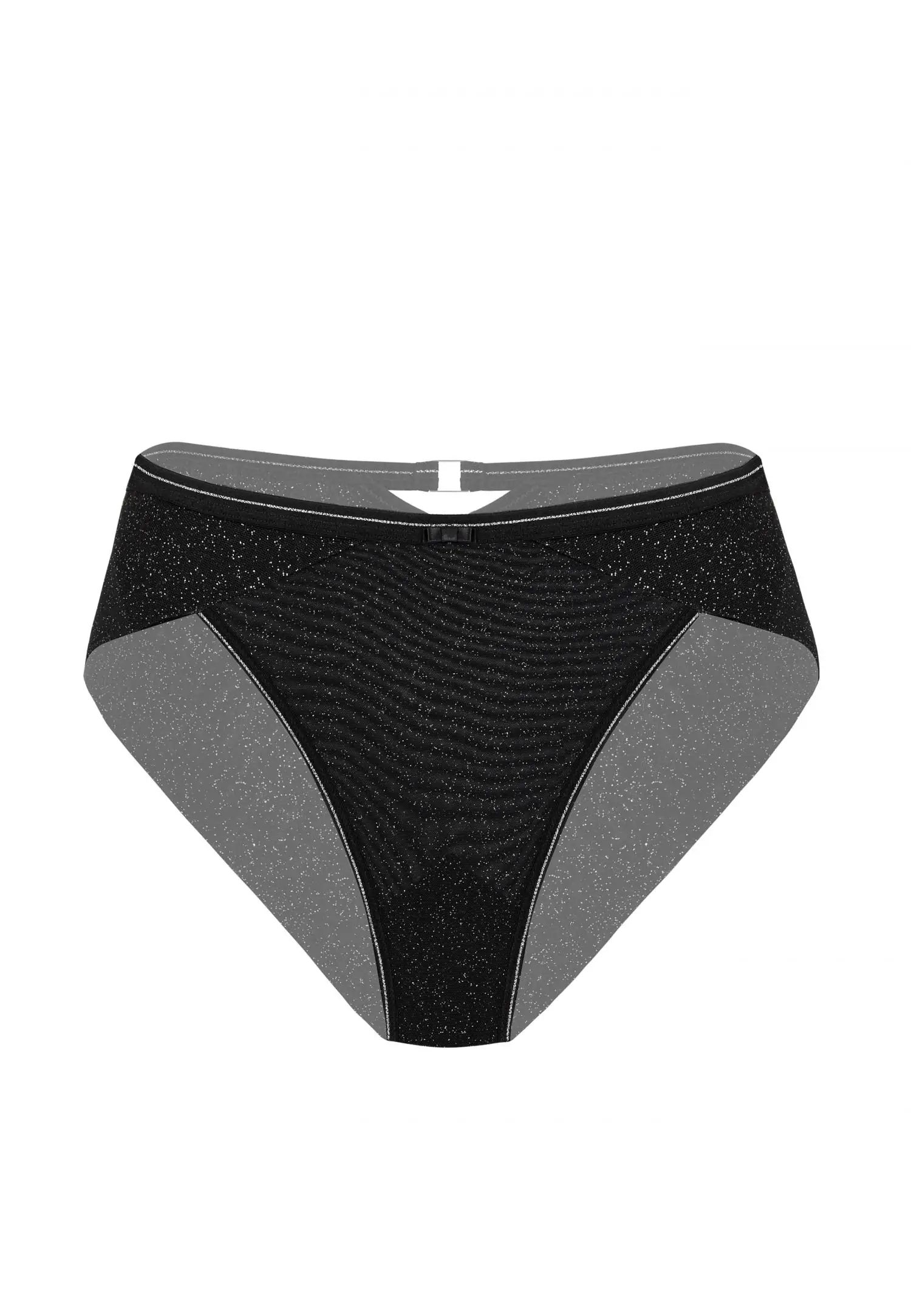 Бикини с висока талия и бразилска кройка. Серията DEEP NIGHT е като звездно нощно небе – блестящата материя отразява светлината като звезди, а полупрозрачните детайли добавят игривост и женственост. Тази серия е създадена за тези, които обичат да блестят и да се наслаждават на живота страстно.