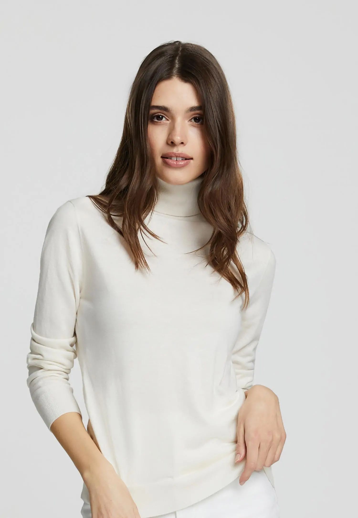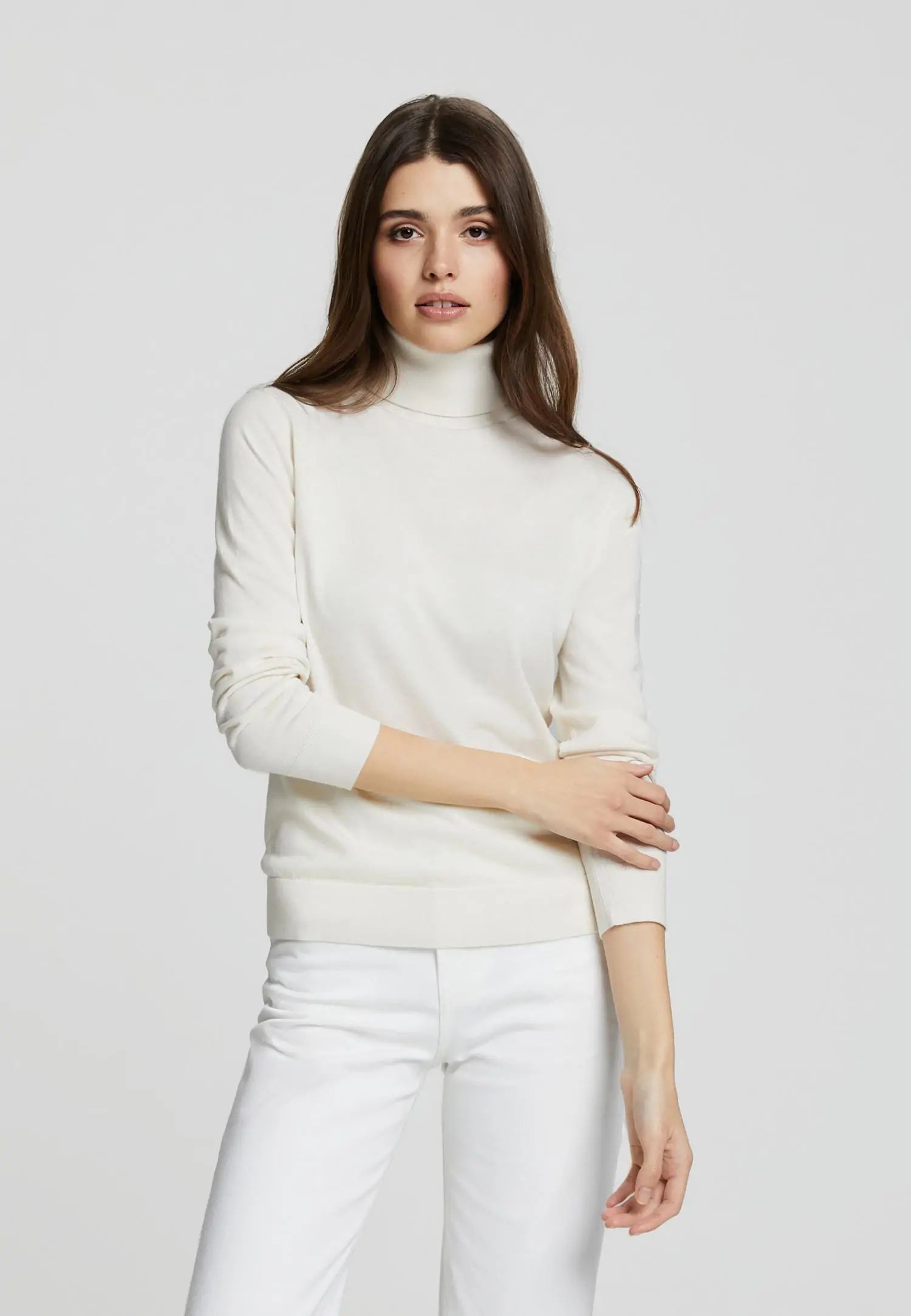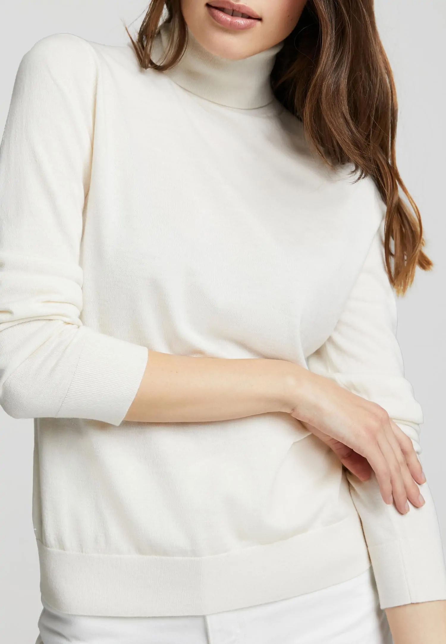Пуловер с високо деколте и дълги ръкави, леко вталени в талията, с оребрен край по тялото и подгъвите на ръкавите, изработен от ексклузивна копринена и кашмирена прежда. Продуктът е гордо проектиран в Естония!