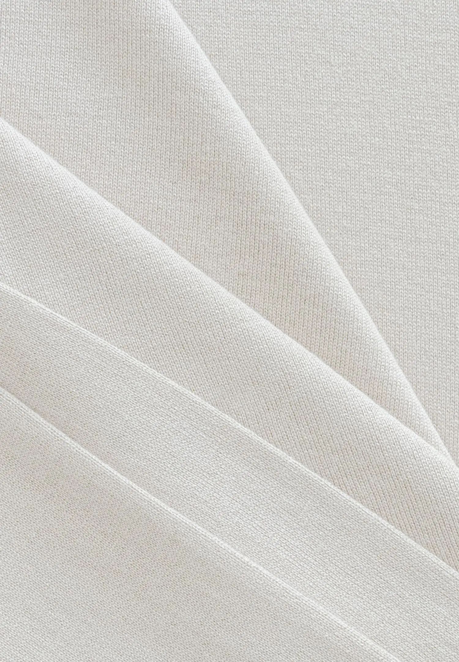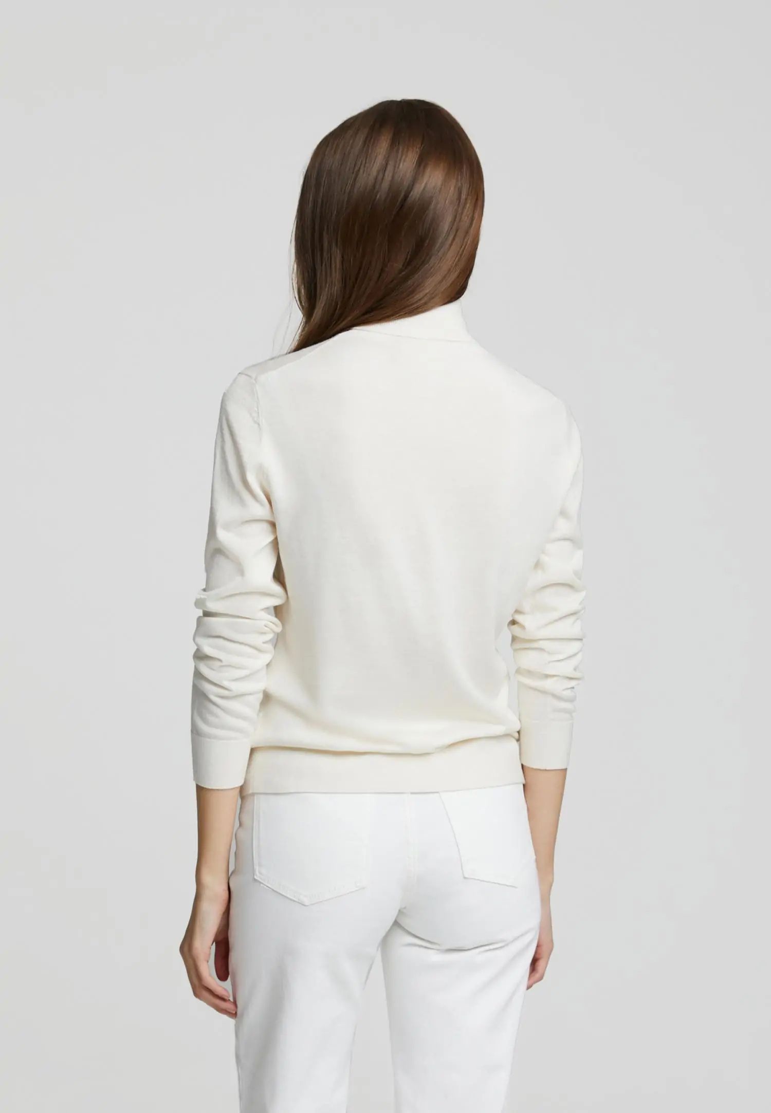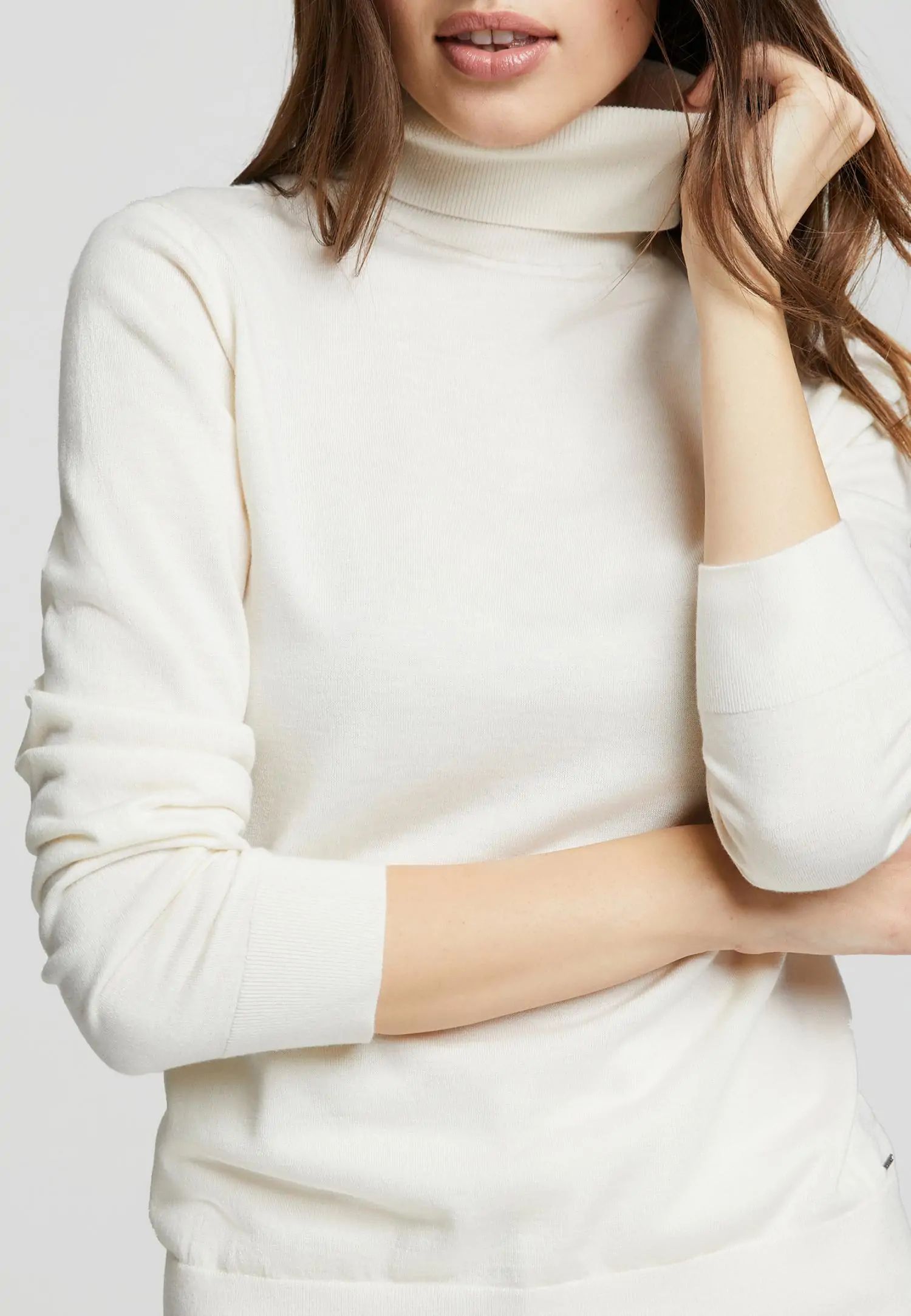 Пуловер с високо деколте и дълги ръкави, леко вталени в талията, с оребрен край по тялото и подгъвите на ръкавите, изработен от ексклузивна копринена и кашмирена прежда. Продуктът е гордо проектиран в Естония!