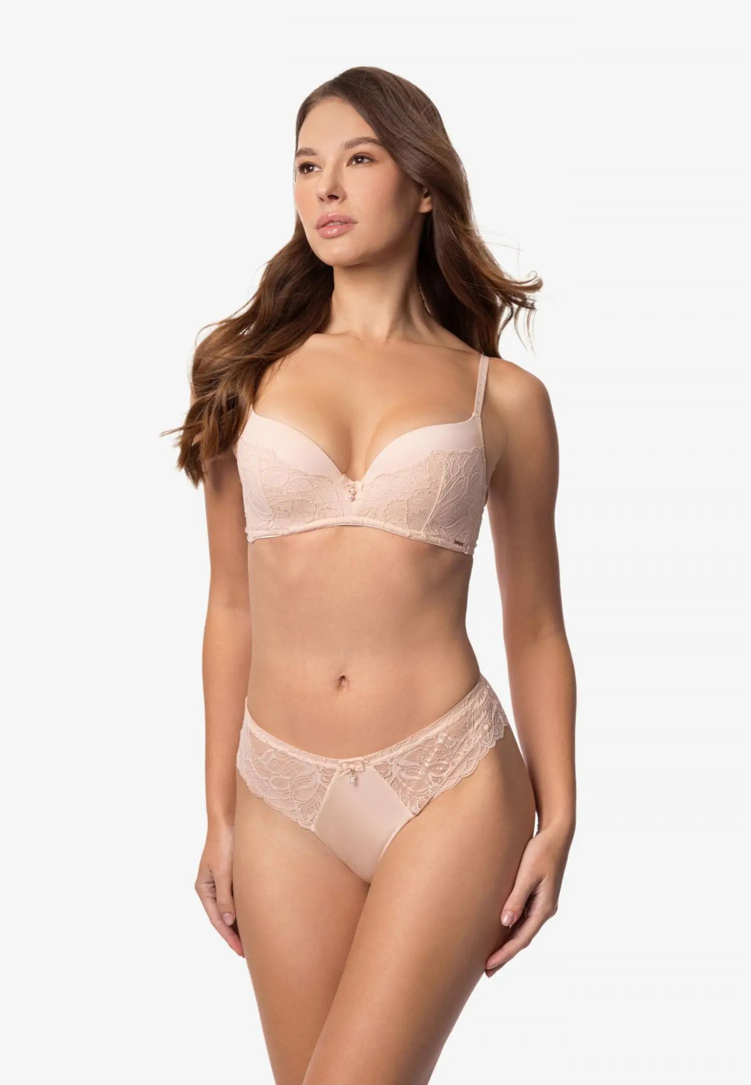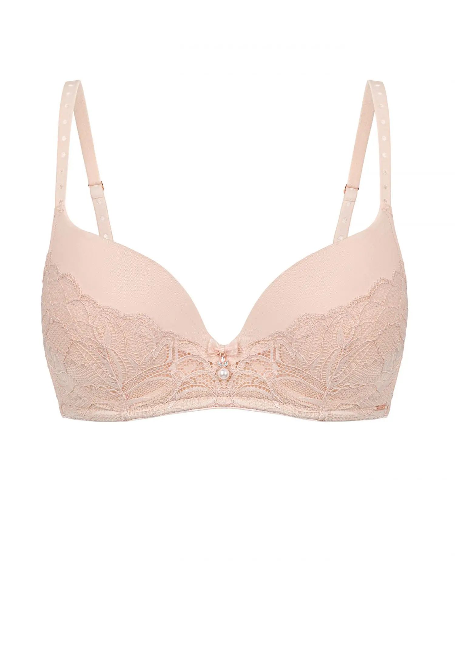 Сутиен с повдигащ ефект, формовани чашки и банели. Нежната розова дантела в телесен цвят създава топъл и спокоен вид, допълнен от златни и перлени детайли. ESSENCE е чувствен и ярък избор за жени, които ценят лекотата, топлината и естествената женственост. Продуктът е проектиран и разработен в Естония!