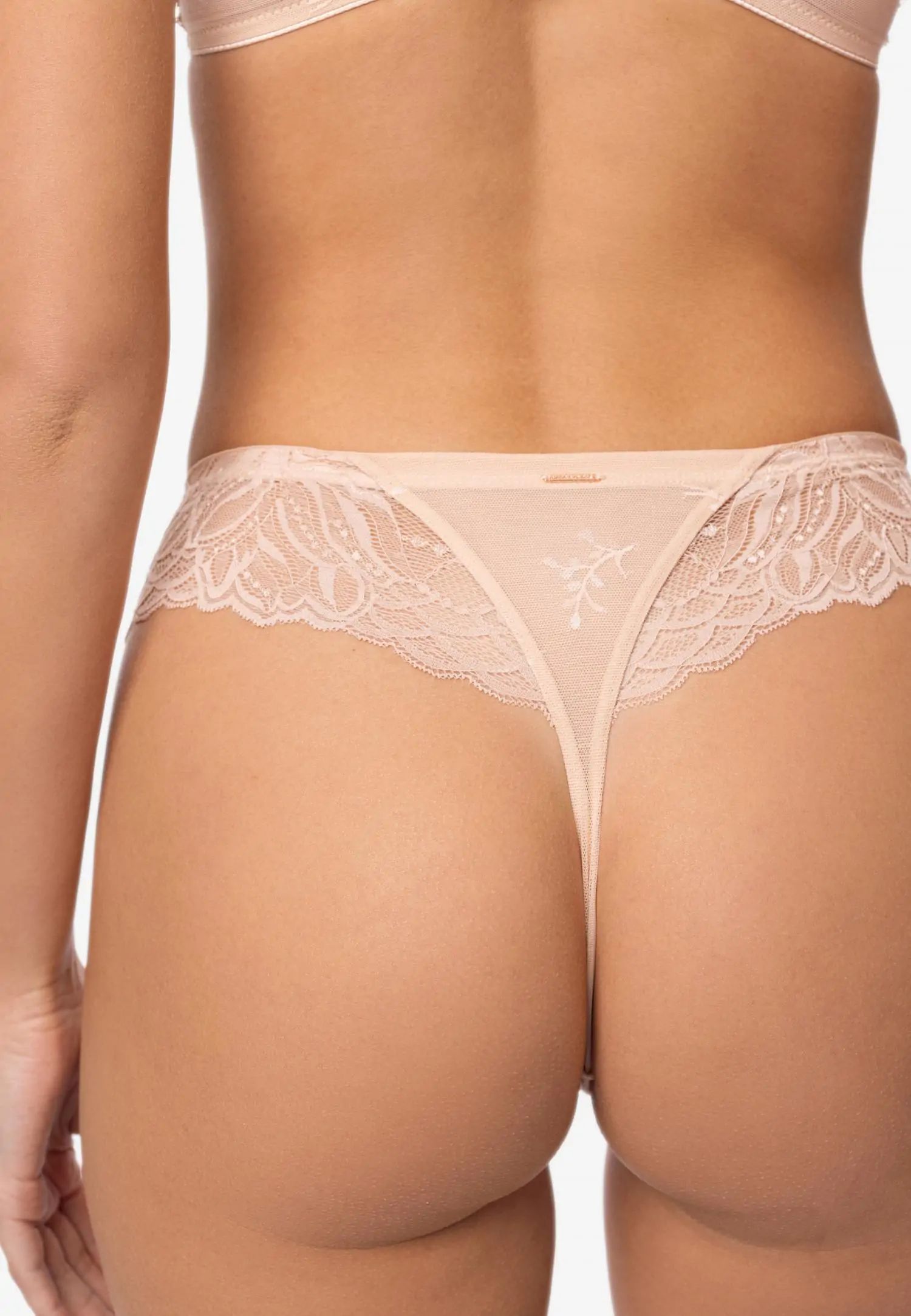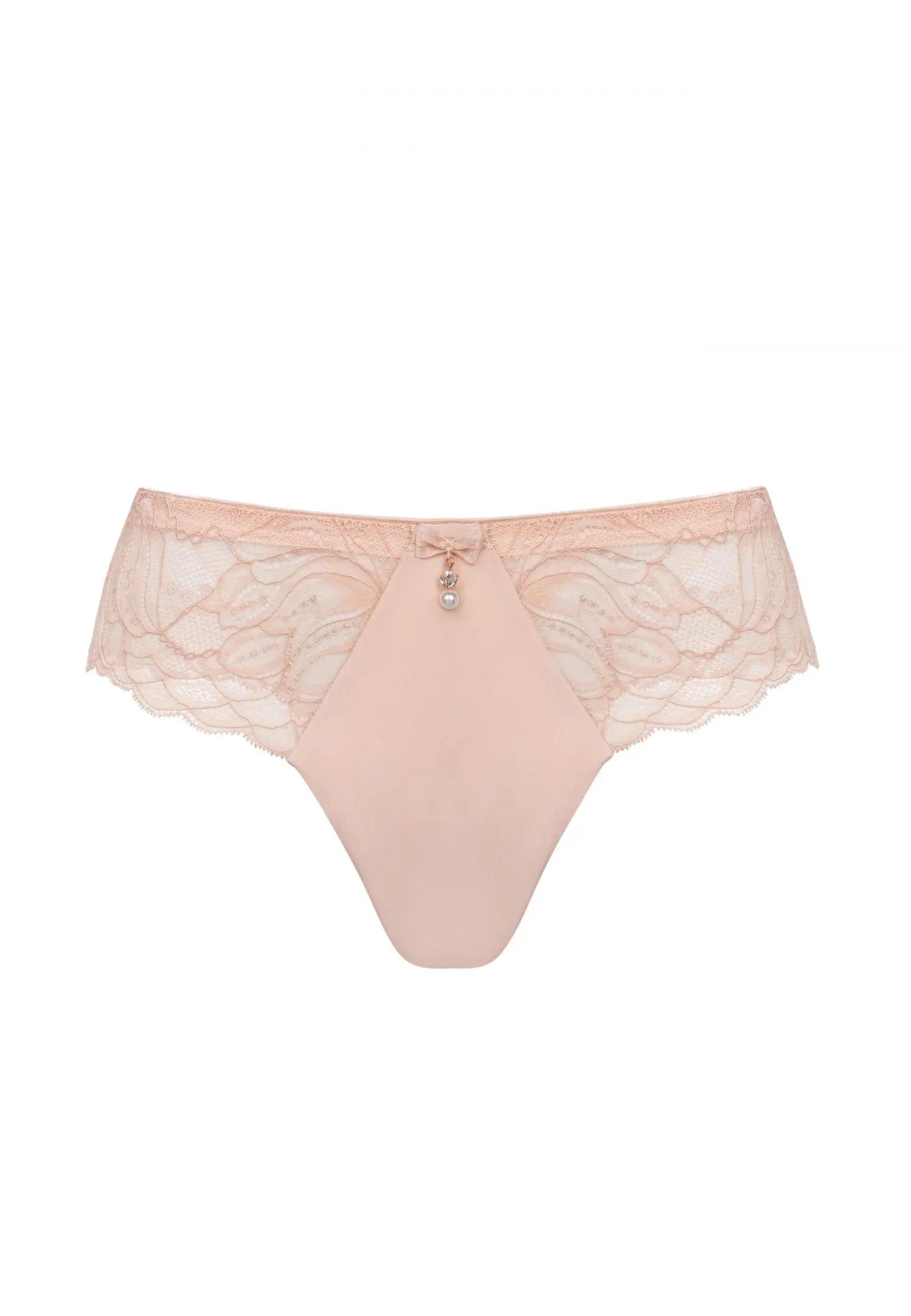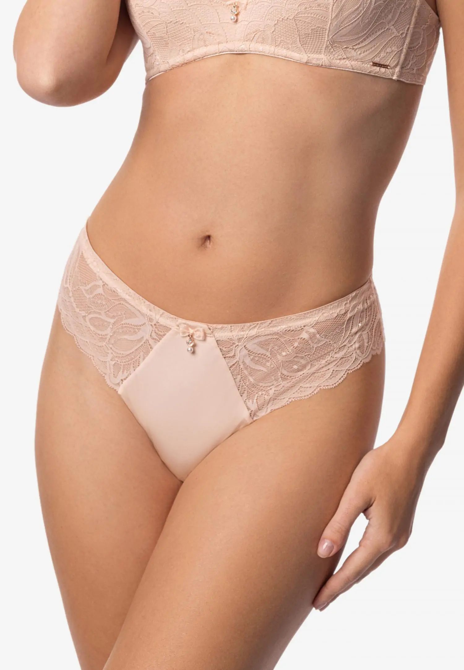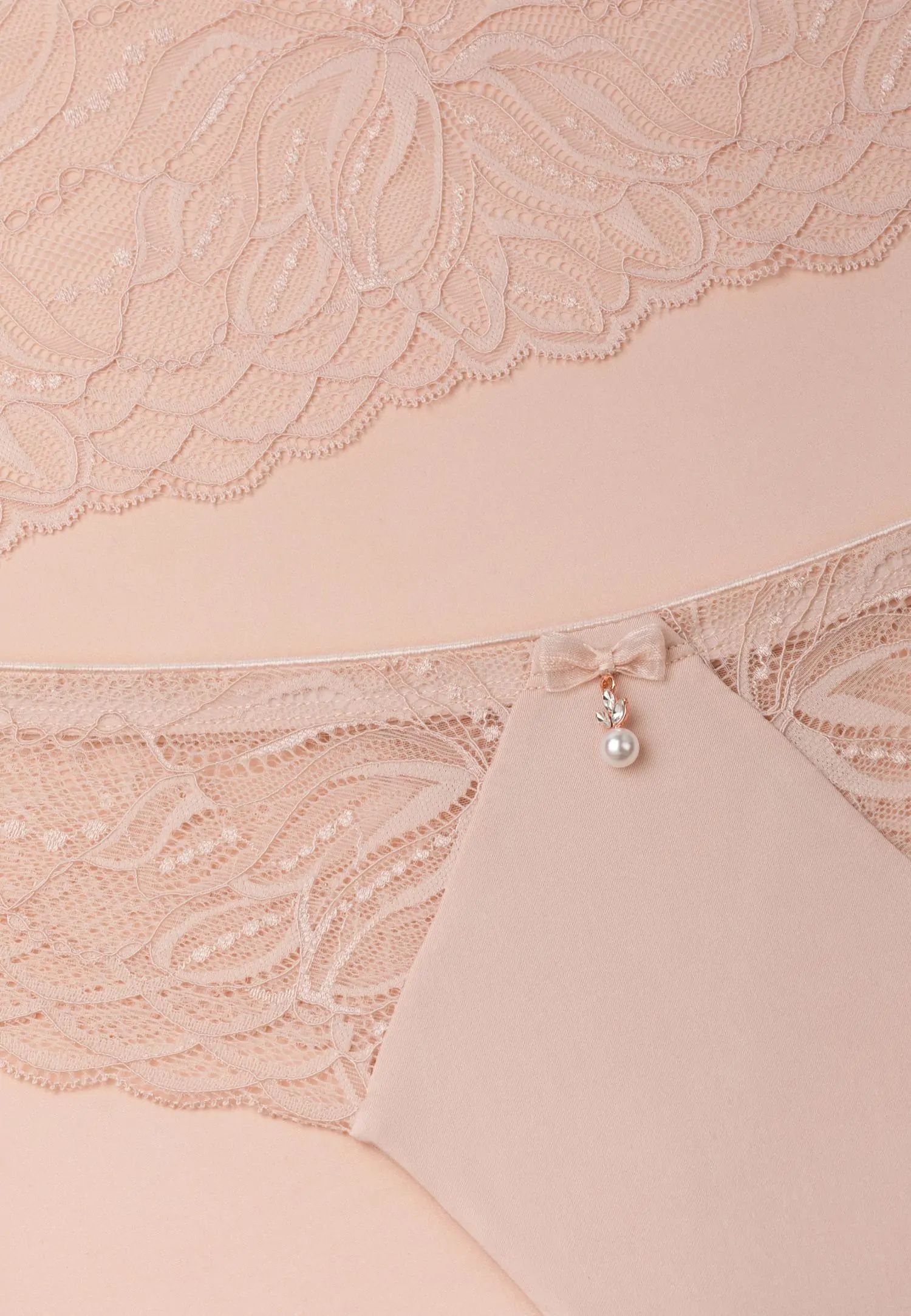 Прашки със средна талия. Меката розова дантела в телесен цвят създава топъл и спокоен вид, допълнен от златни и перлени детайли. ESSENCE е чувствен и ярък избор за жена, която цени лекотата, топлината и естествената женственост. Продуктът е проектиран и разработен в Естония!