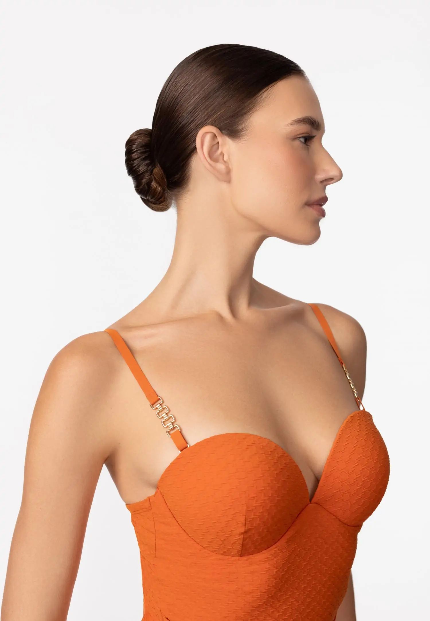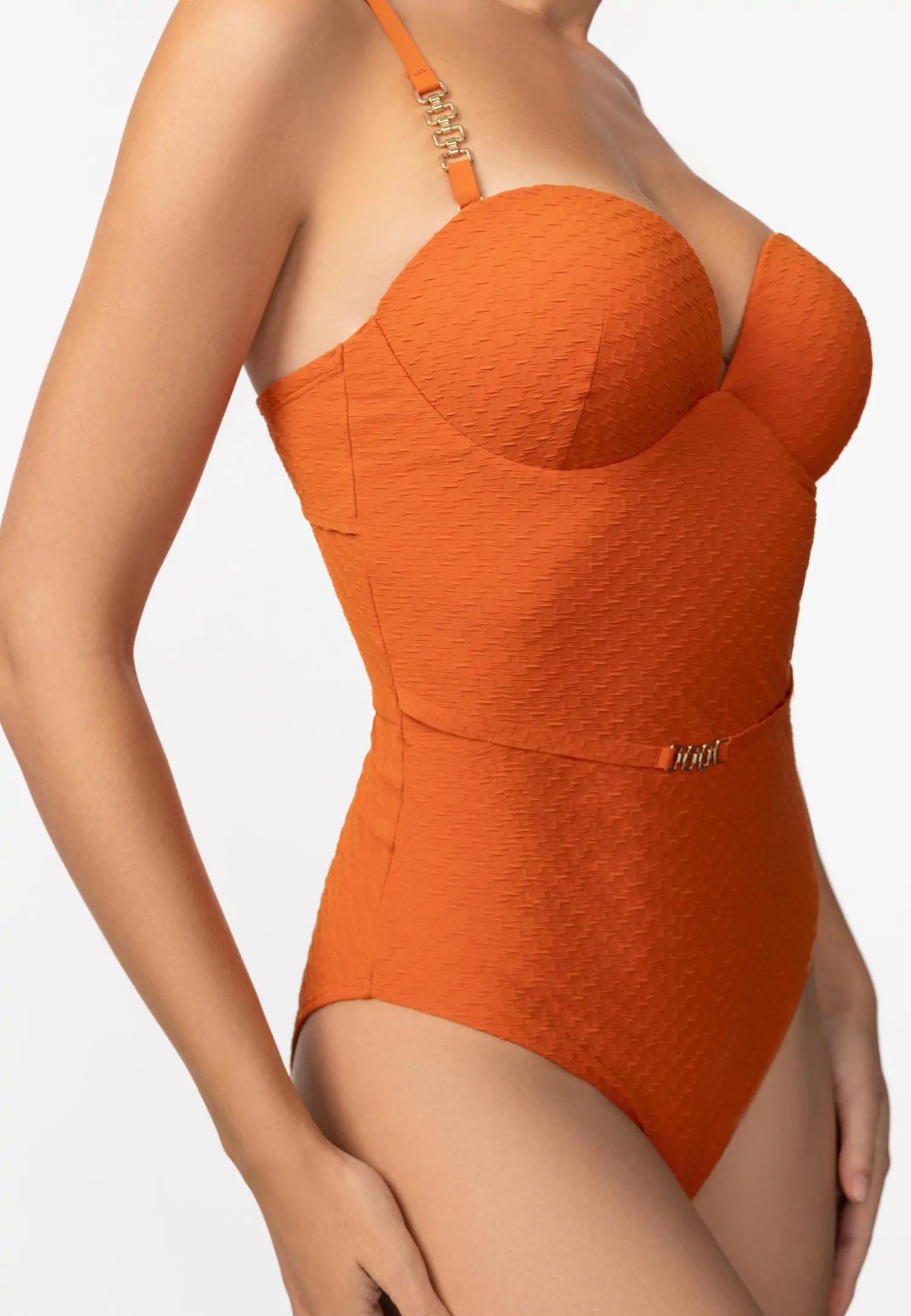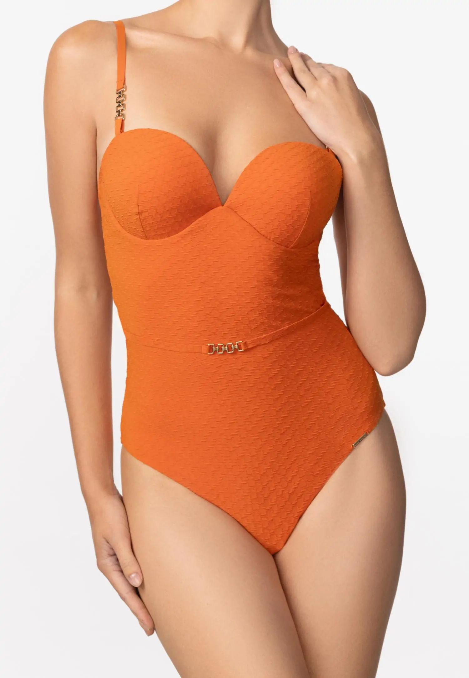 Вечен и елегантен цял бански с формовани чашки тип „бандо“, които създават красив силует и осигуряват стабилна опора с банели. Свалящите се и регулируеми презрамки осигуряват свобода на движение, а балансираната кройка и по-високото покритие на долната част гарантират удобно и уверено прилягане. Подплата отпред и отзад, осигуряваща допълнителен комфорт, идеално покритие и опора. Серията QUIET GRACE съчетава деликатна женственост и структурирана жакардова материя. Текстурата придава дълбочина и достойнство на всеки модел, създавайки спокоен и елегантен плажен стил. Продуктът е проектиран и разработен в Естония.