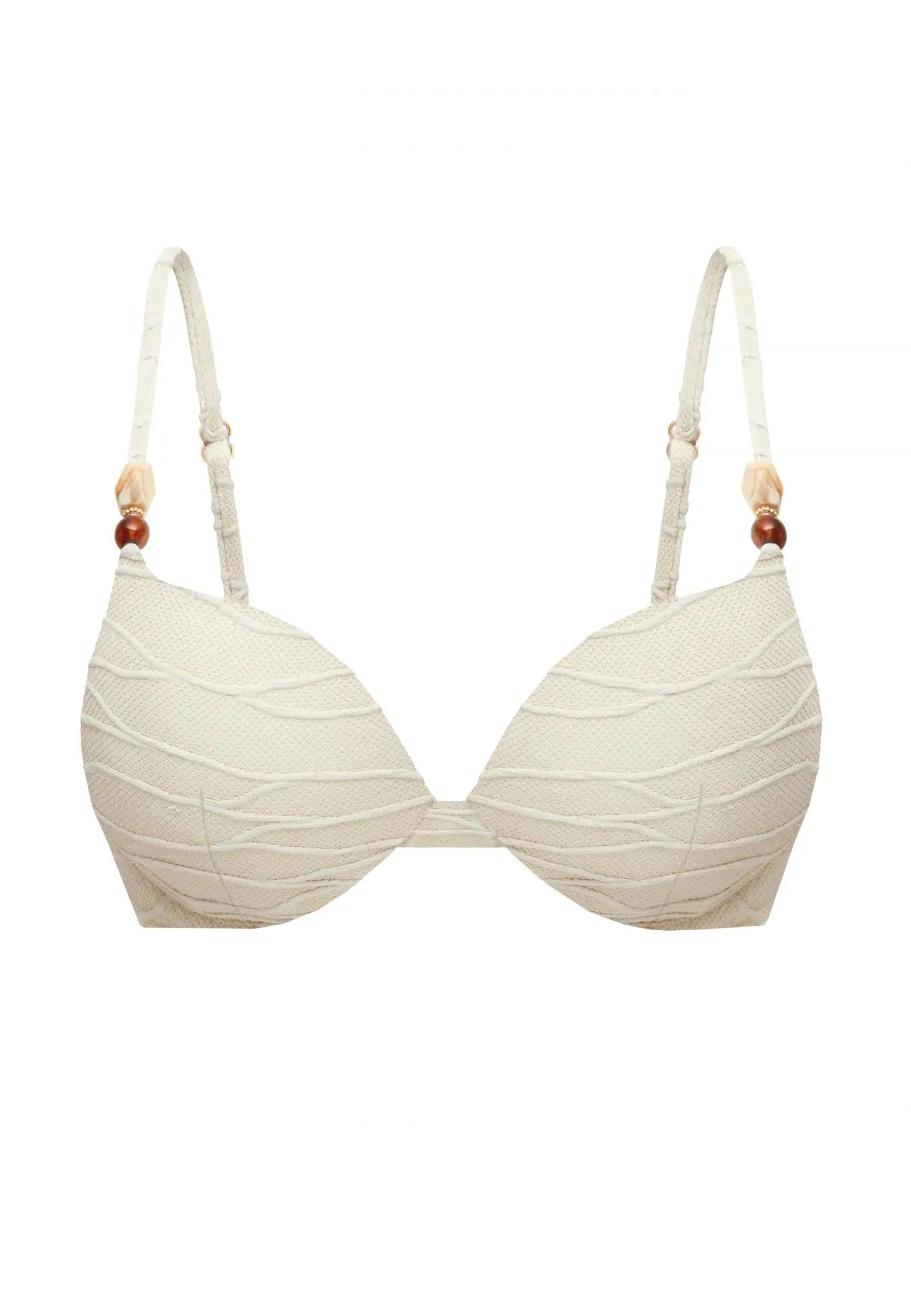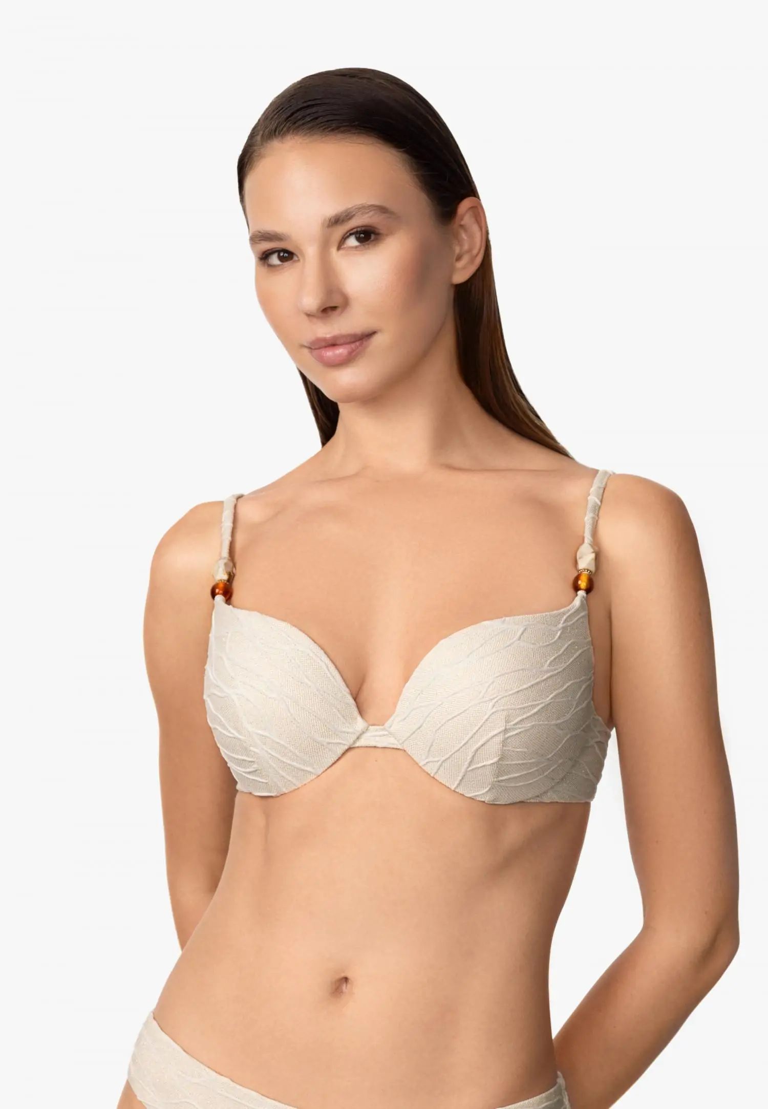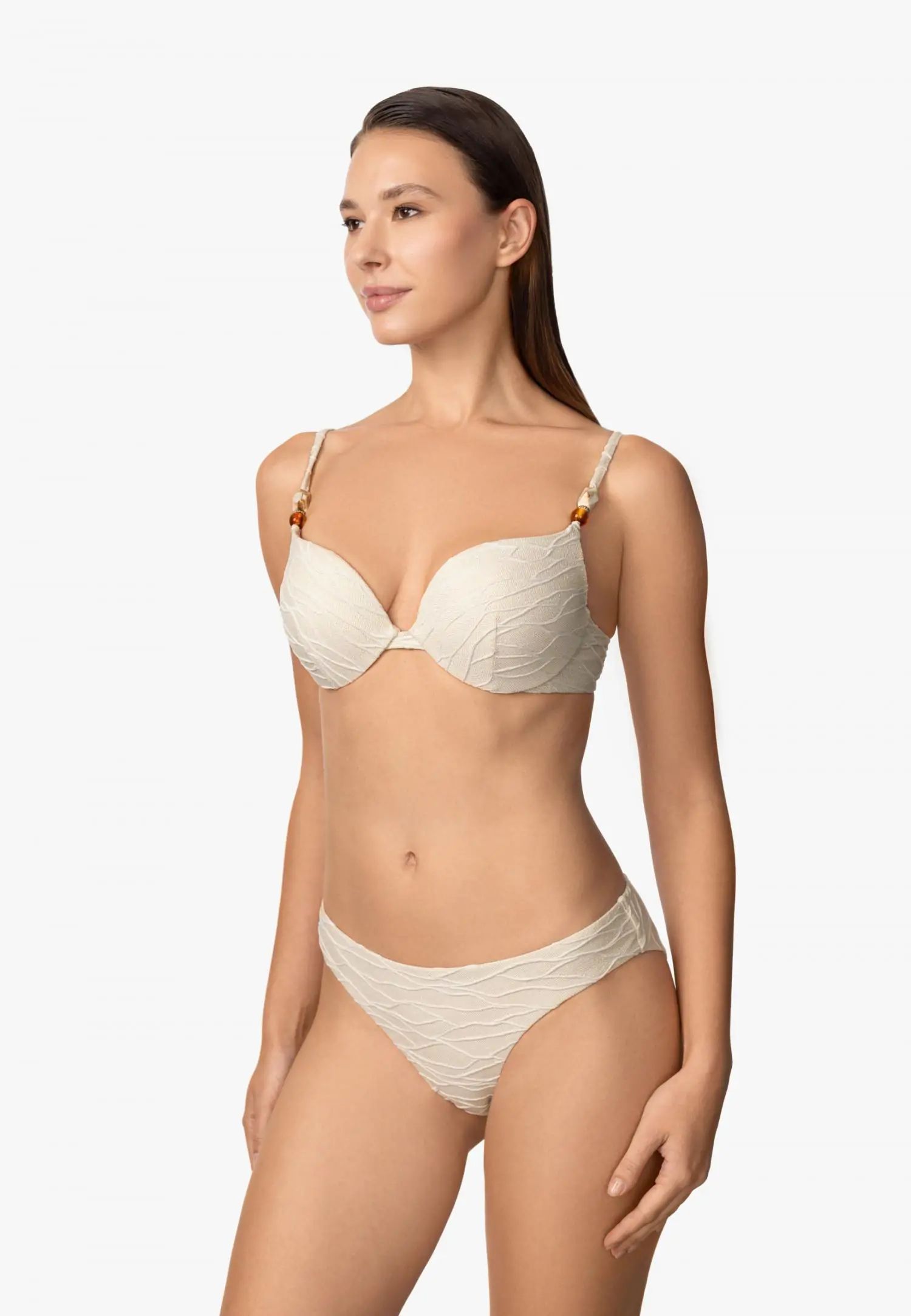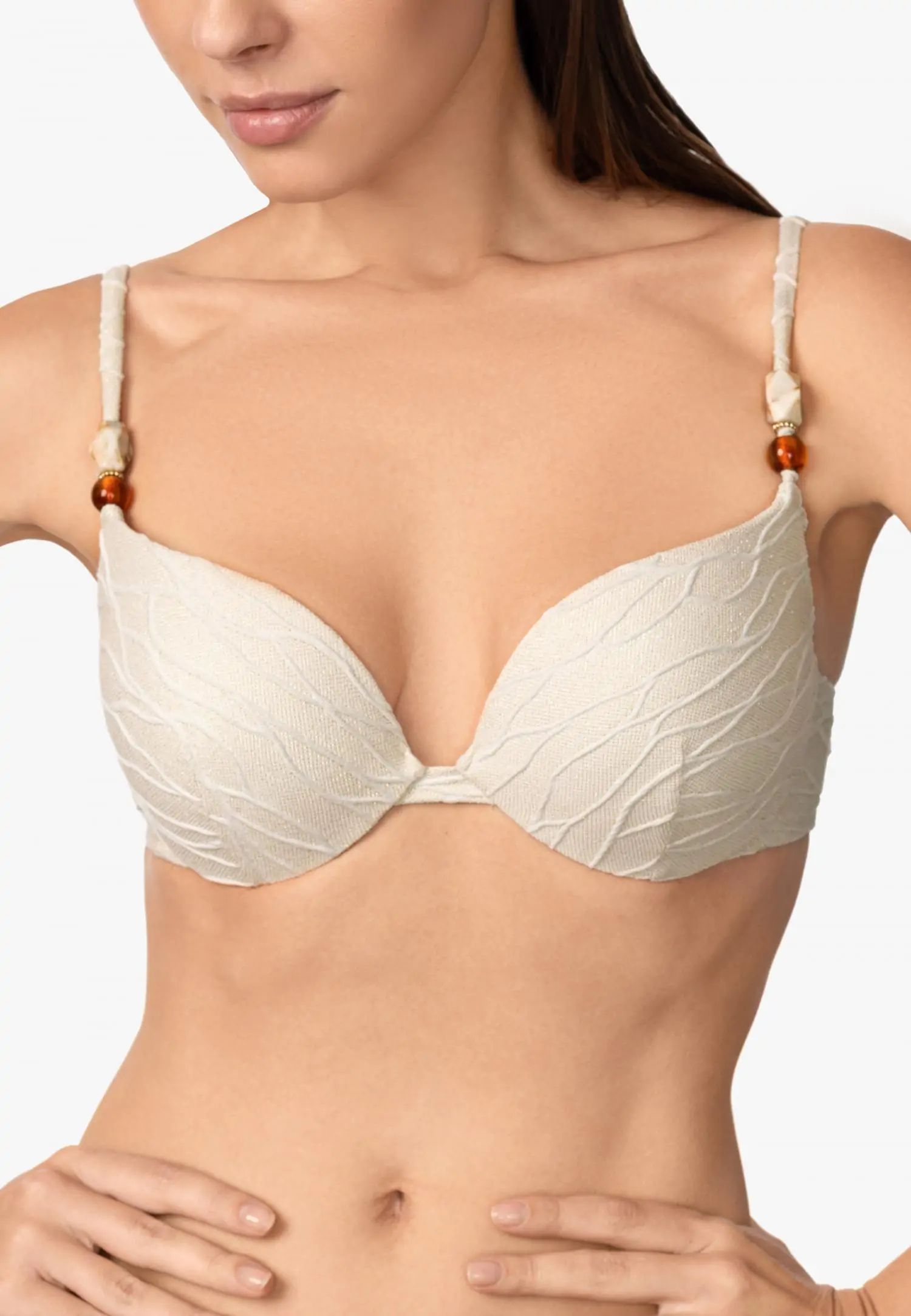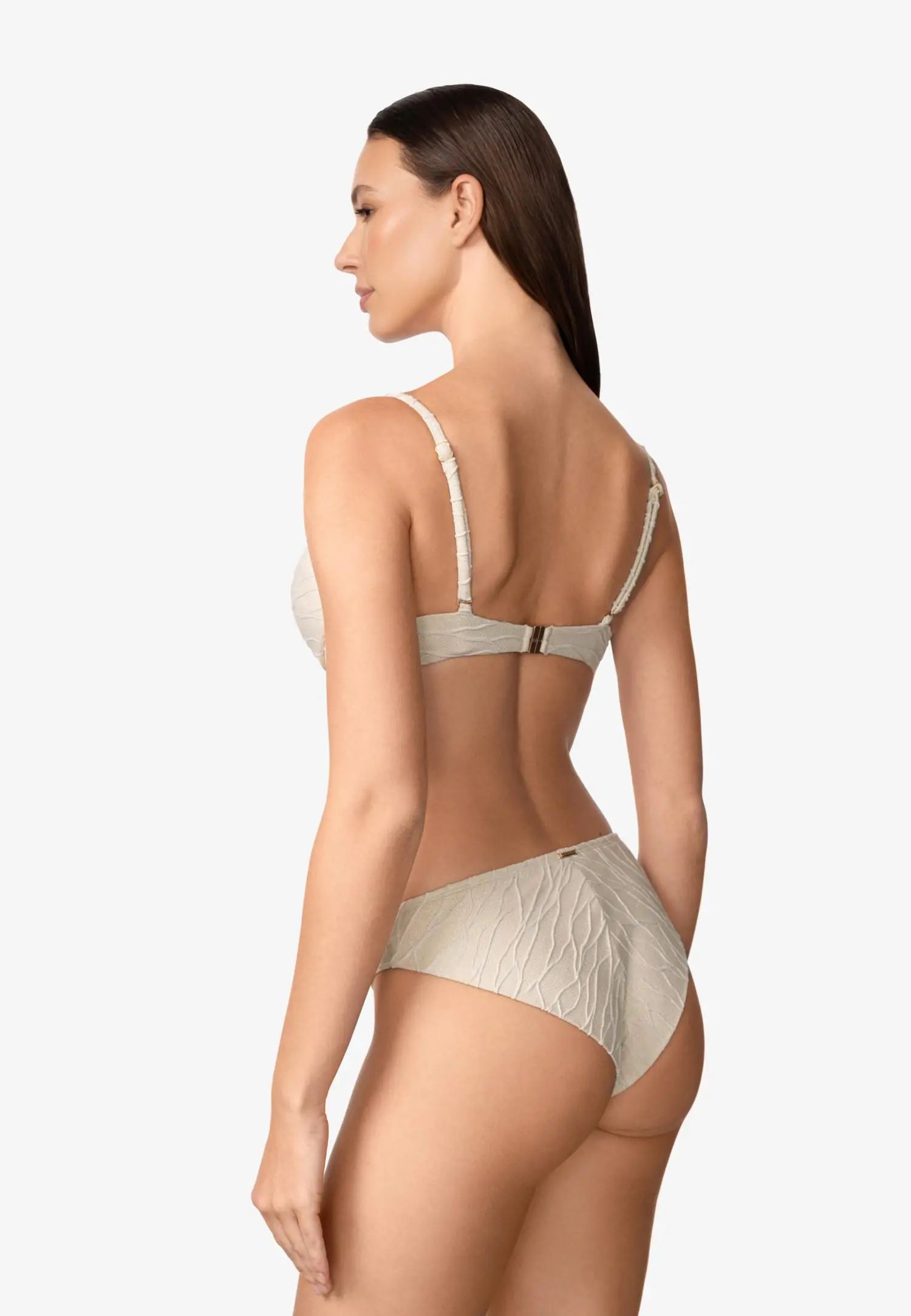 Горнище на бански с формовани чашки и подвижни push-up подплънки, които красиво подчертават деколтето и предлагат стабилна опора. Класическата кройка с регулируеми презрамки осигурява удобно прилягане и е подходяща за различни типове тяло. Серията BABYLON пленява с италианска жакардова материя, обогатена със златни лурексови нишки и релефна текстура. Деликатен, изискан блясък придава на всеки модел луксозен и изискан вид, внимателно подбраните детайли допълват цялото. Това е колекция, в която се срещат елегантност и майсторска изработка. Продуктът е проектиран и разработен в Естония.