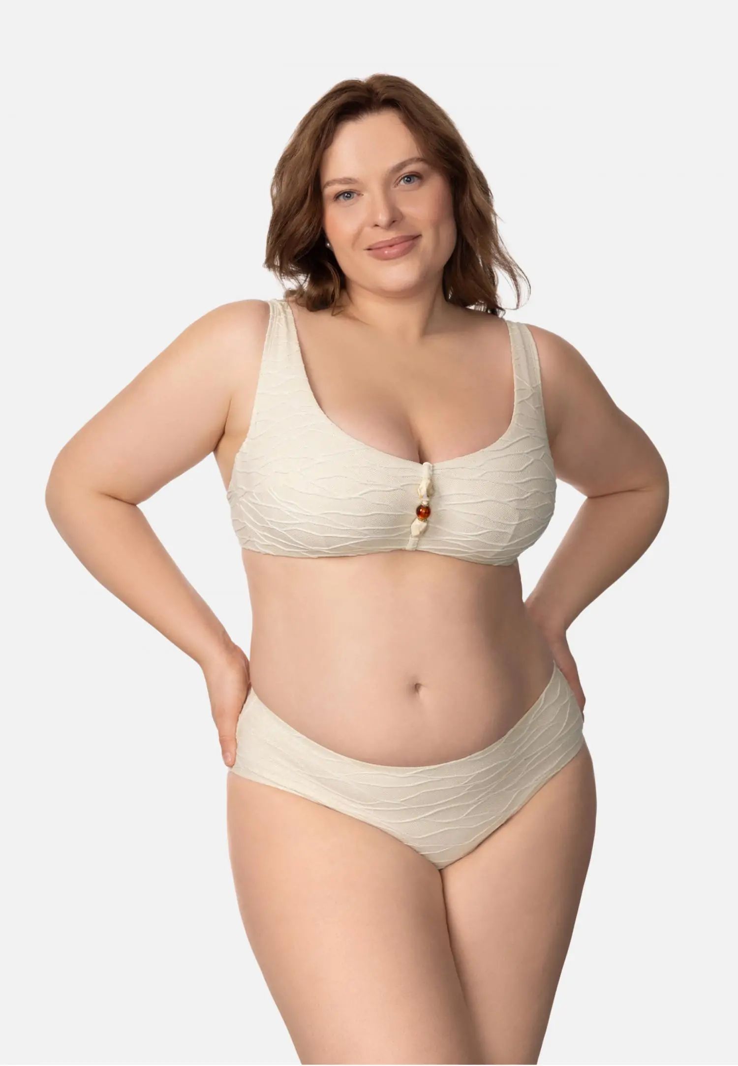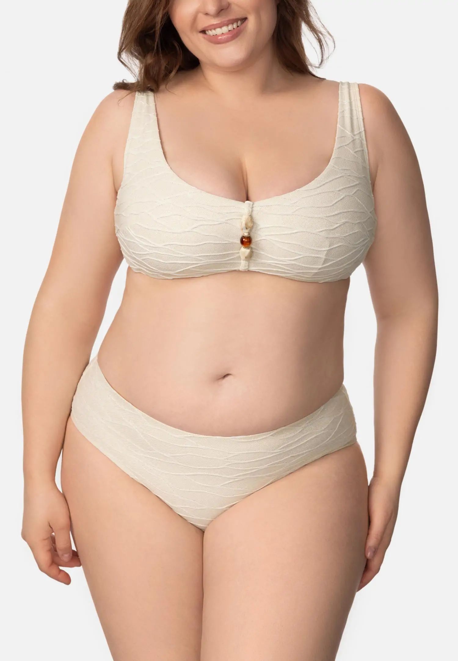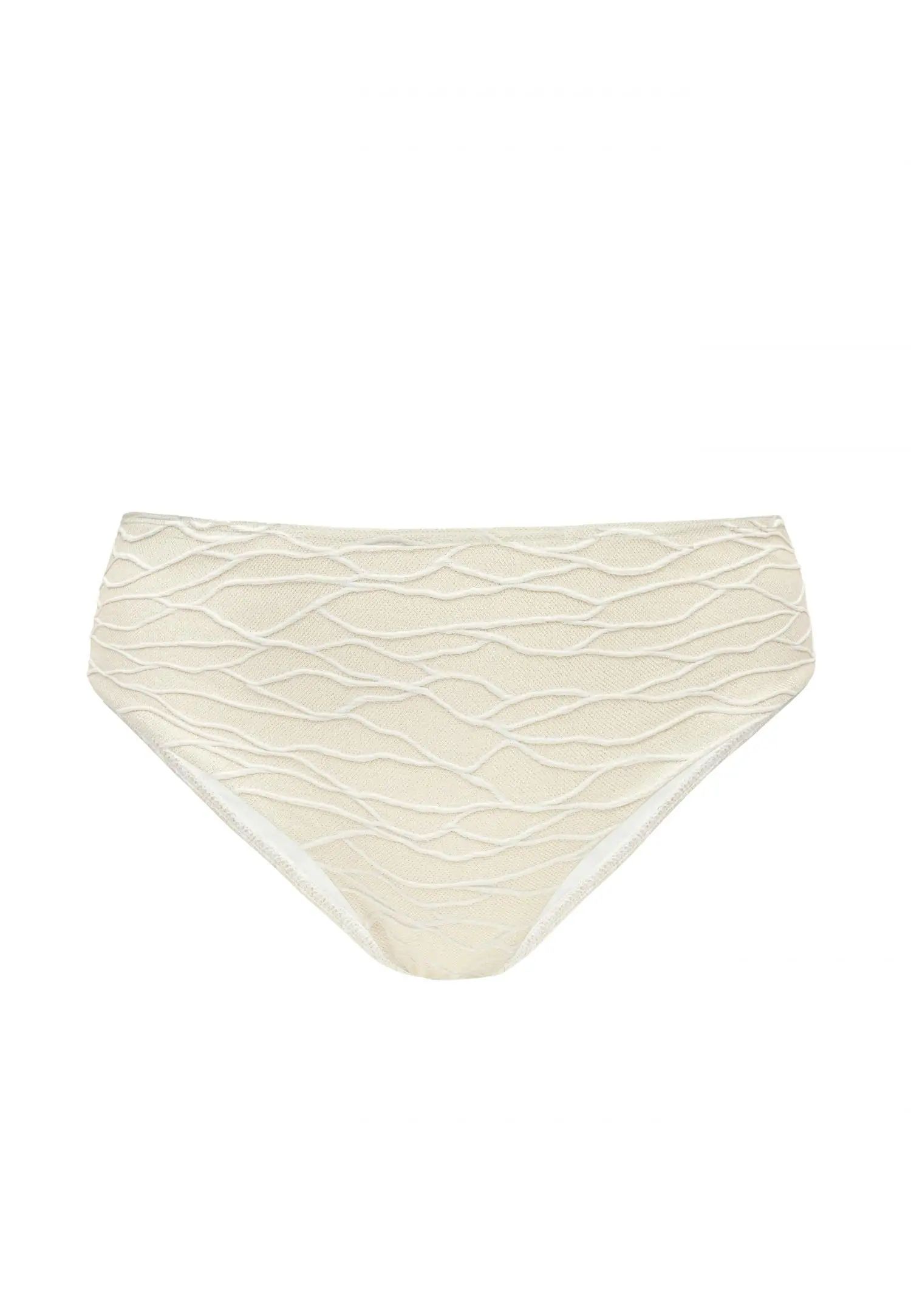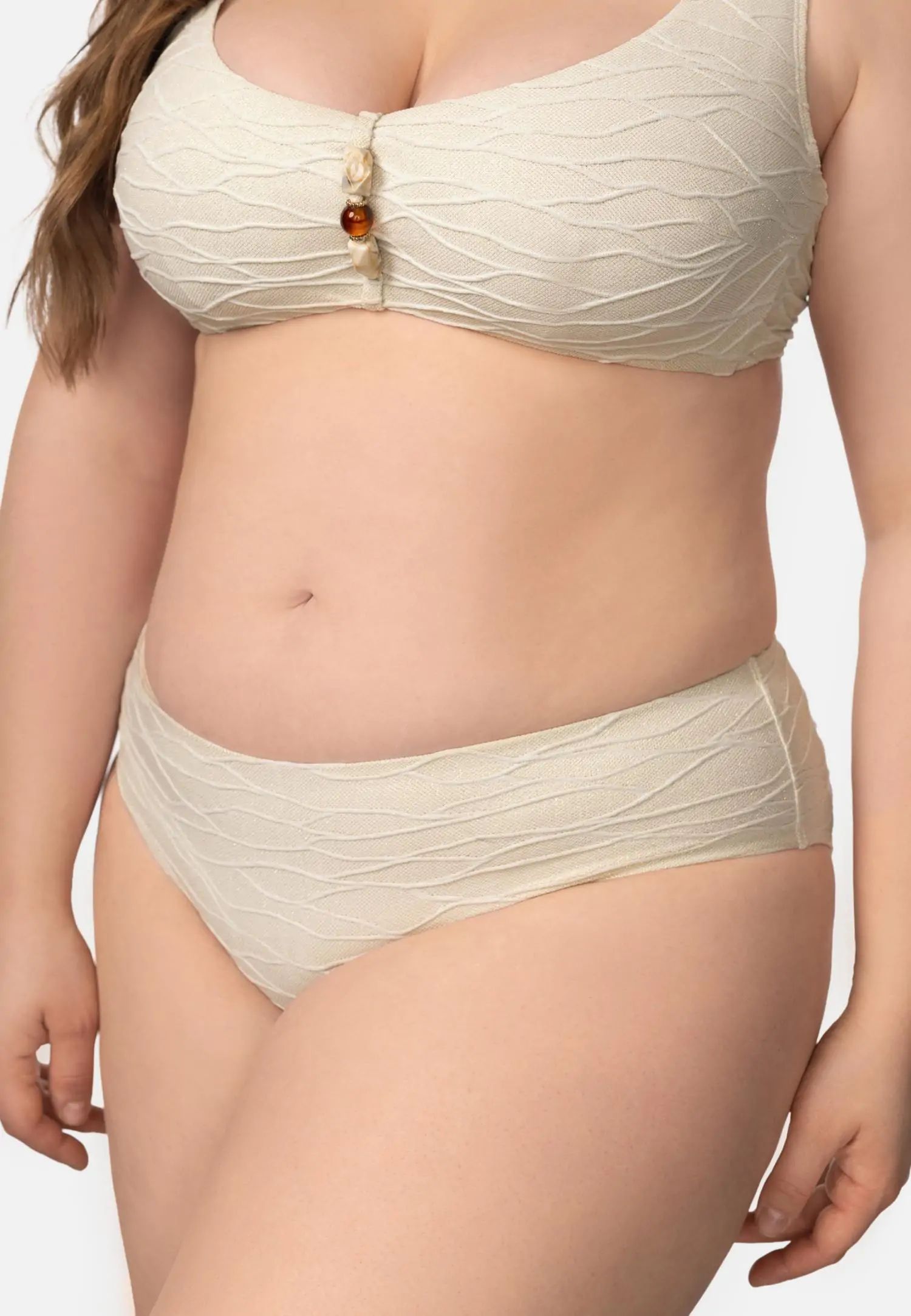 Долнище на бански със средна талия, отвор в долната част на крачола и по-голямо покритие отзад създават удобен и вечен силует. Хастарът както отпред, така и отзад добавя комфорт и усещане за сигурност. Серията BABYLON пленява с италианска жакардова материя, обогатена със златни лурексови нишки и релефна текстура. Деликатен, изискан блясък придава на всеки модел луксозен и изискан вид, а внимателно подбраните детайли допълват цялото. Това е колекция, в която се срещат елегантност и майсторско майсторство. Продуктът е проектиран и разработен в Естония.