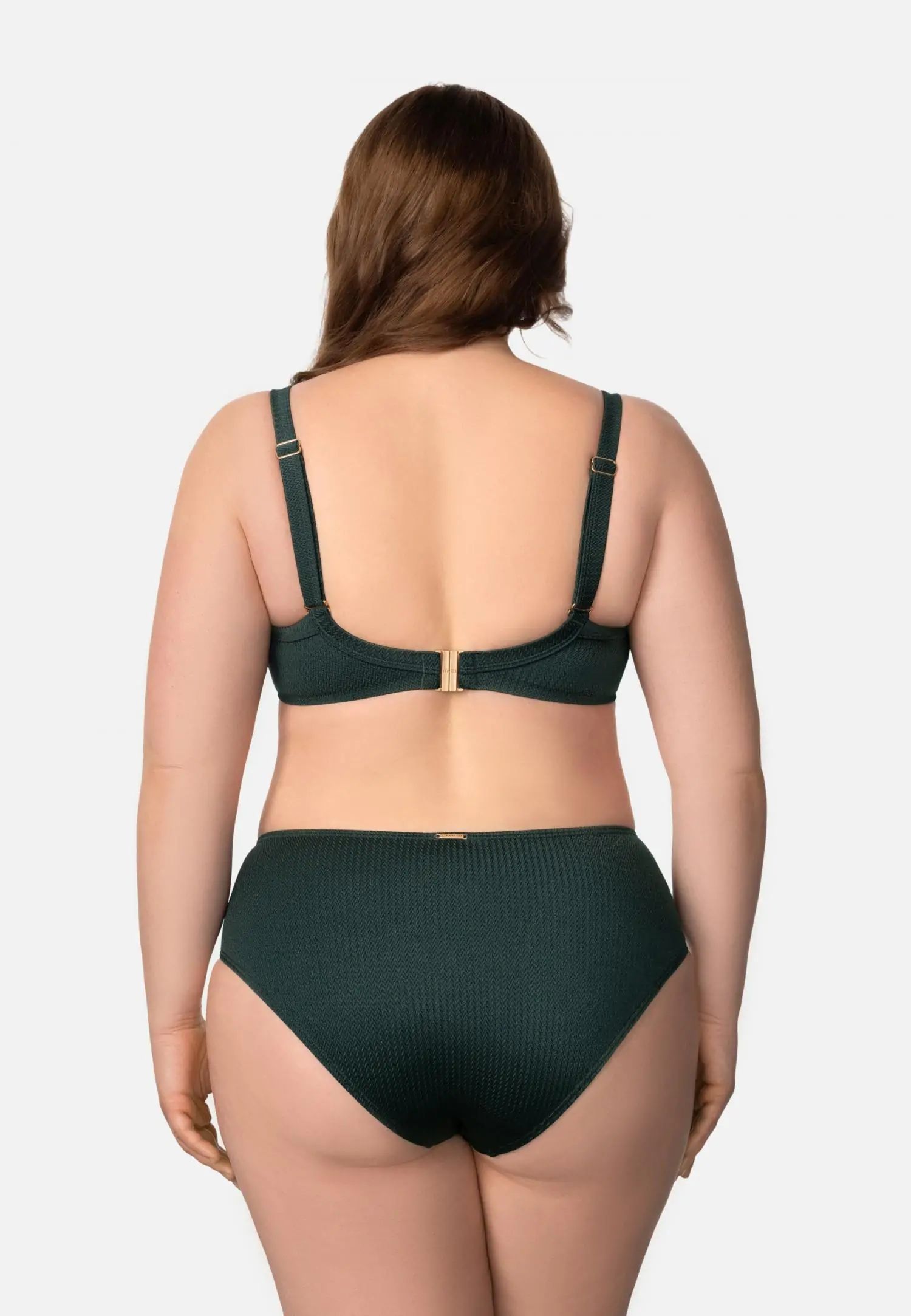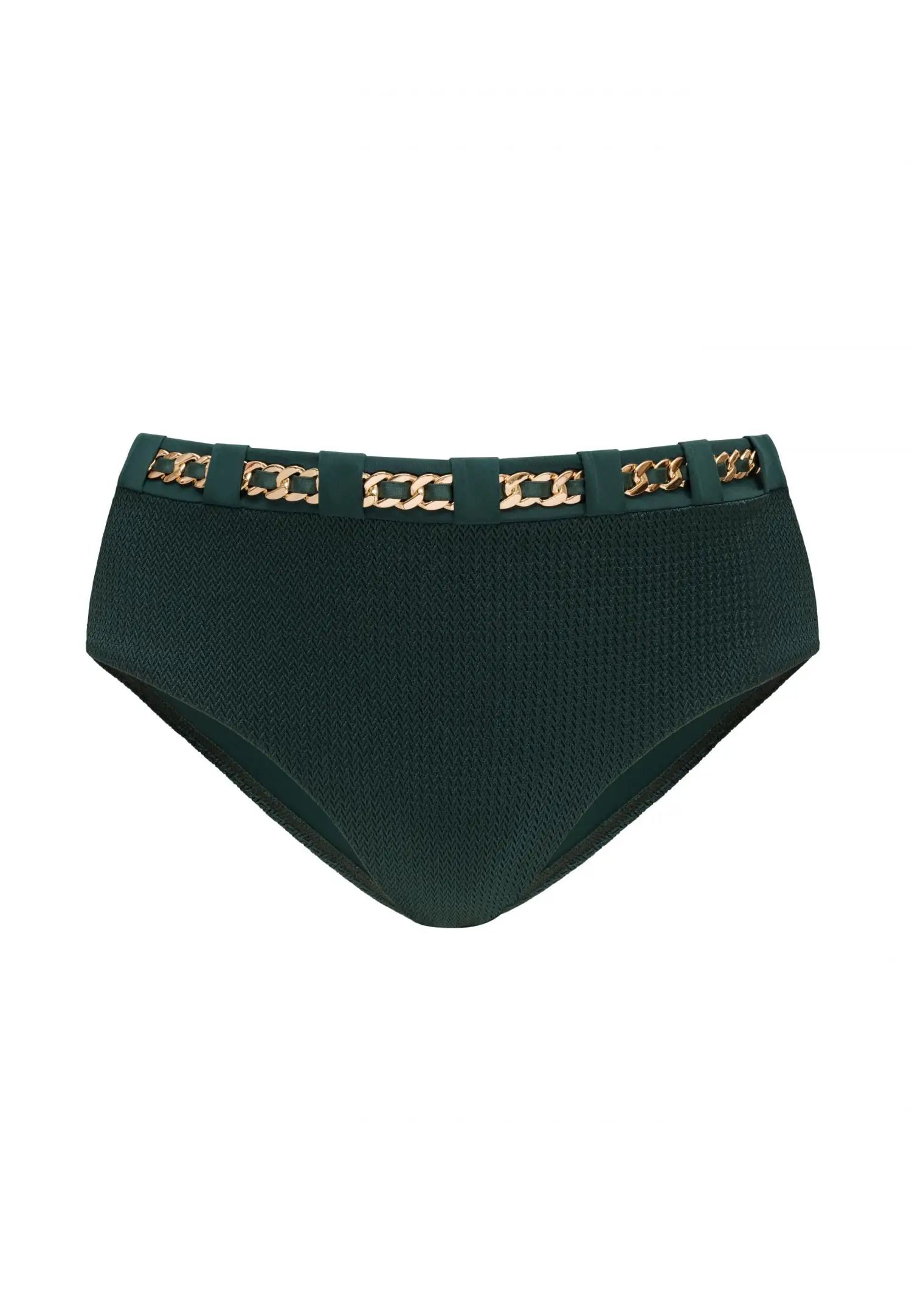Долнище на бански със средна талия, отвор в долната част на крачола и по-голямо покритие отзад създават удобен и вечен силует. Подплатата отпред и отзад добавя комфорт и усещане за сигурност. Подвижен аксесоар с верижка. МОДЕРНАТА ЕЛЕГАНТНОСТ съчетава вечна елегантност с модерен характер. Наситено тъмнозелена жакардова материя с десен „рибена кост“ създава богата текстура, балансирана от лъскави детайли и подвижни декоративни верижки. Материалът, изработен от рециклиран полиамид, добавя съзнателно и модерно измерение към колекцията.