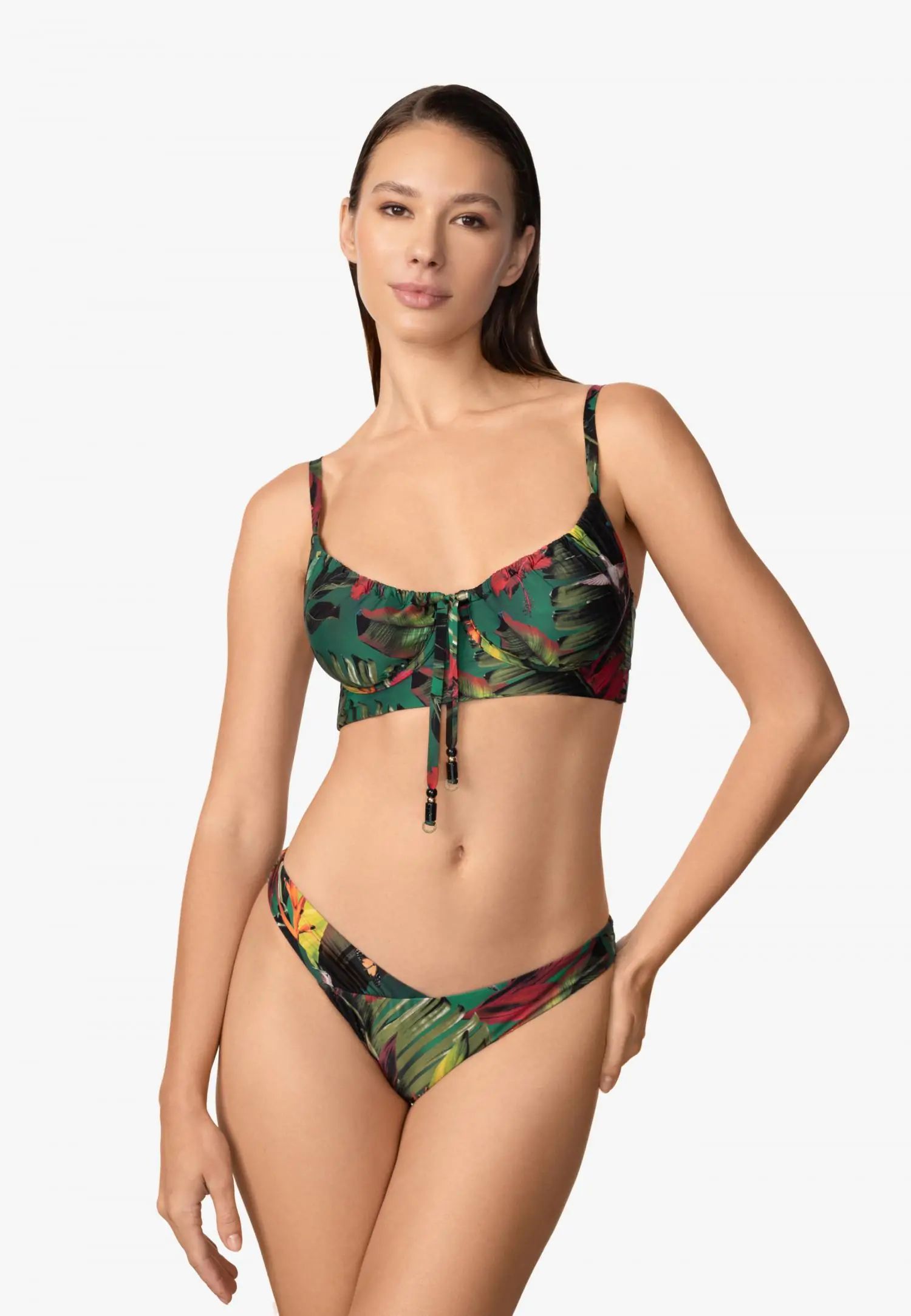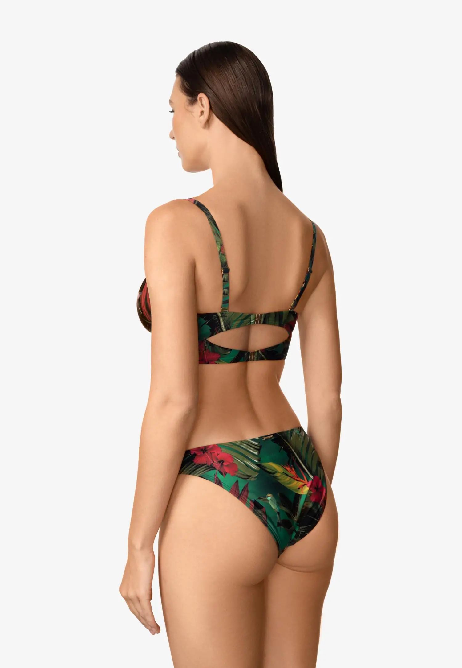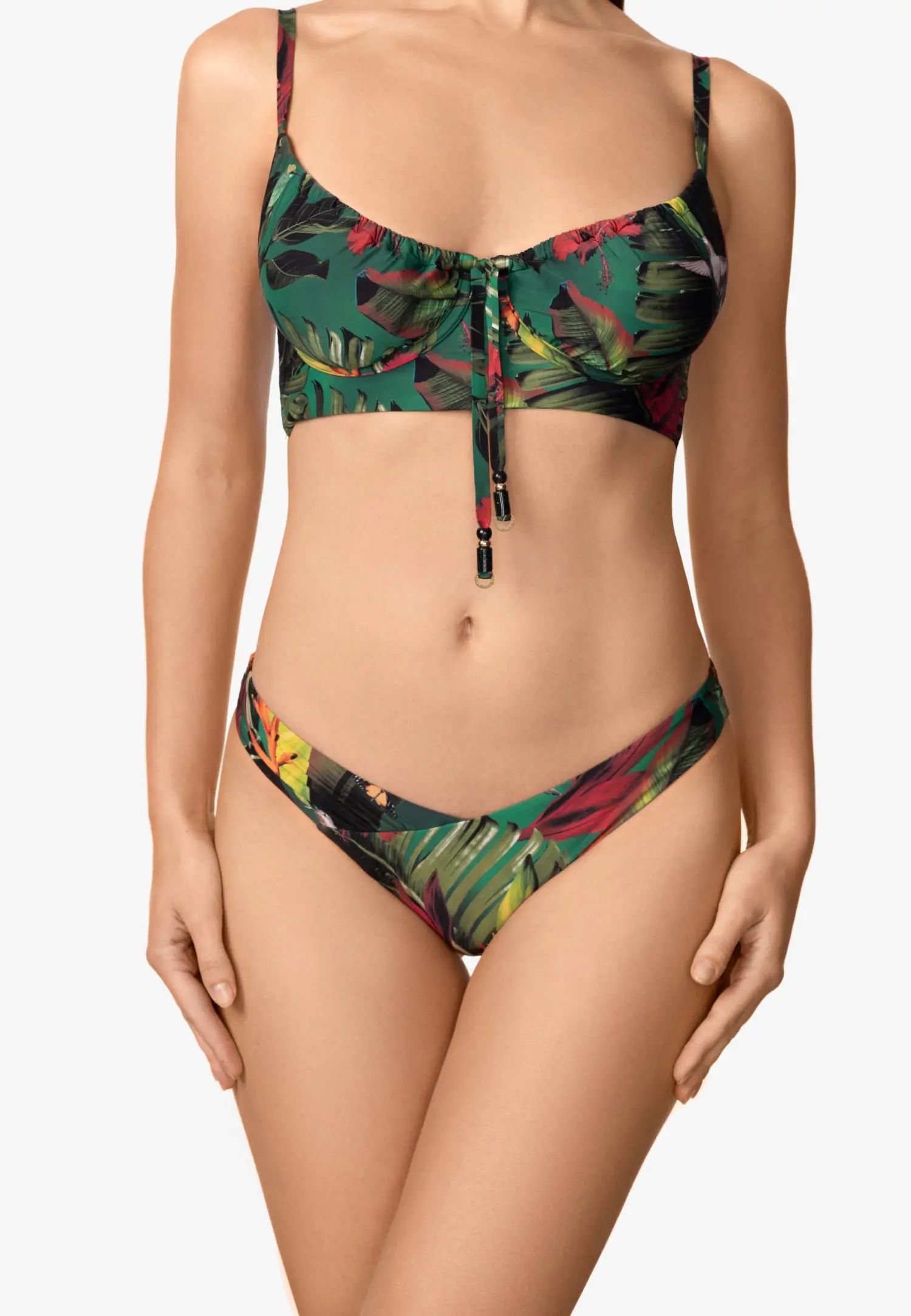 Долнище на бански с класическа кройка и по-ниска талия за вечен и удобен силует. Хастарът отпред и отзад осигурява сигурно и удобно прилягане. Серията WILD RHYTHM е пълна с цвят и енергия. Пищни тропически мотиви на наситено зелен фон създават ексклузивен принт, който няма да остане незабелязан. Платът LYCRA® осигурява красиво прилягане и удобно носене, създавайки смел и уверен плажен вид. Продуктът е проектиран и разработен в Естония.