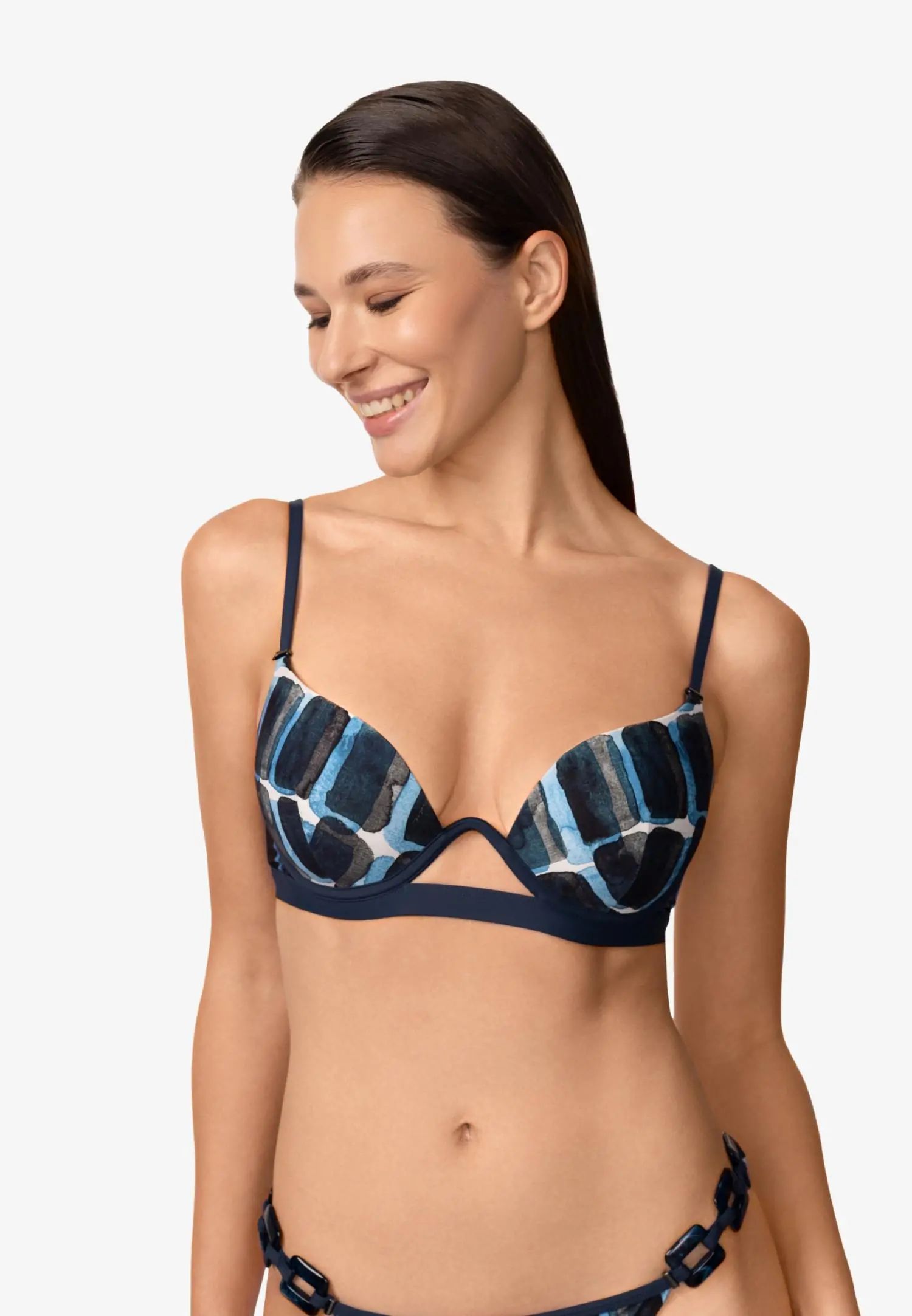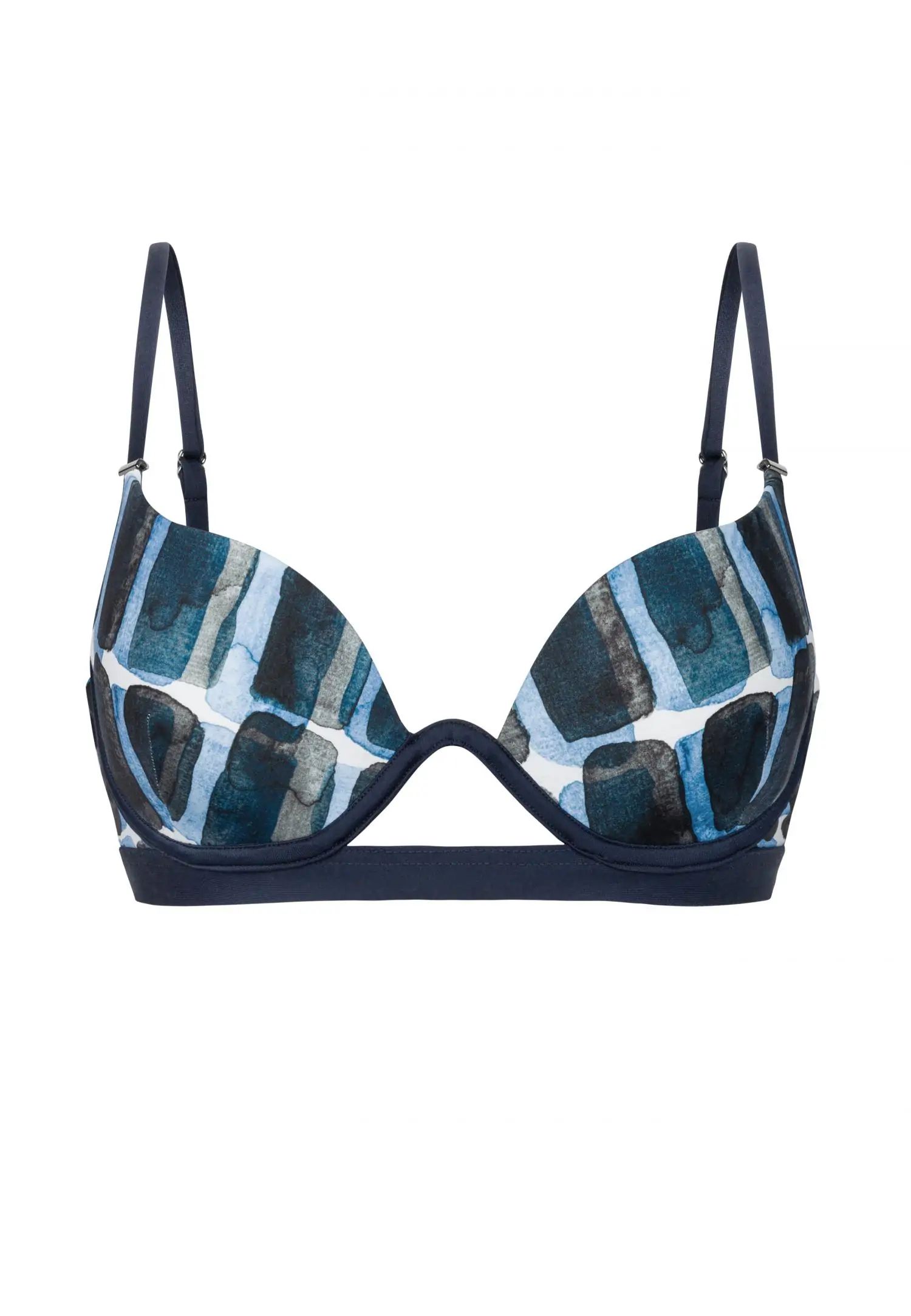 Оформено горнище бански с чашки и банели, с подвижни повдигащи се подплънки. Поддържащата монобанела е наистина модерна и създава секси триъгълен изрез. Регулируеми презрамки. Серията ELEVATED MIND подчертава ексклузивния акварелен принт на Marc & André, където нежните сини тонове създават ефирна и артистична цялост. Висококачественият принт подчертава дълбочината на шарката, а бързосъхнещата материя с високо съдържание на еластан осигурява отлично прилягане. Продуктът е проектиран и разработен в Естония.