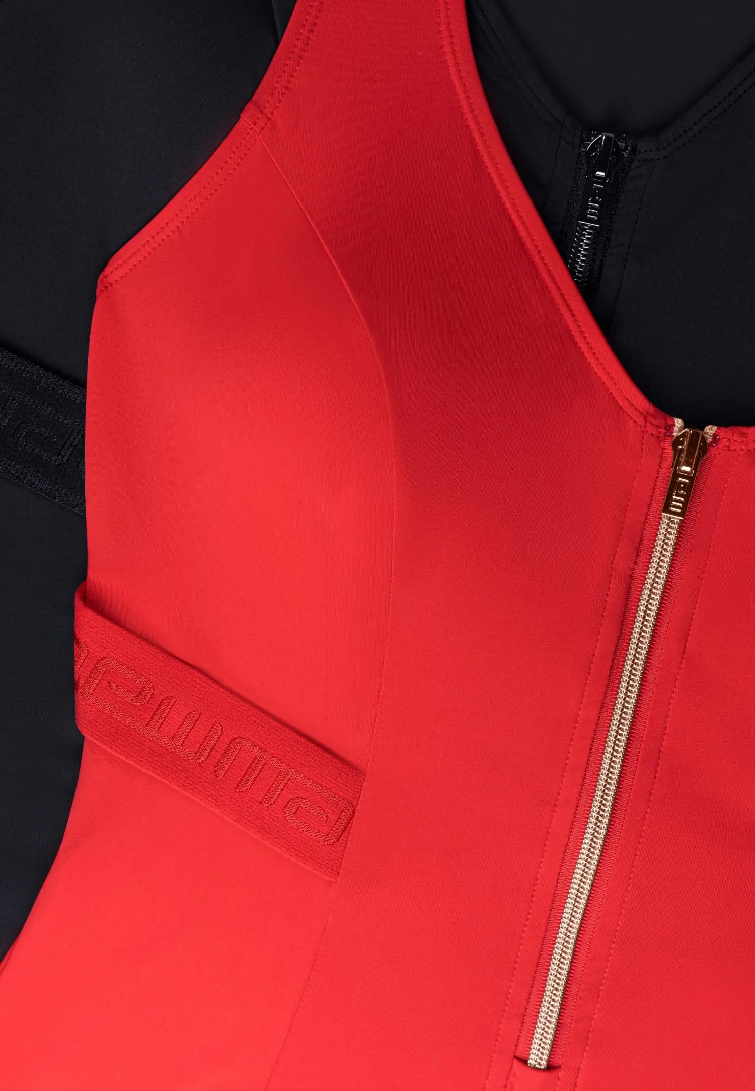 Меко изработено трико с оформяща мрежеста подплата отпред, която поддържа фигурата и създава гладък силует. Еластичната опора под бюста осигурява сигурно прилягане, а ципът в розово злато добавя модерен акцент. Мекият, подгънат подгъв предлага удобно и гладко носене. БАНСКИ КОСТЮМИ С ЦИП са вечна класика, която съчетава модерен дизайн и практична функционалност. Високотехнологичната материя е устойчива на UV лъчи, хлор и козметика, като запазва формата и кройката си сезон след сезон. Спортният силует и циповете създават уверен и динамичен плажен вид. Продуктът е проектиран и разработен в Естония.