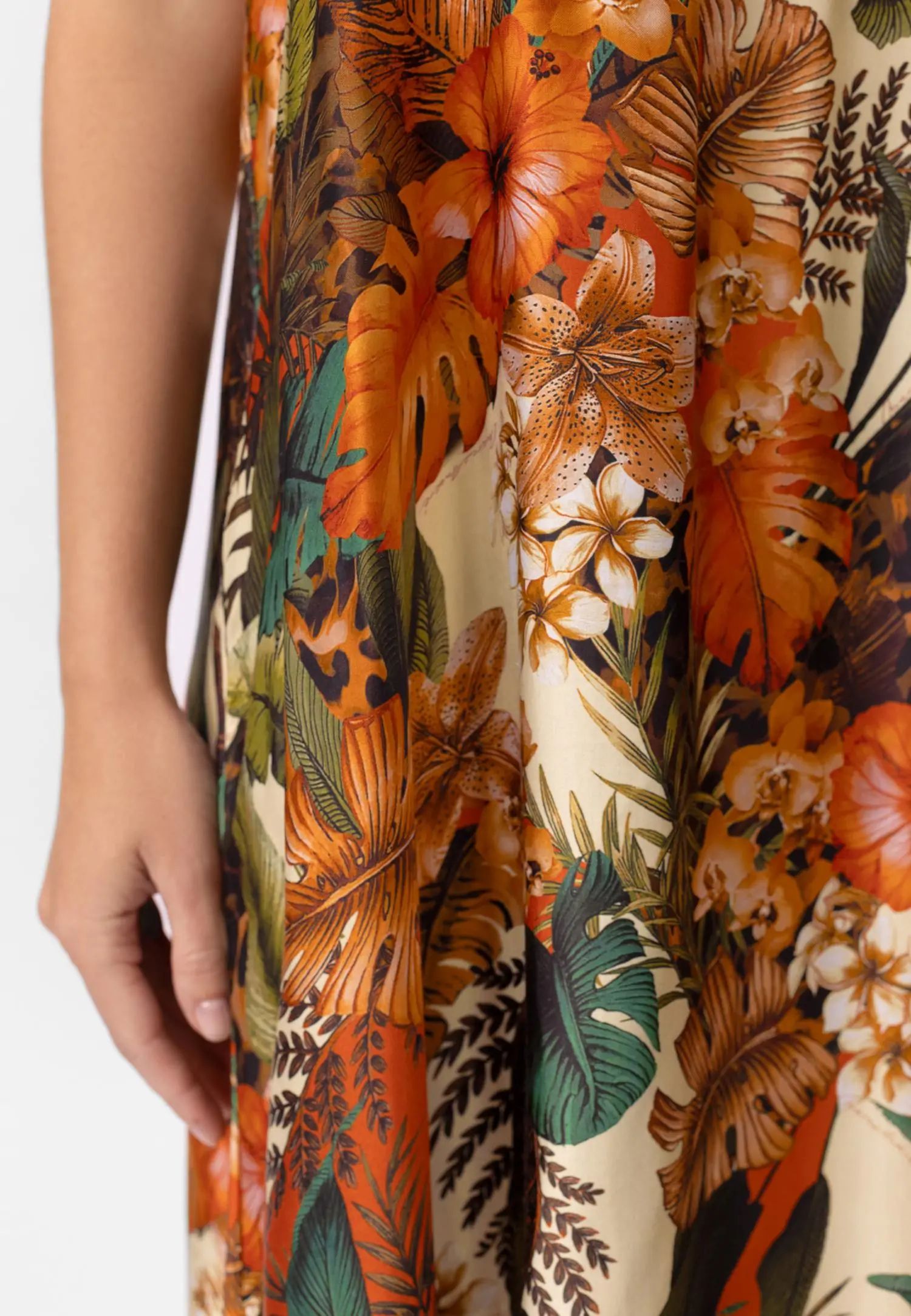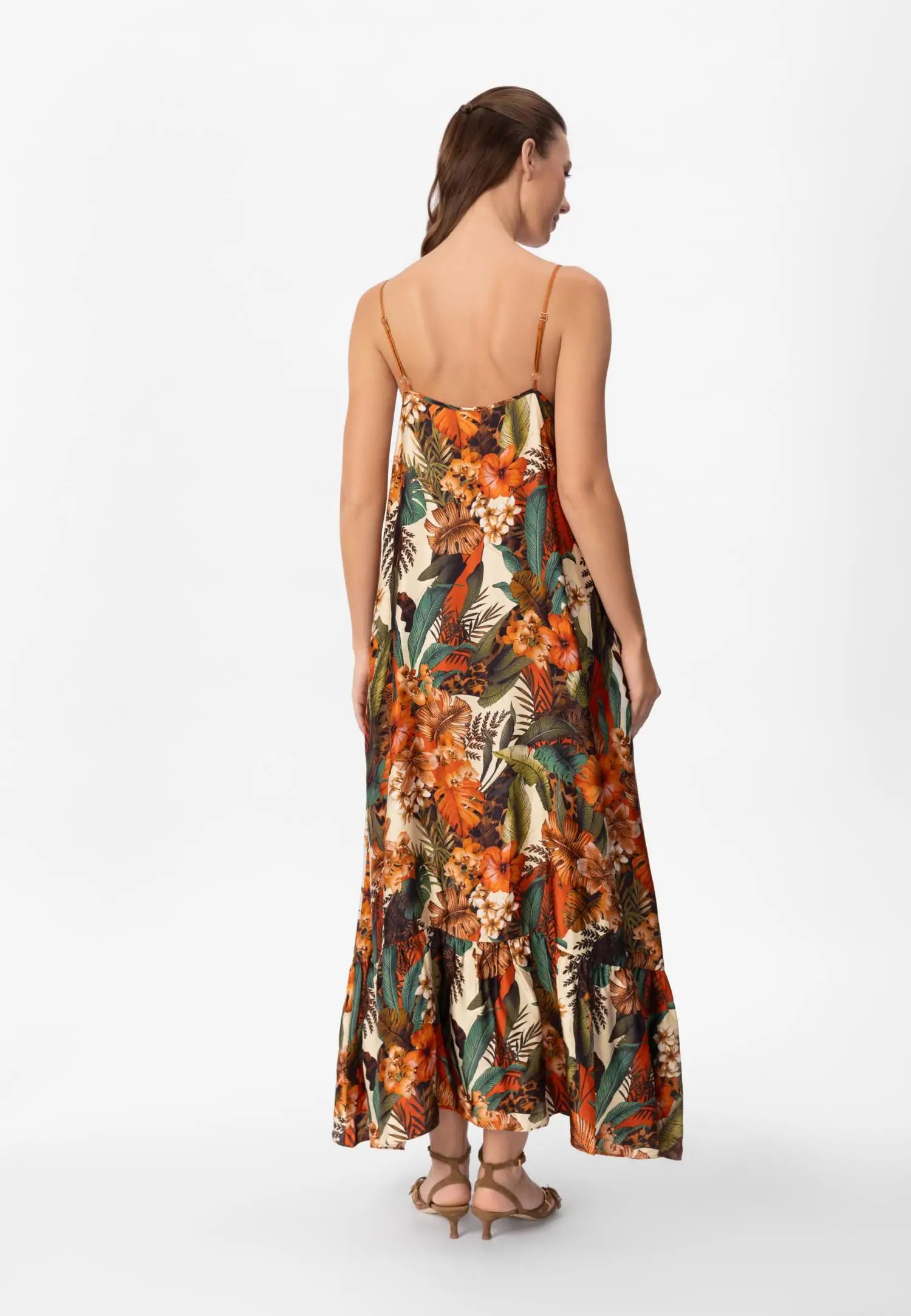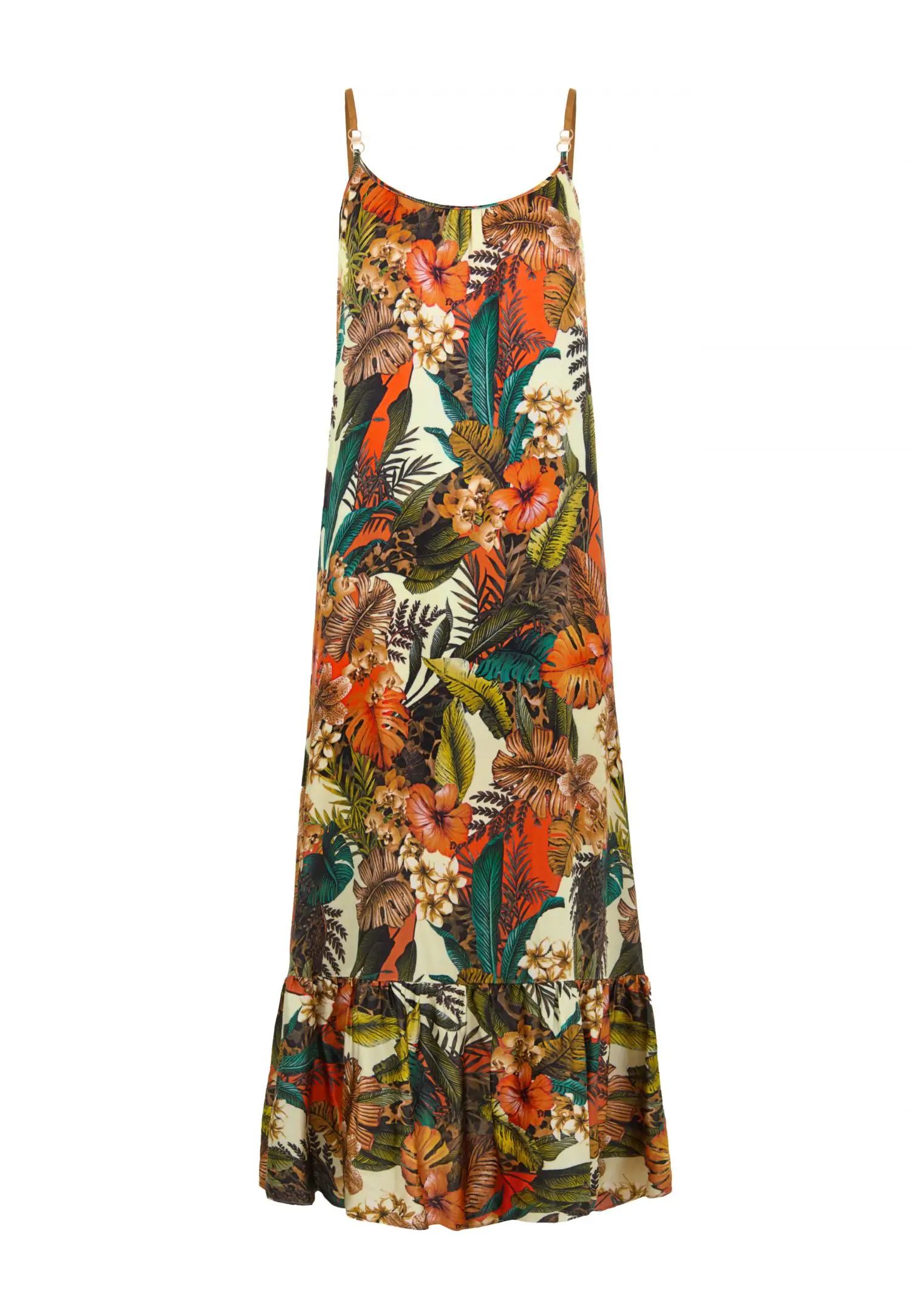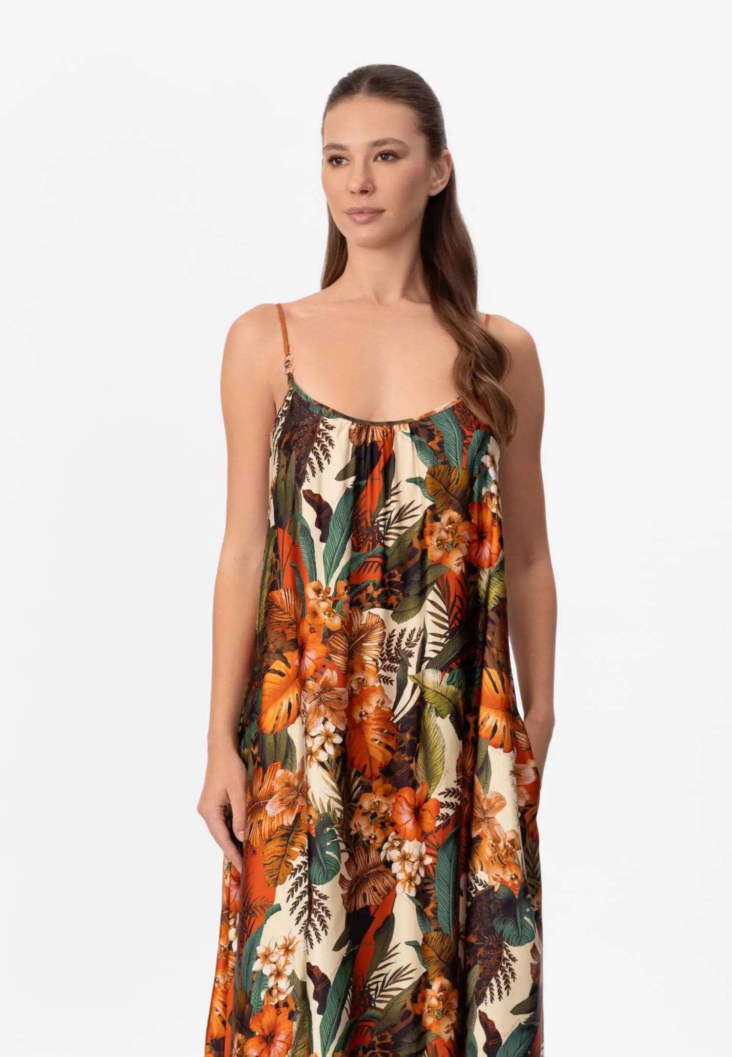 Красива рокля с макси дължина до пода и шарки, с практични джобове. Свободна и течаща кройка. Регулируеми презрамки. Серията ZEN GARDEN съчетава нежна романтика и смела игра на цветове. Моделът с мотиви на цветя и листа, създаден ексклузивно за Marc & André, съчетава наситено петролно синьо и коралови тонове в енергично и запомнящо се цяло. Това е колекция, която няма да остане незабелязана. Продуктът е проектиран и разработен в Естония.