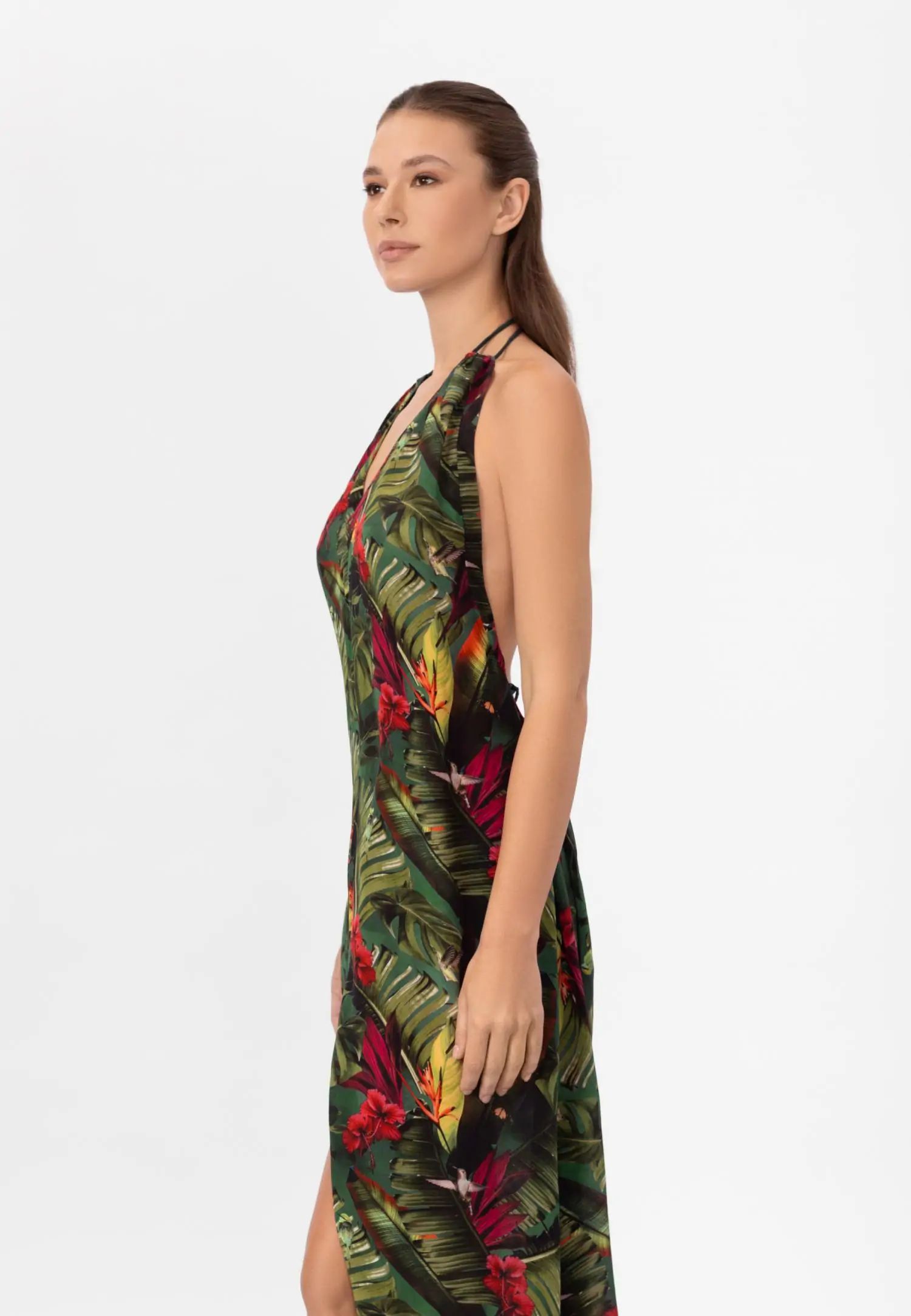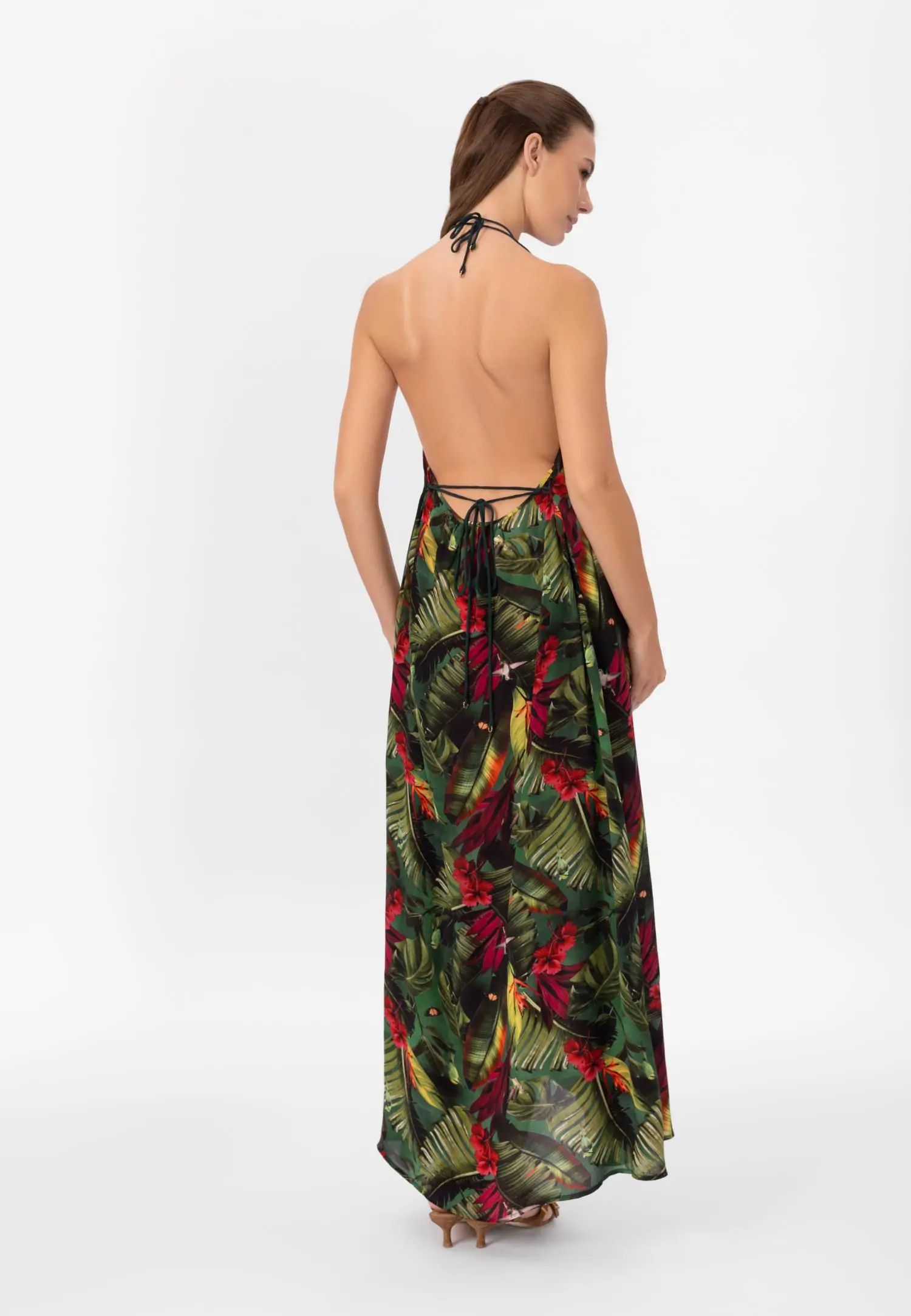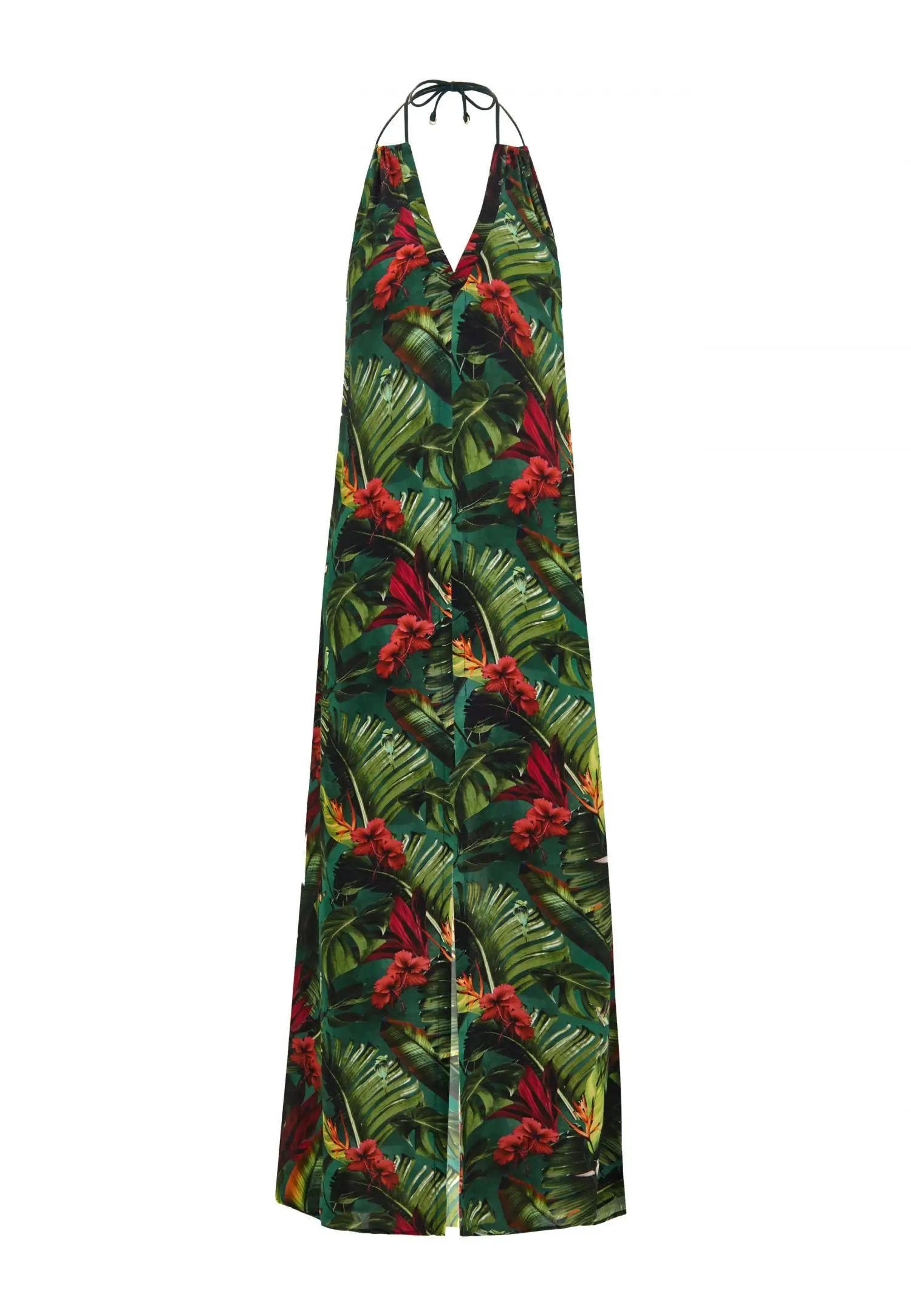 Дълга до пода макси рокля с отворен гръб и практични джобове. Серията WILD RHYTHM е пълна с цвят и енергия. Пищни тропически мотиви на наситено зелен фон създават ексклузивен, отличителен принт, който няма да остане незабелязан. Продуктът е проектиран и разработен в Естония.