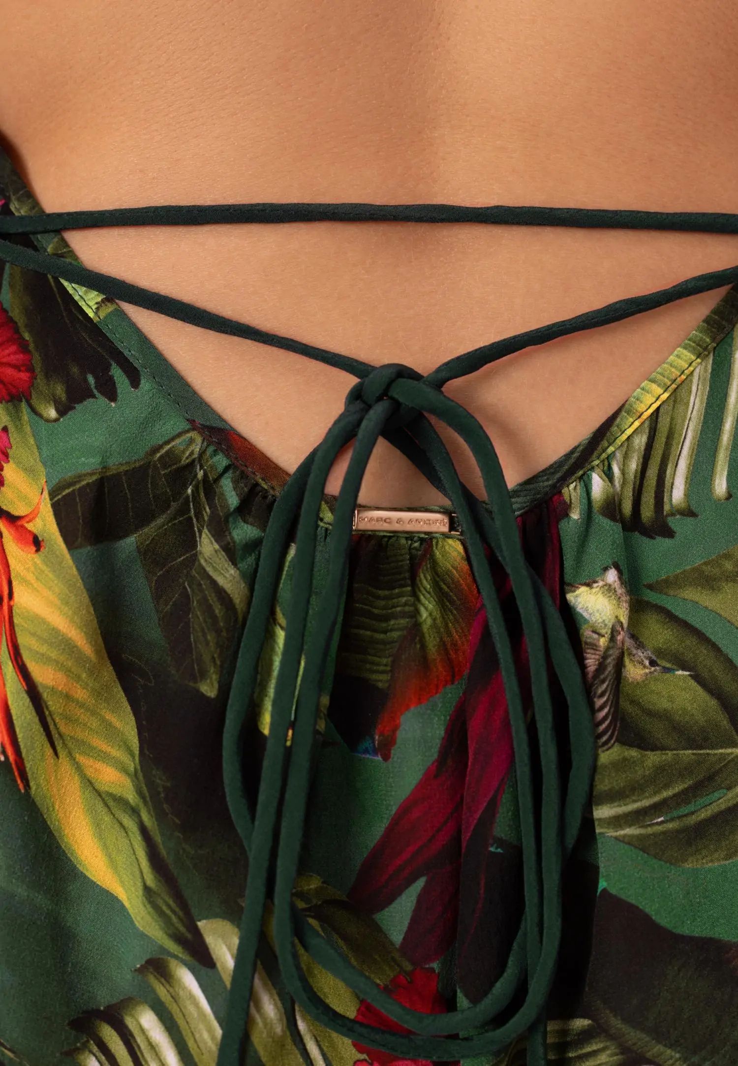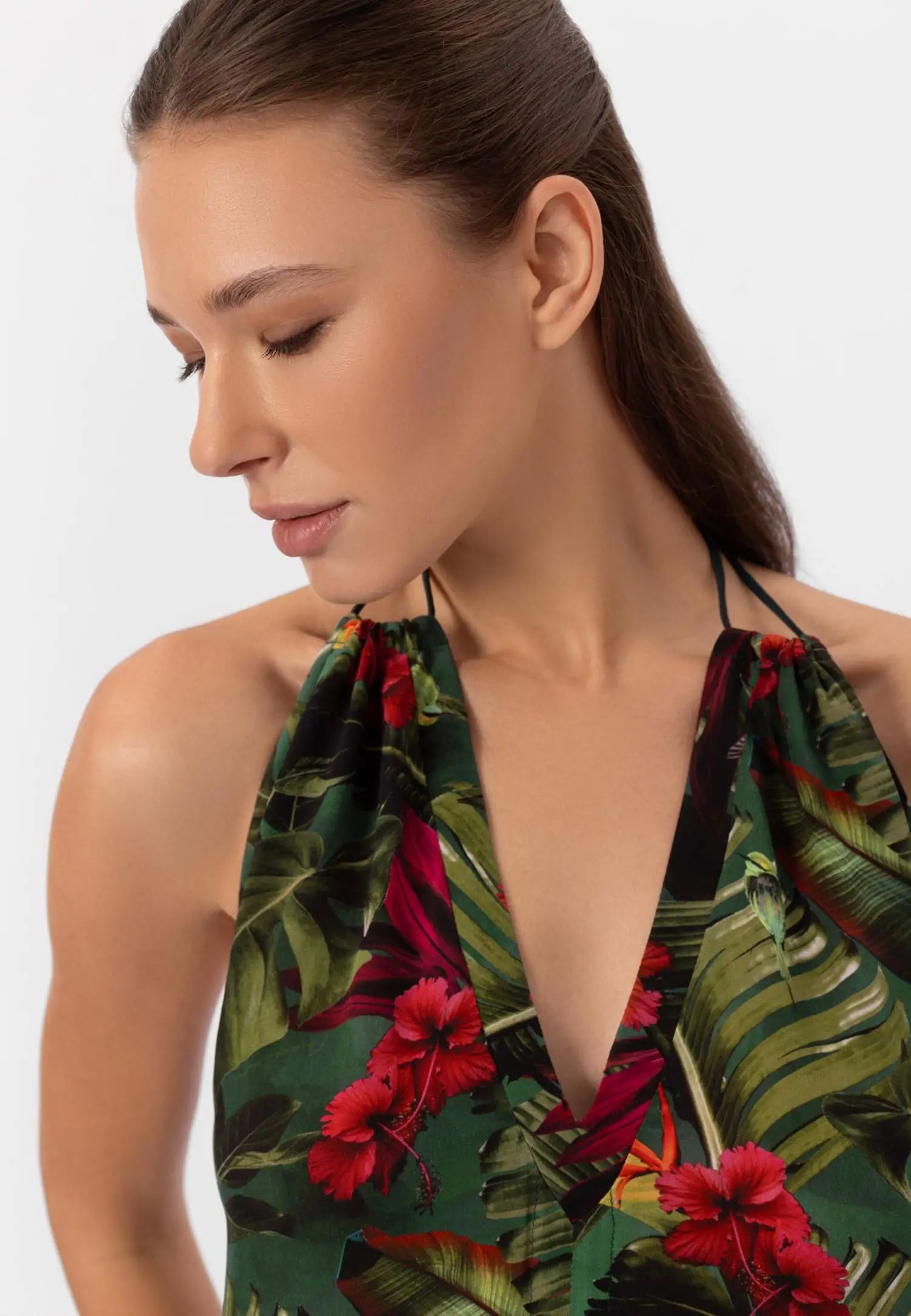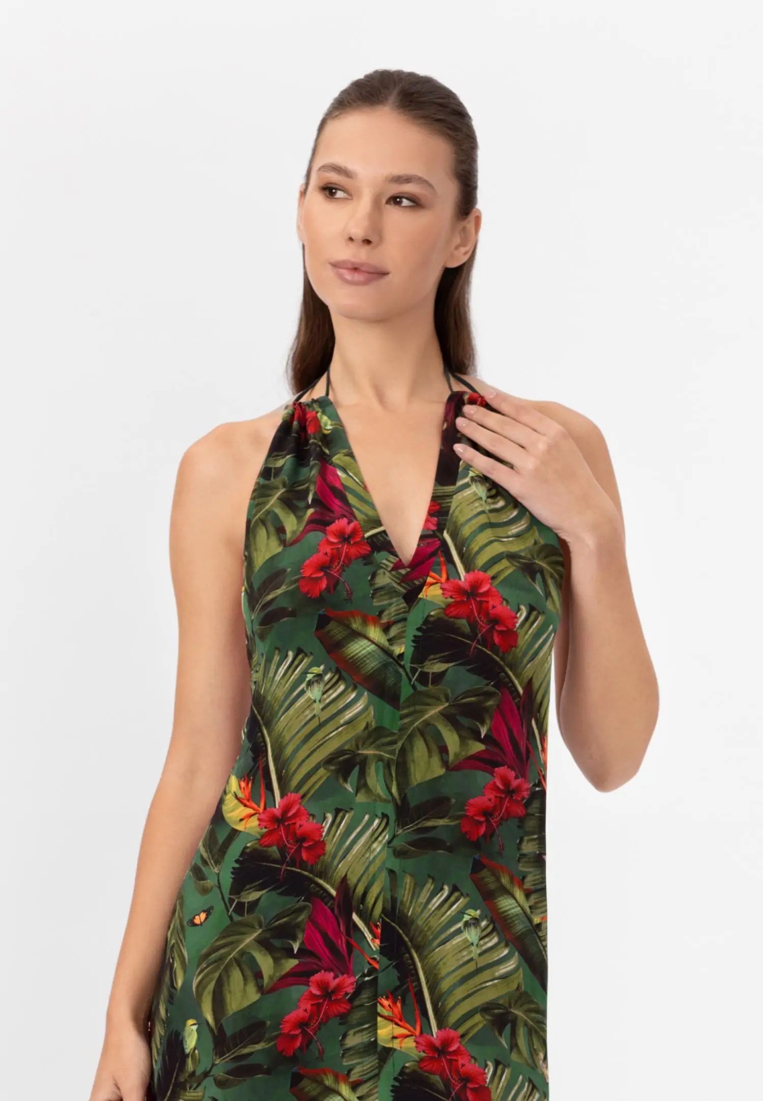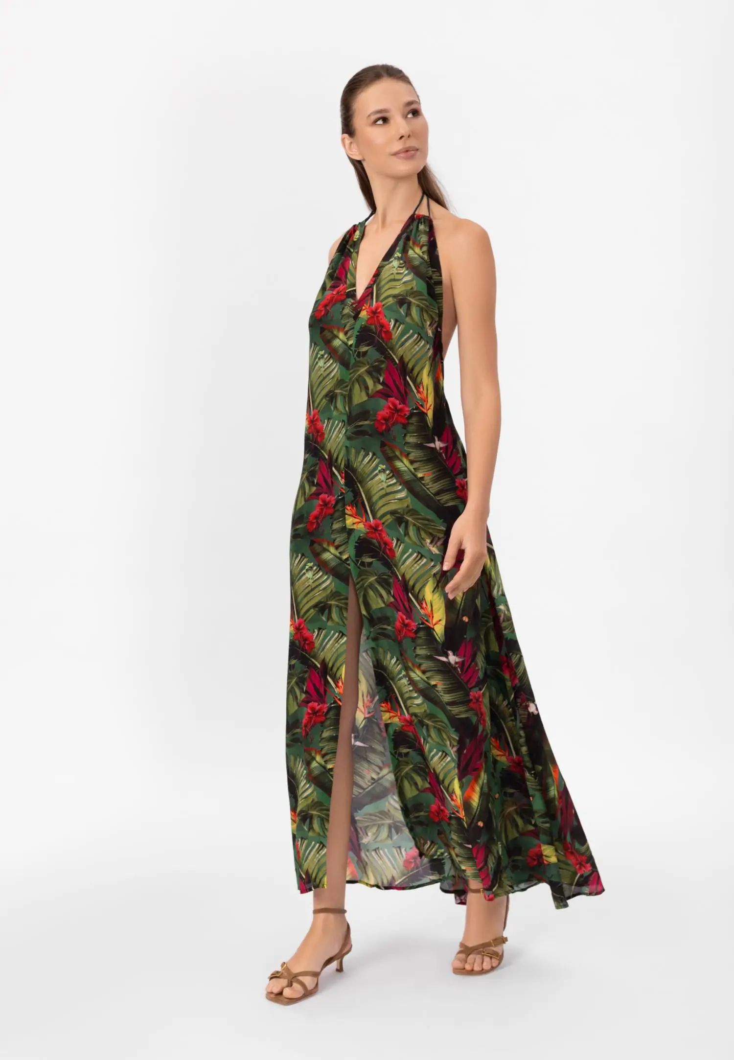 Дълга до пода макси рокля с отворен гръб и практични джобове. Серията WILD RHYTHM е пълна с цвят и енергия. Пищни тропически мотиви на наситено зелен фон създават ексклузивен, отличителен принт, който няма да остане незабелязан. Продуктът е проектиран и разработен в Естония.