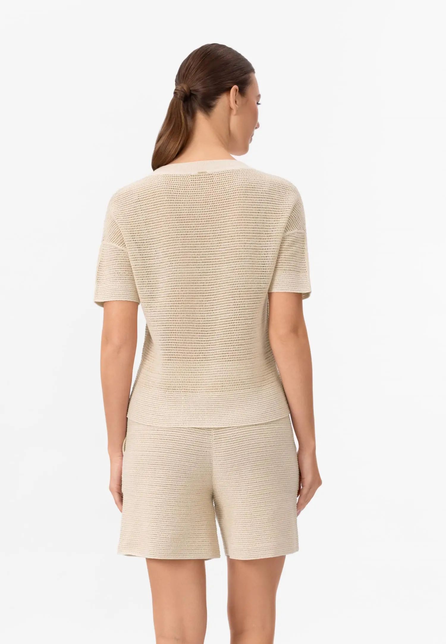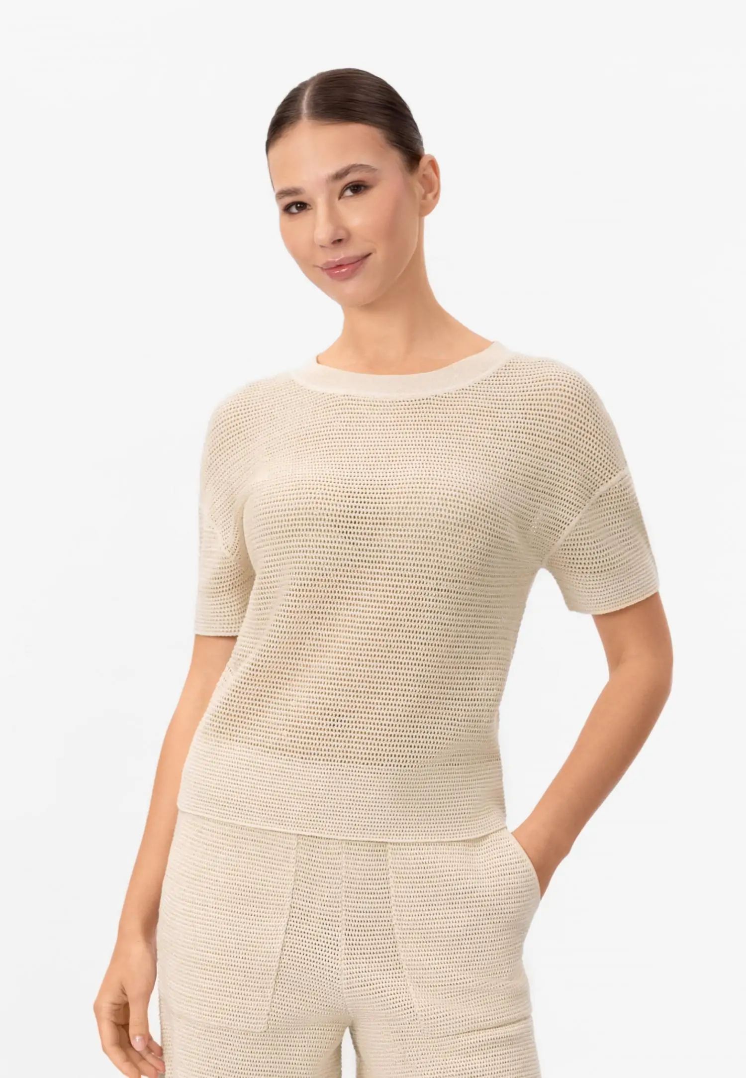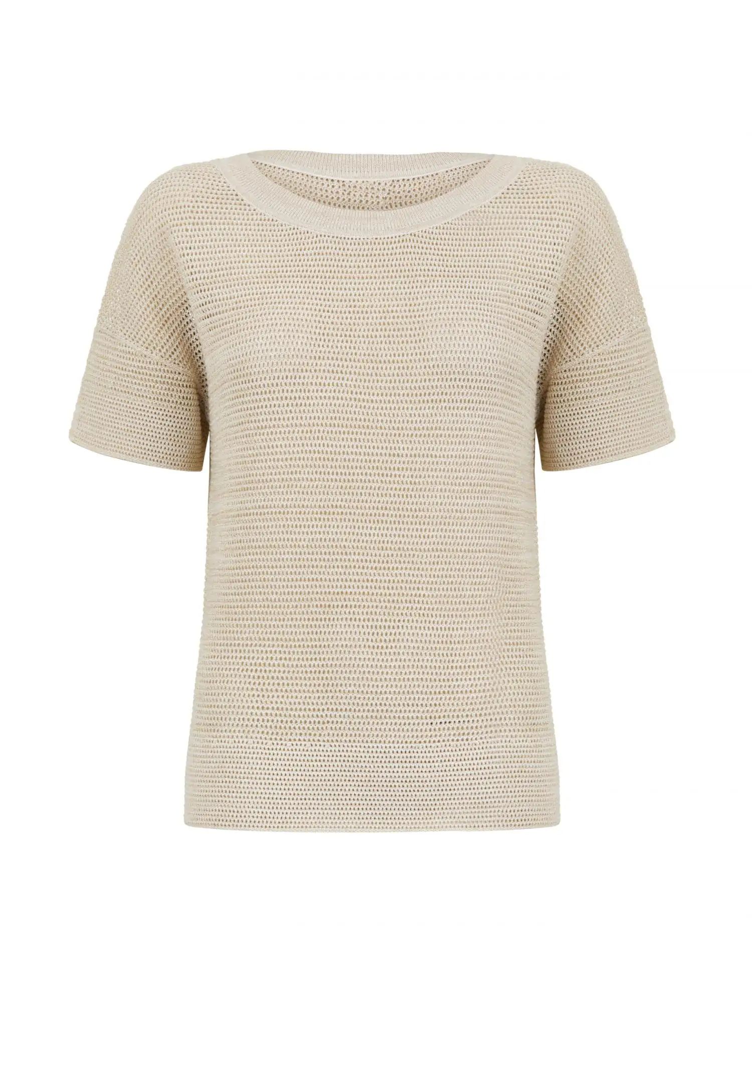 Плетена блуза с кръгло деколте и къс ръкав. POETIC DREAMS съчетава мекия лукс на памука и коприната с нежния блясък на ултрафина лурексова нишка. Леката и ефирна прежда е изплетена в модерна имитация на плетене на една кука, която изглежда едновременно модерна и вечна. Продуктът е проектиран и разработен в Естония.