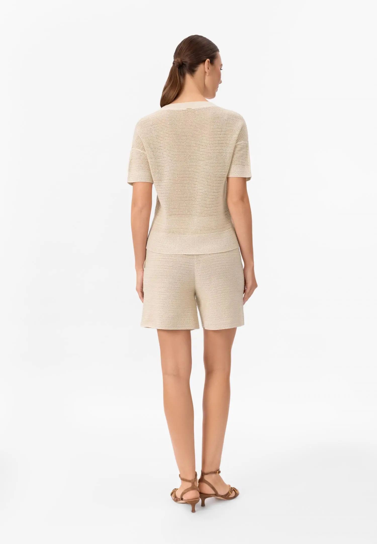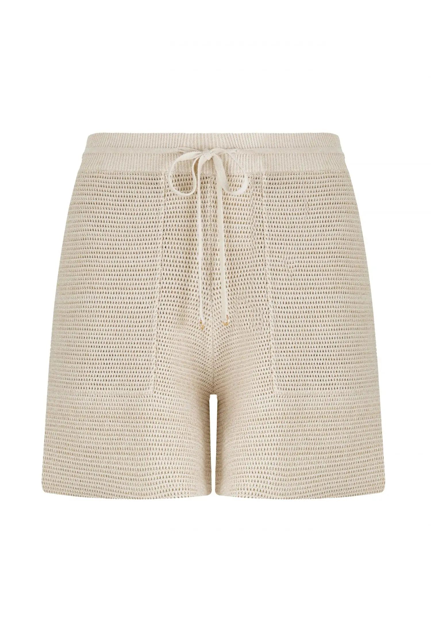 Широко прилепнали плетени шорти с еластична талия и регулируеми връзки. Комфортната дължина прави този модел идеален избор за летните дни. POETIC DREAMS съчетава мекия лукс на памука и коприната с нежния блясък на ултрафината лурексова нишка. Леката и ефирна прежда е изплетена в модерна имитация на плетене на една кука, която изглежда едновременно модерна и вечна. Продуктът е проектиран и разработен в Естония.
