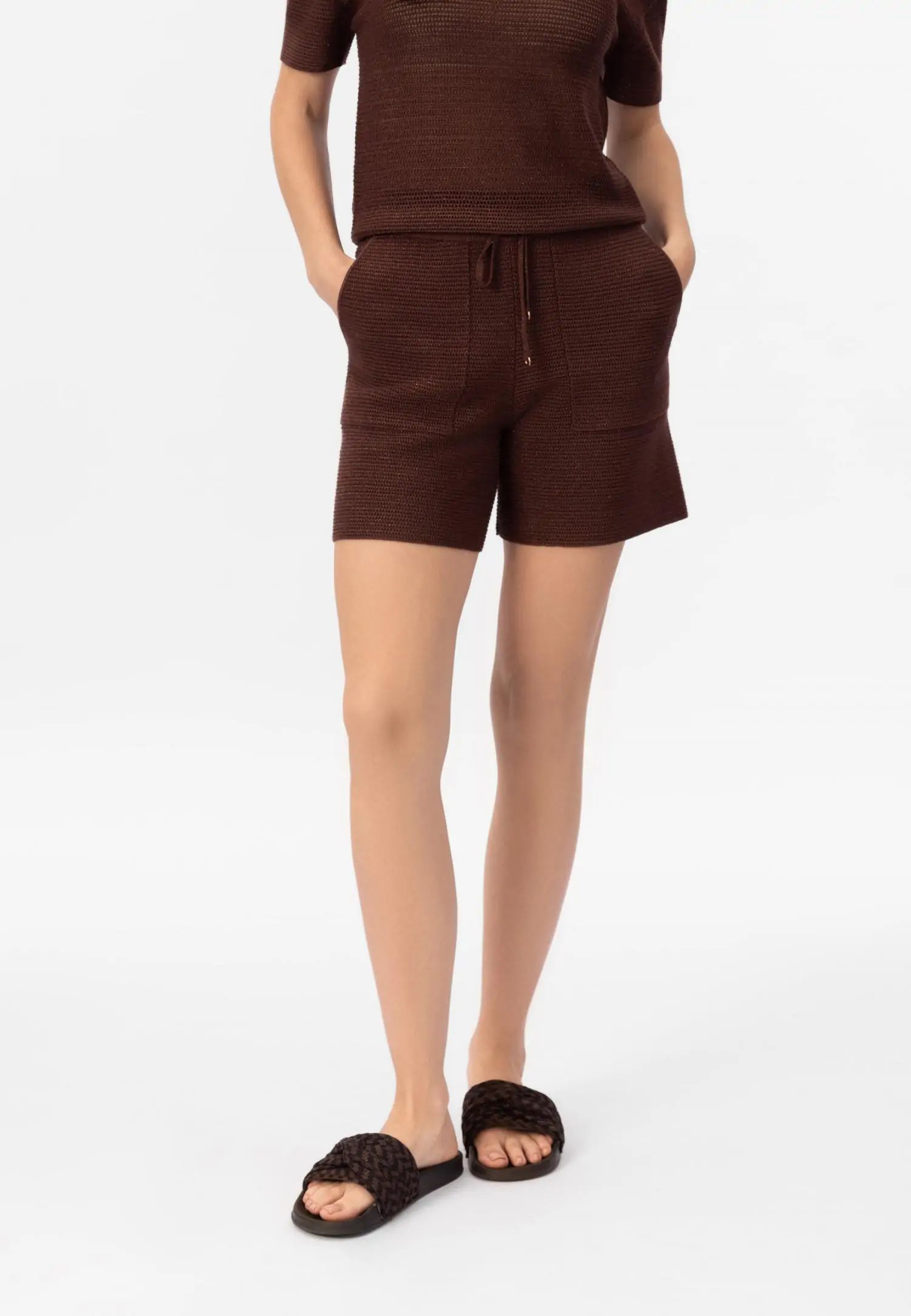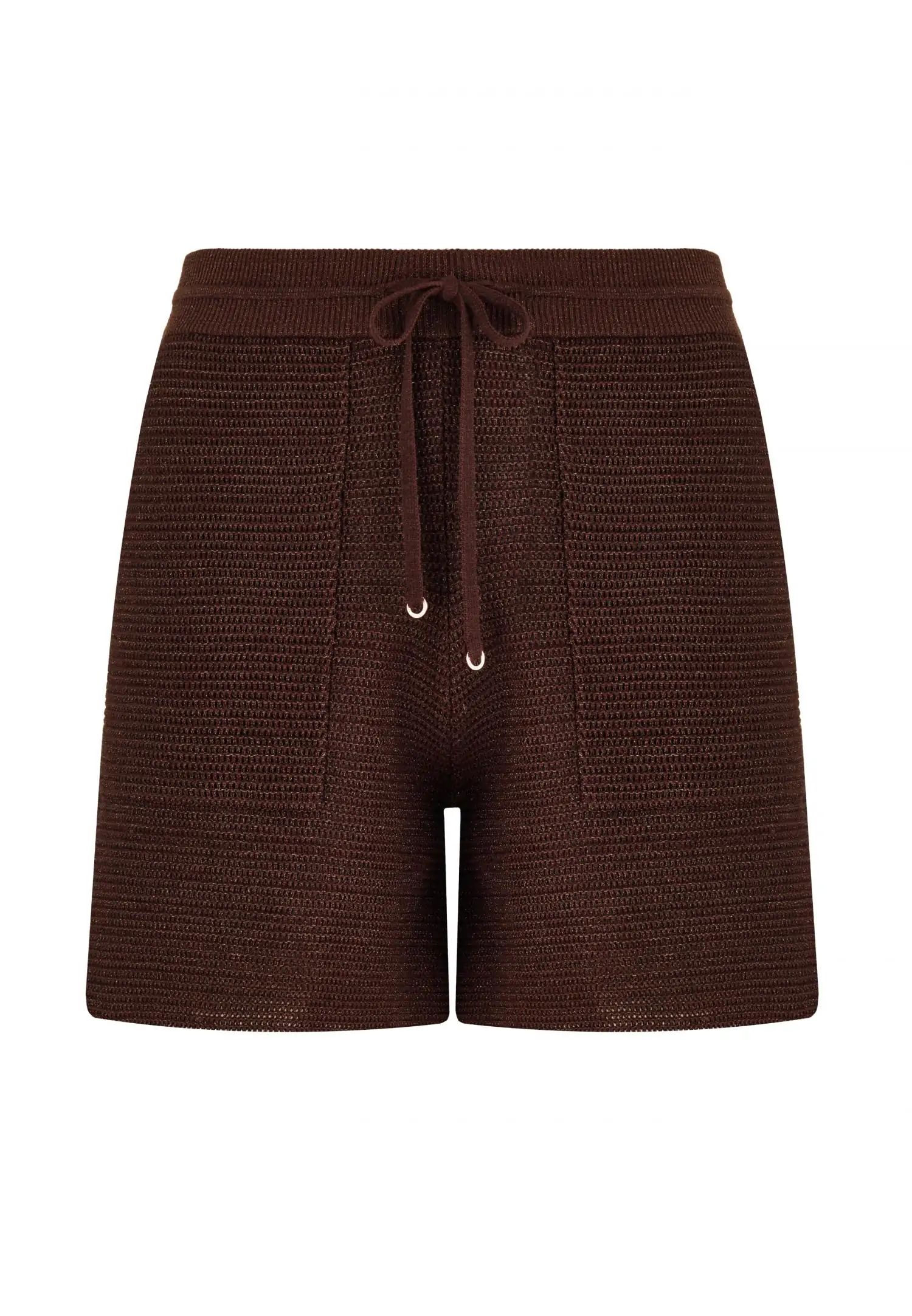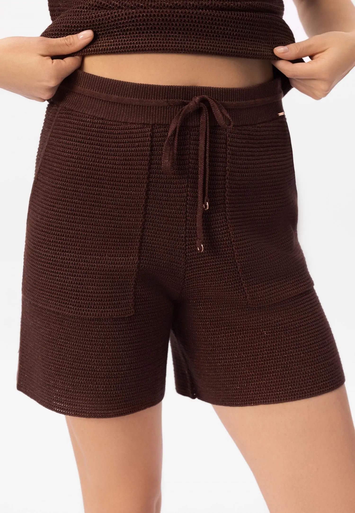 Широко прилепнали плетени шорти с еластична талия и регулируеми връзки. Комфортната дължина прави този модел идеален избор за летните дни. POETIC DREAMS съчетава мекия лукс на памука и коприната с нежния блясък на ултрафината лурексова нишка. Леката и ефирна прежда е изплетена в модерна имитация на плетене на една кука, която изглежда едновременно модерна и вечна. Продуктът е проектиран и разработен в Естония.