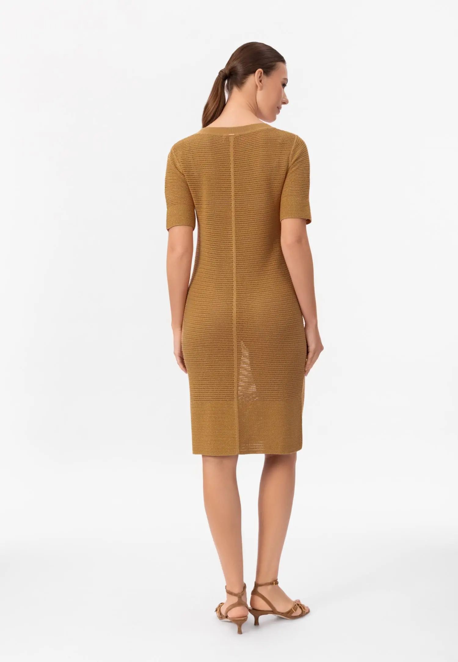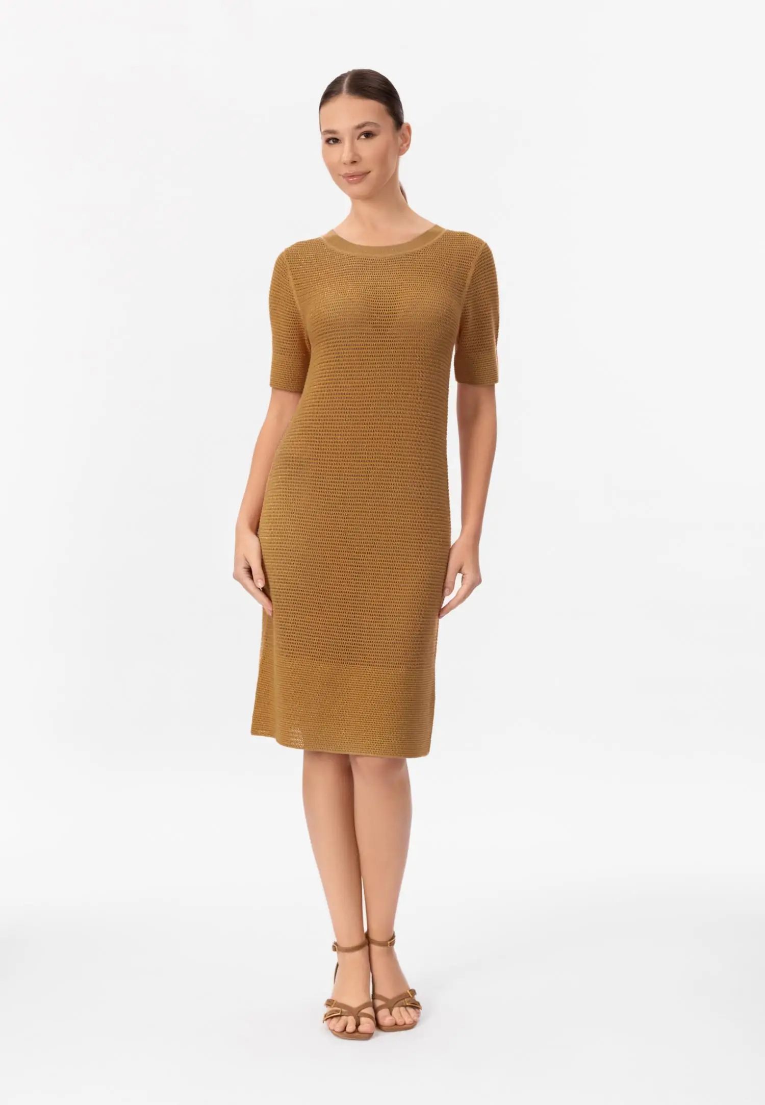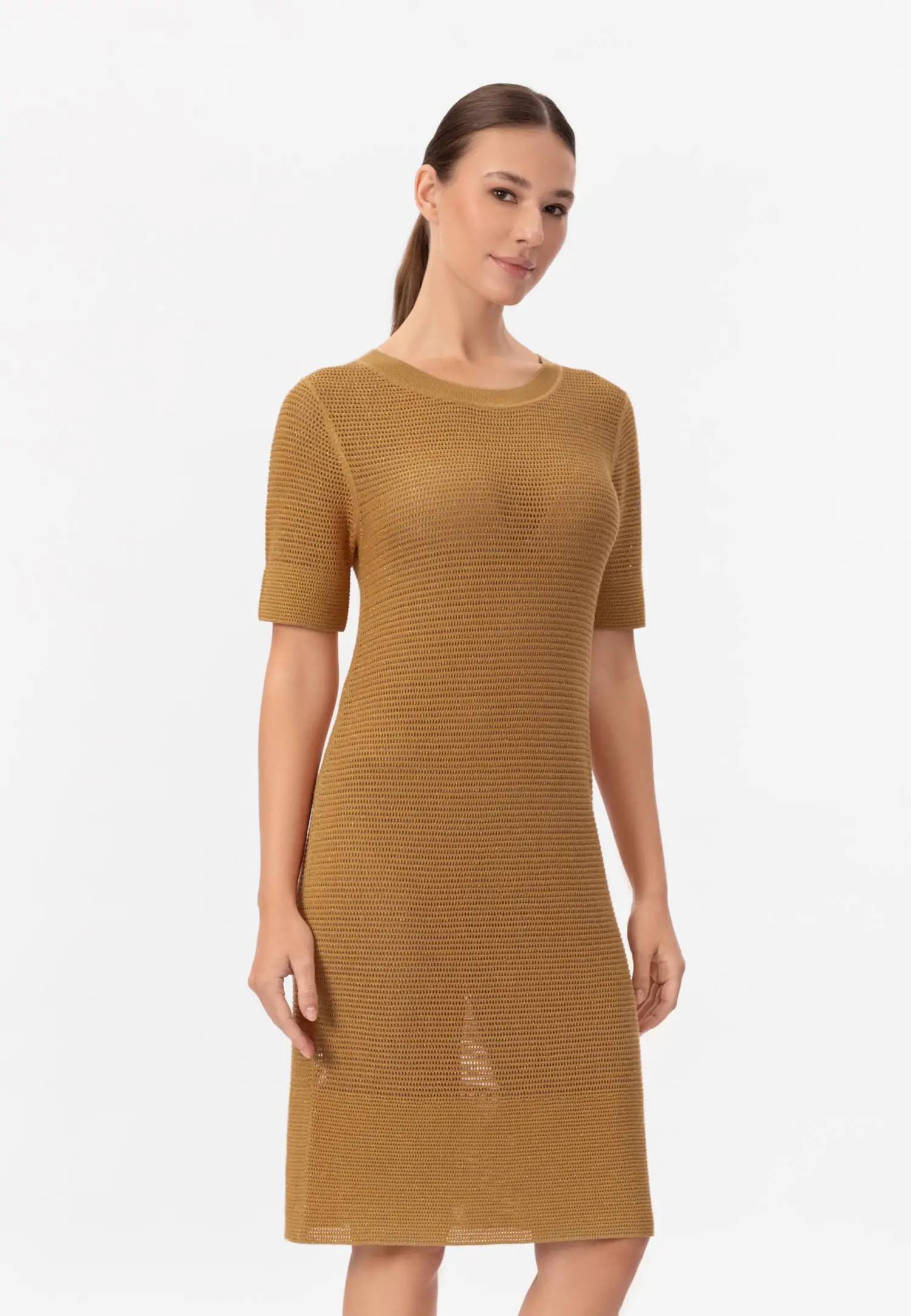 Плетена рокля с къс ръкав и обло деколте, с минималистична, свободна кройка и фини вертикални детайли, които създават изчистен и женствен силует. POETIC DREAMS съчетава мекия лукс на памука и коприната с нежния блясък на ултрафина лурексова нишка. Леката и ефирна прежда е изплетена в модерна имитация на плетене на една кука, която изглежда едновременно модерна и вечна. Продуктът е проектиран и разработен в Естония.