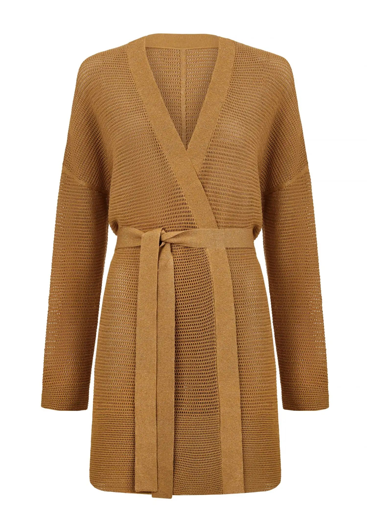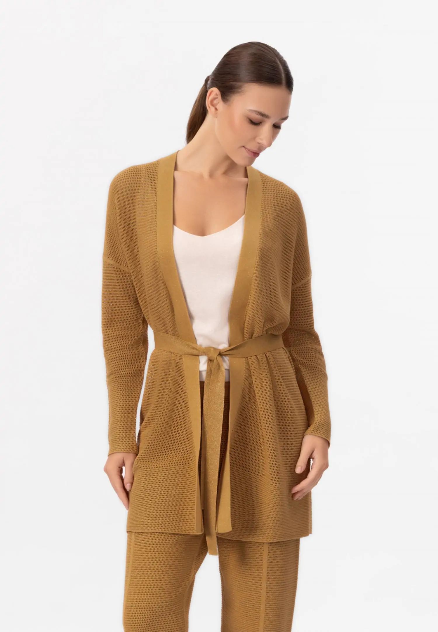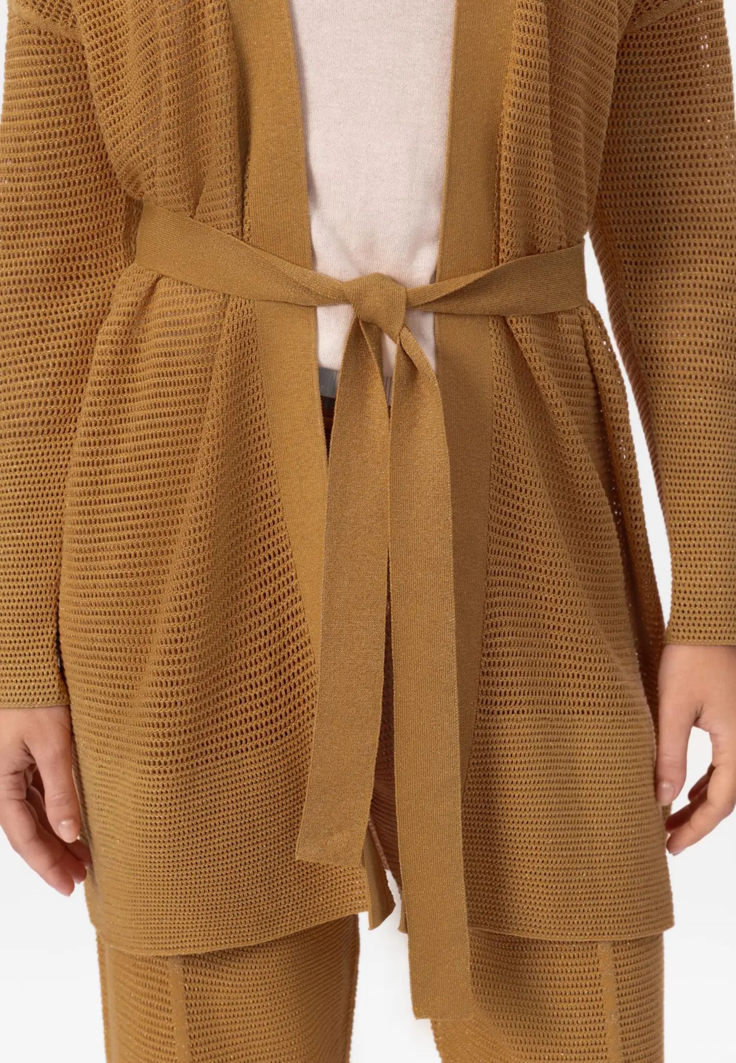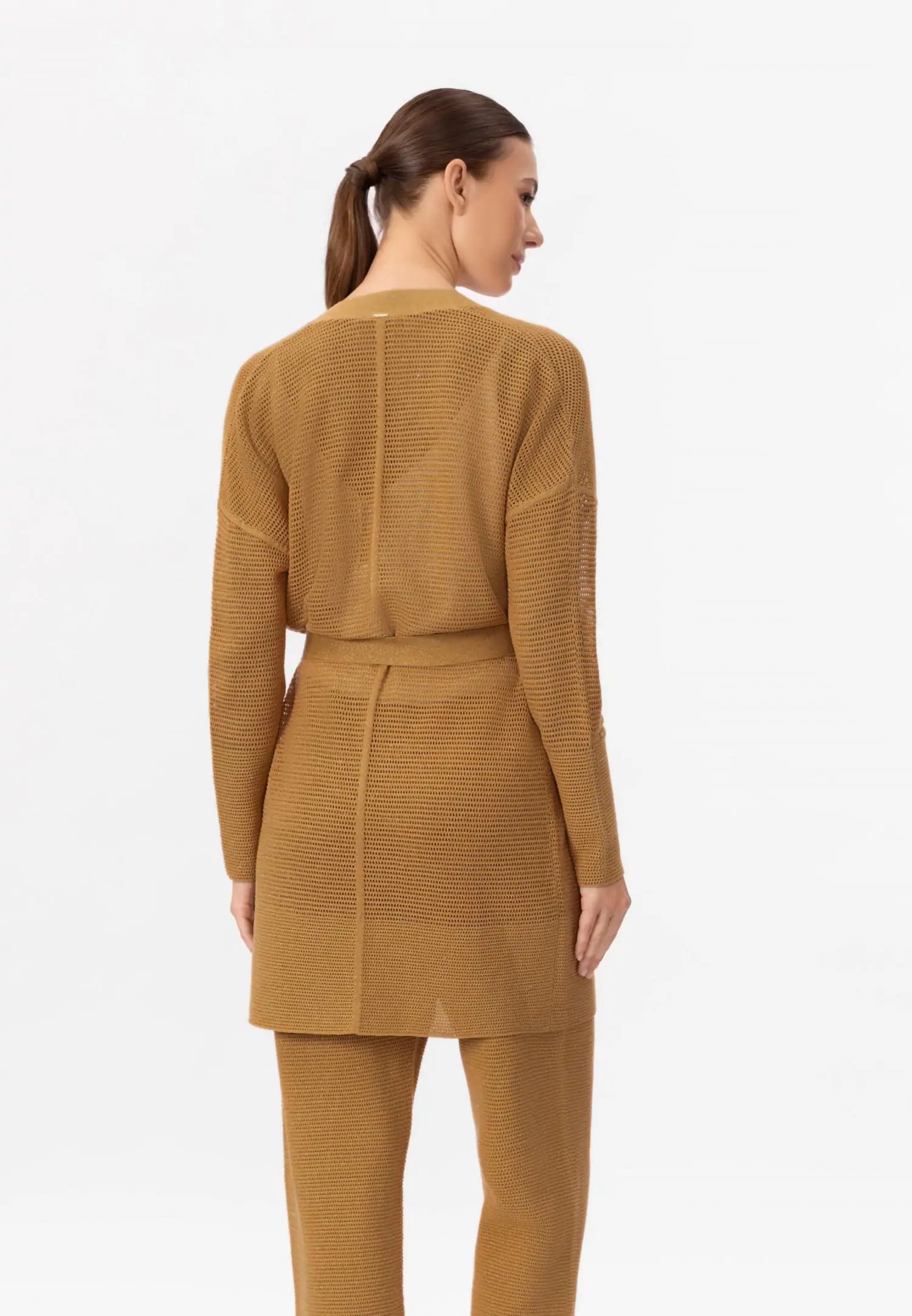 Жилетка с колан и миди дължина, с удължена линия на раменете, която създава модерен и ефирен силует. POETIC DREAMS съчетава мекия лукс на памука и коприната с деликатния блясък на ултрафина лурексова нишка. Леката и ефирна прежда е изплетена в модерна имитация на плетене на една кука, която изглежда едновременно модерна и вечна. Продуктът е проектиран и разработен в Естония.