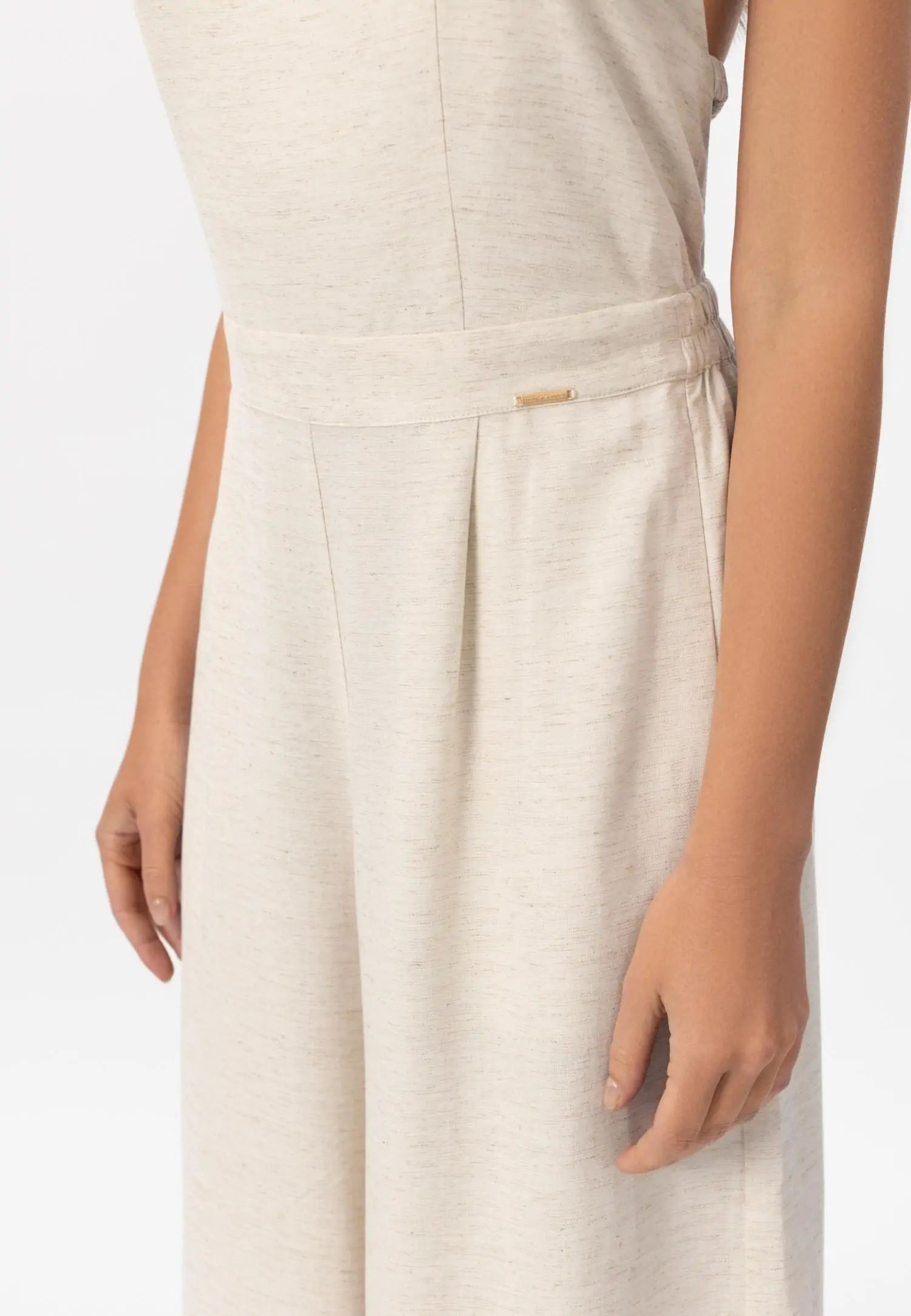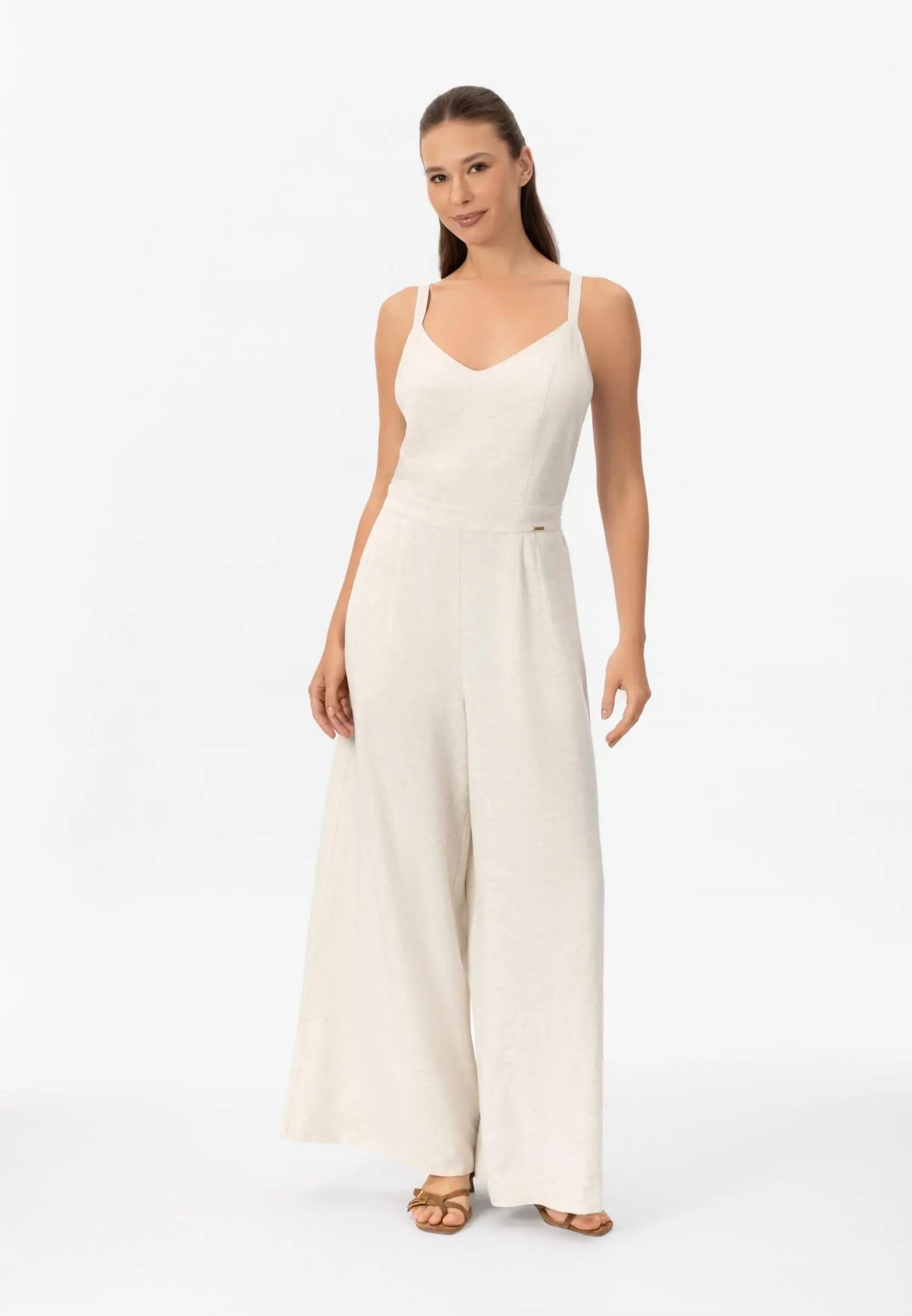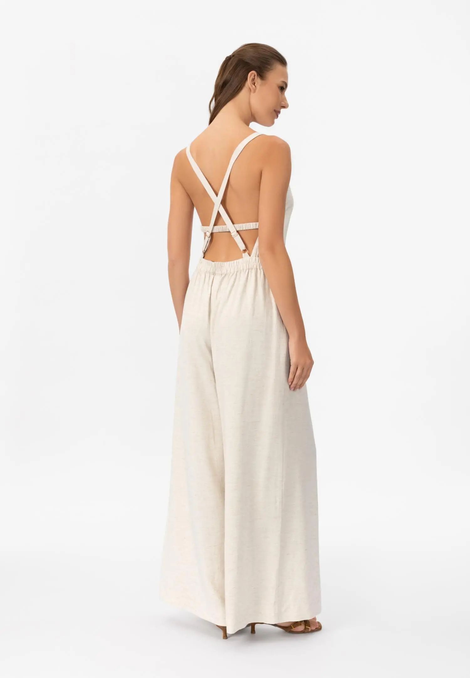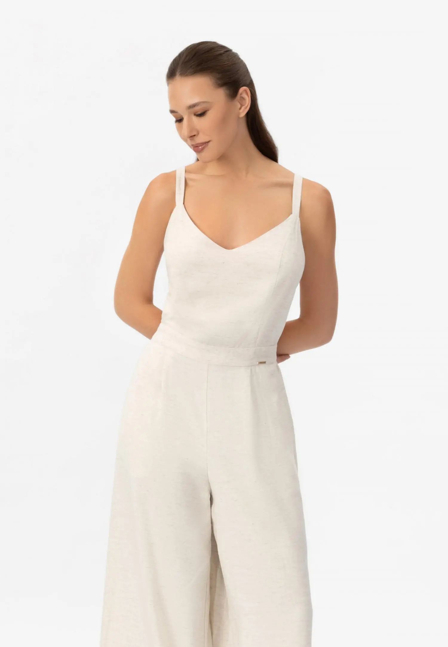 Широк гащеризон със странични джобове, създаващ ефирен и удължаващ силует. V-образното деколте и регулируемите връзки на гърба позволяват персонализирано прилягане и добавят женствен акцент. Серията SHINY LINEN съчетава естествената дишаемост и охлаждащия ефект на лена с елегантна драпировка. Бързосъхнещият и нежен към кожата материал предлага комфорт дори в горещите летни дни, а меката текстура създава луксозна и практична цялост. Това е колекция, която внася лекота и увереност в лятото. Продуктът е проектиран и разработен в Естония.