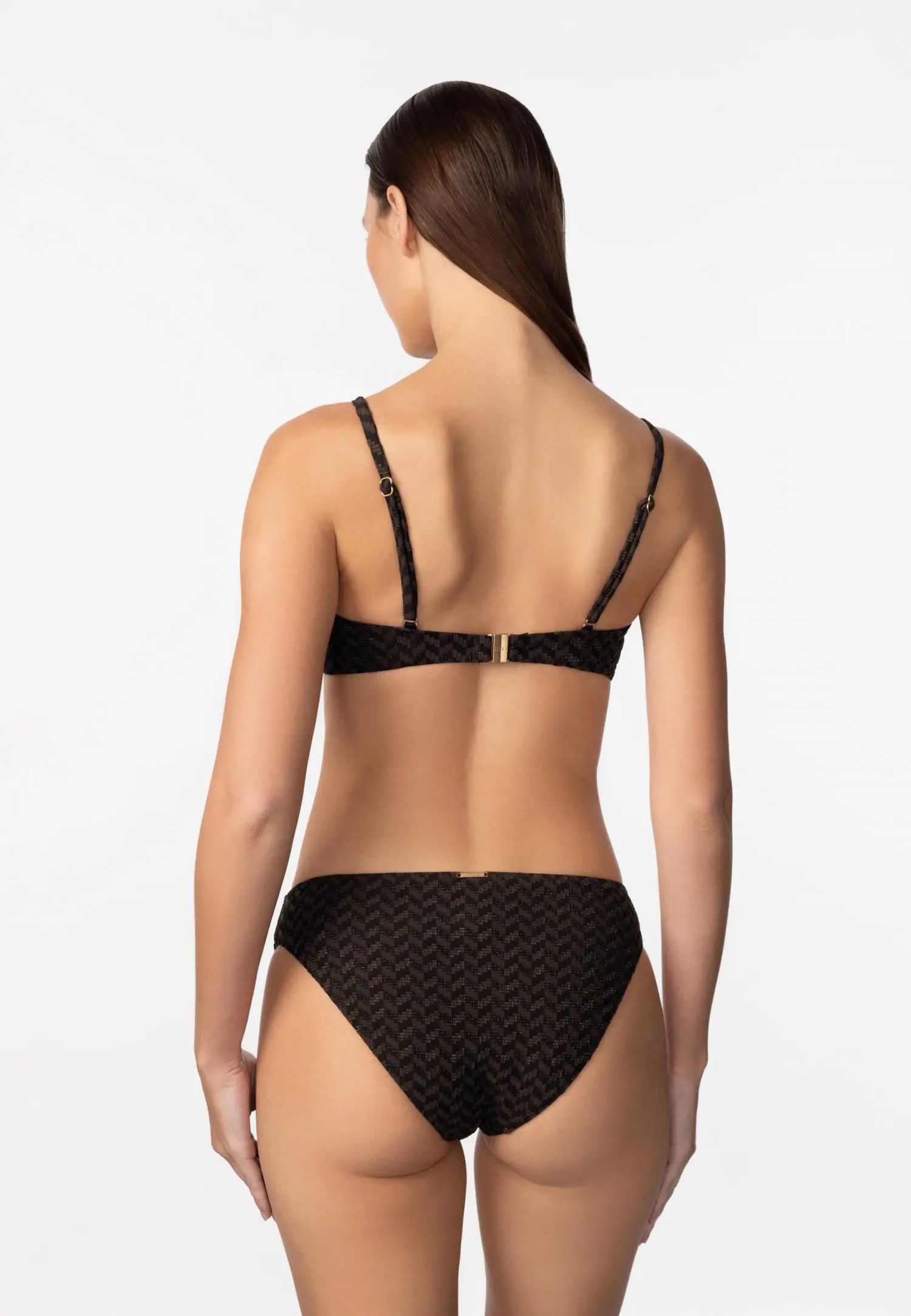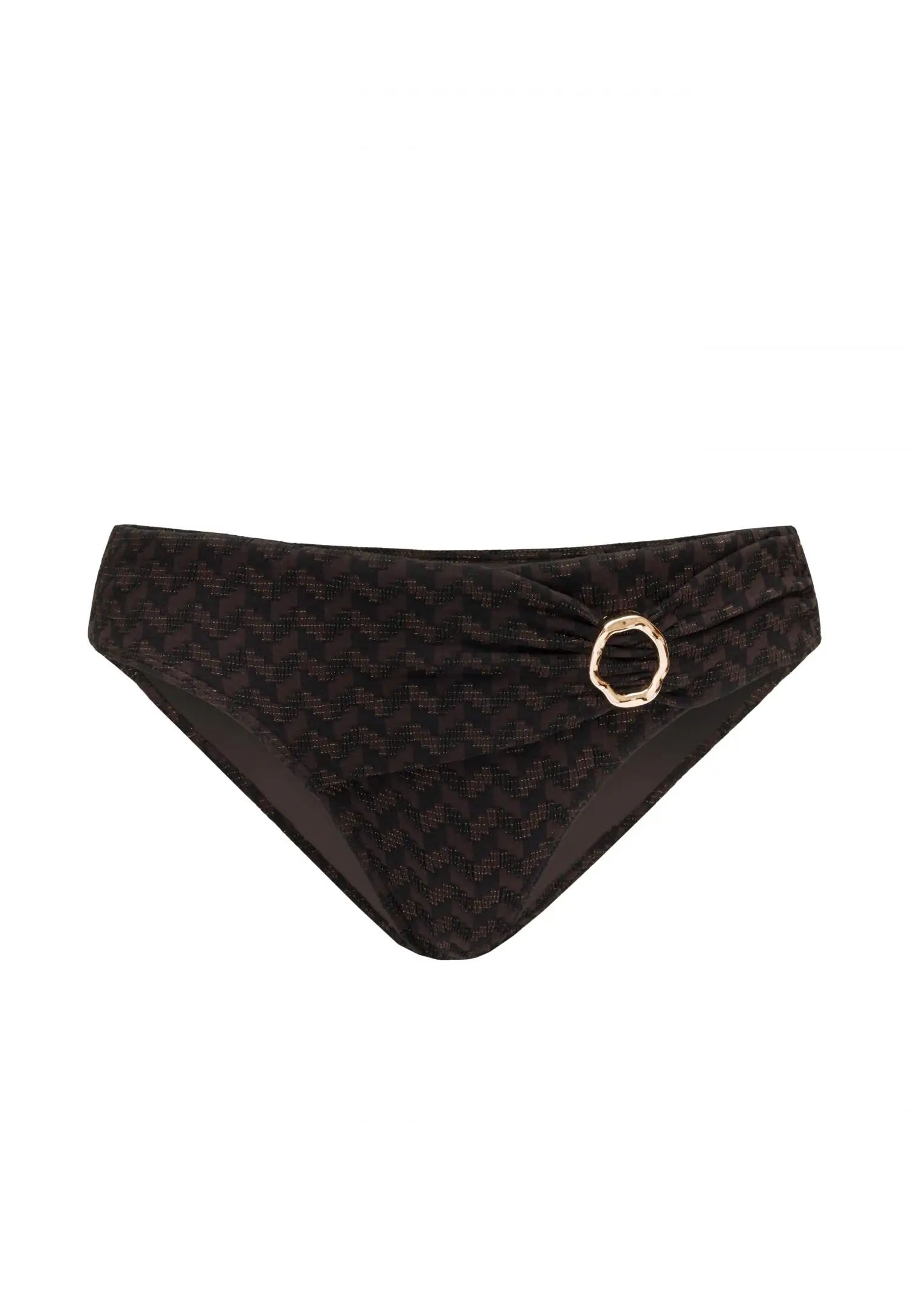Класически бикини долнища със средна талия и средно покритие на крачолите. Подплатени отпред и отзад, осигуряващи допълнителен комфорт, идеално покритие и поддръжка. Серията BRONZE SPARK съчетава топъл бронзов тон с фин блясък, който улавя светлината при всяко движение. Текстурата и металният ефект създават луксозен и привличащ вниманието плажен вид. Продуктът е проектиран и разработен в Естония.