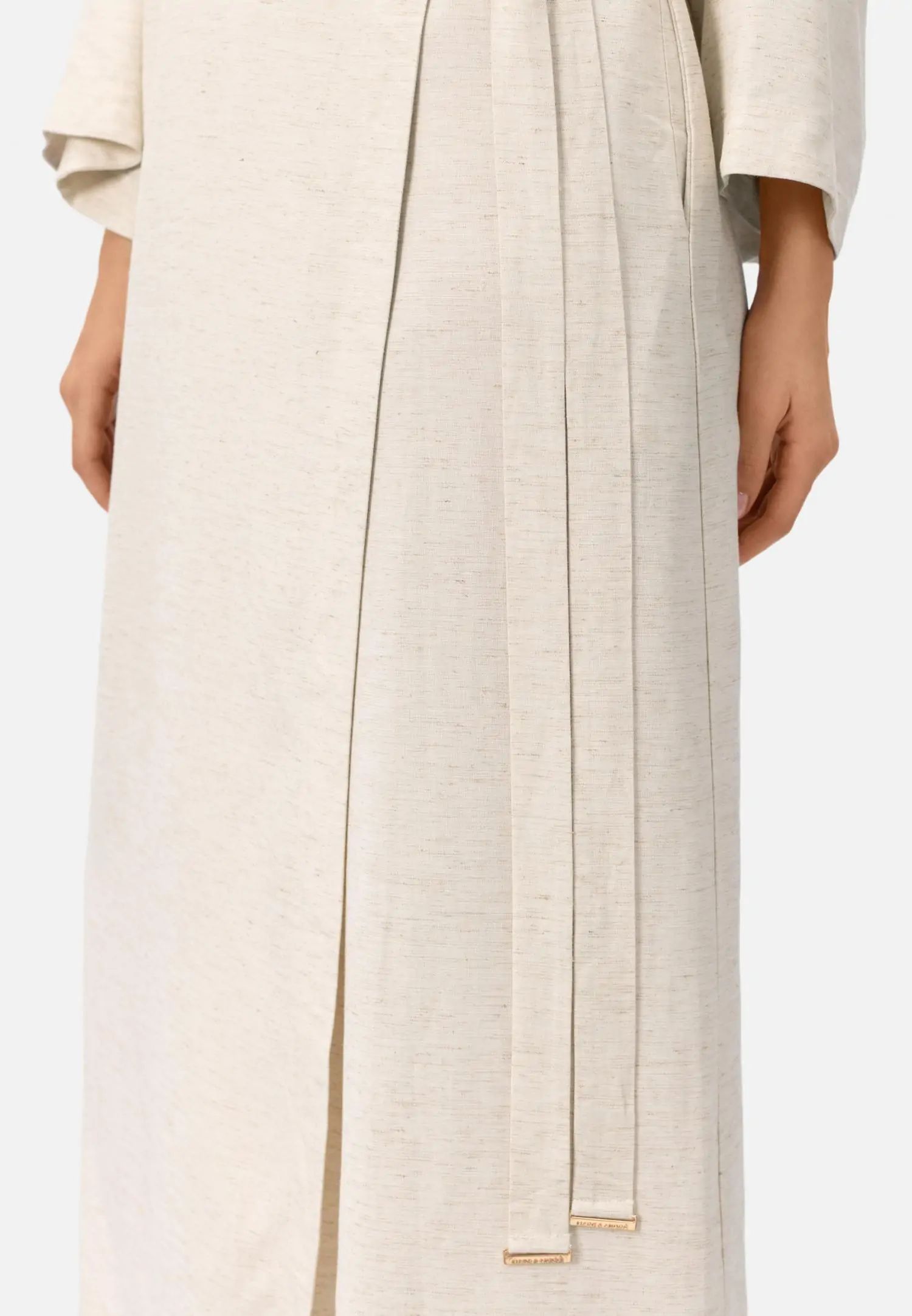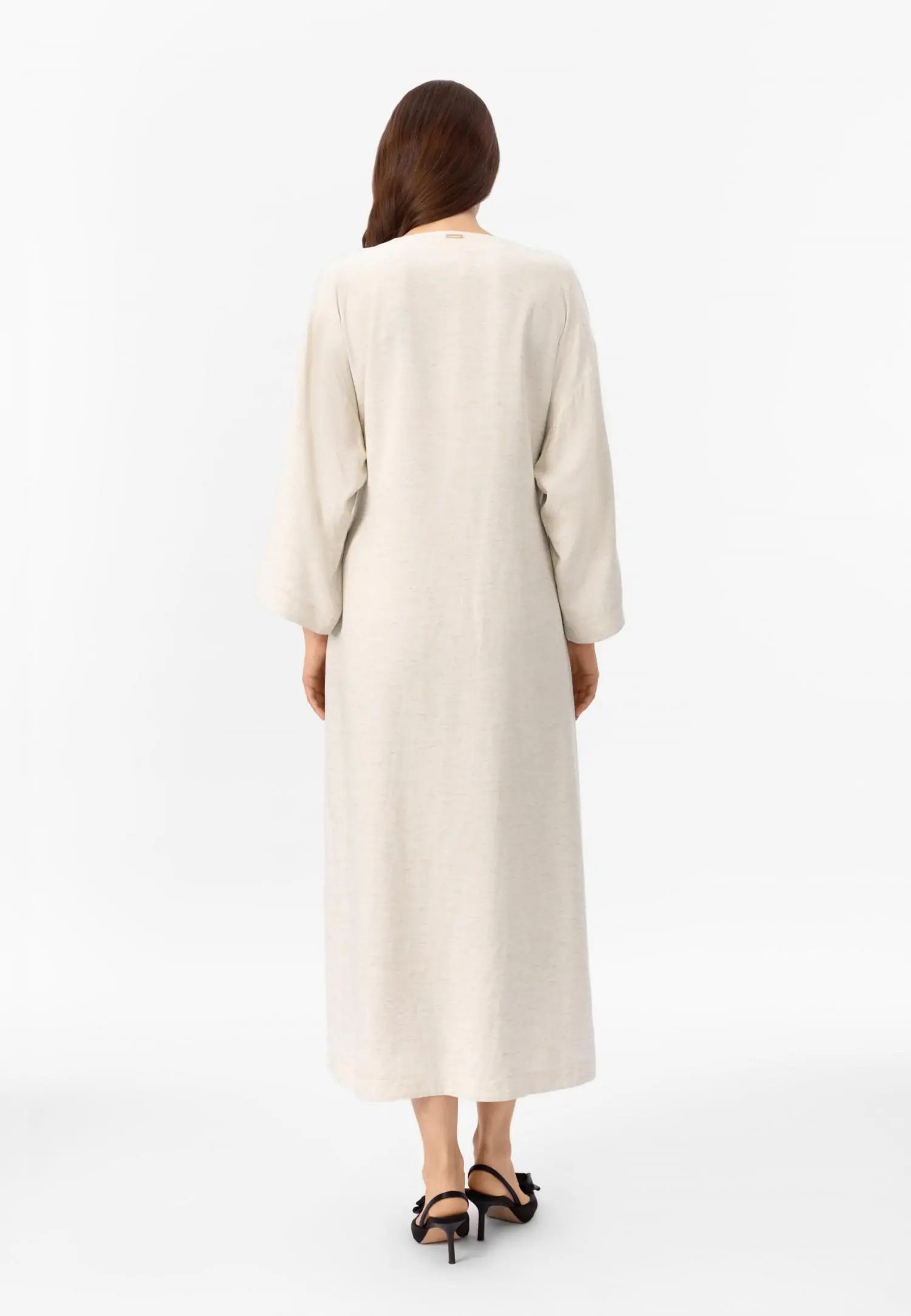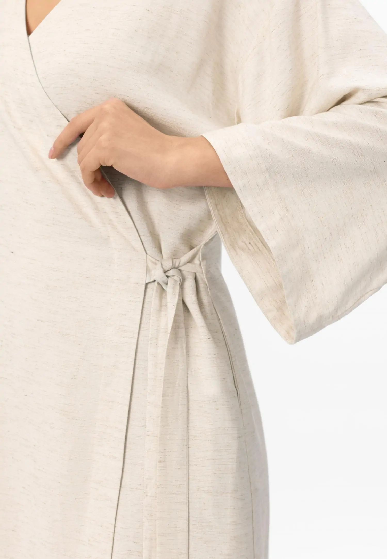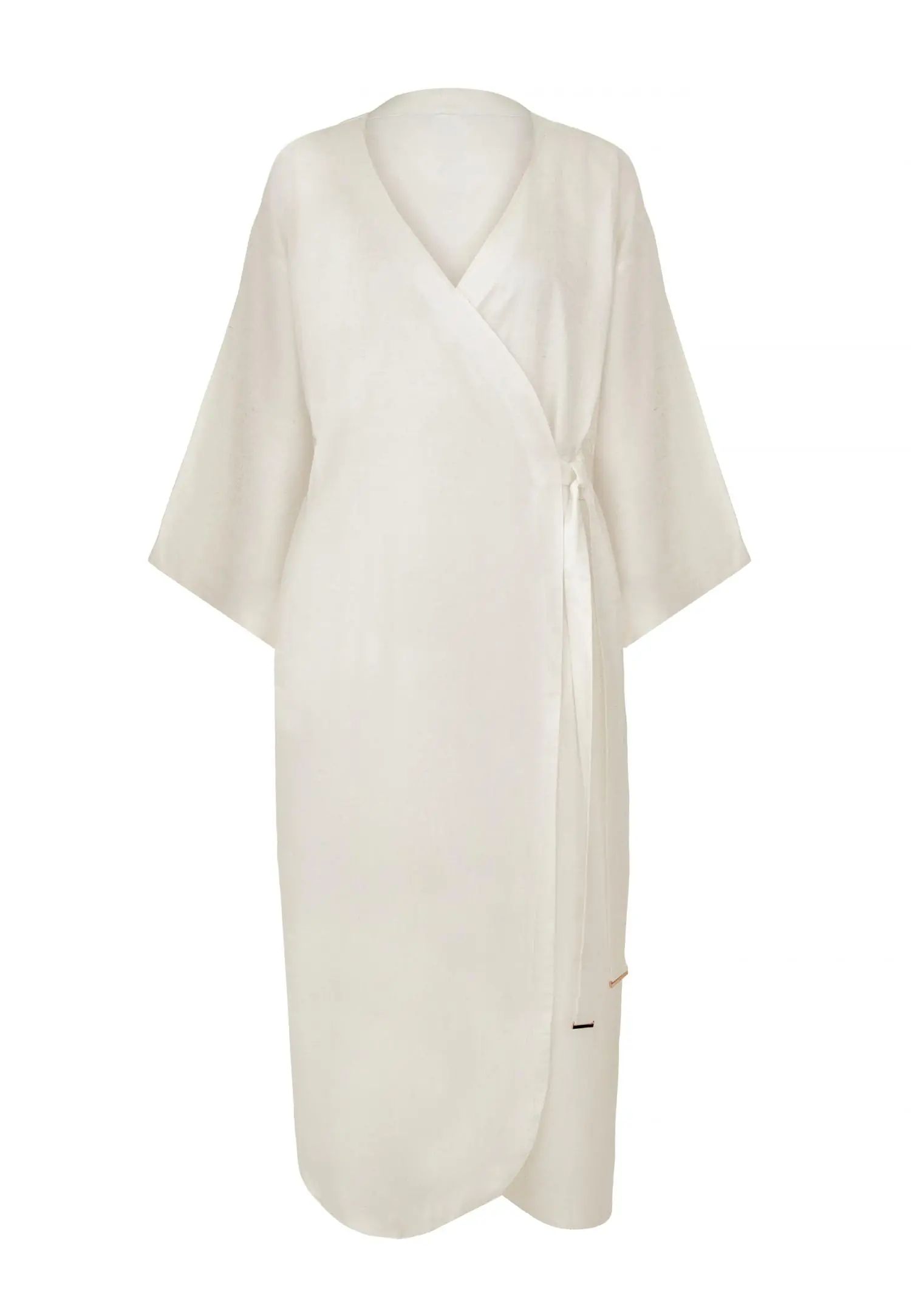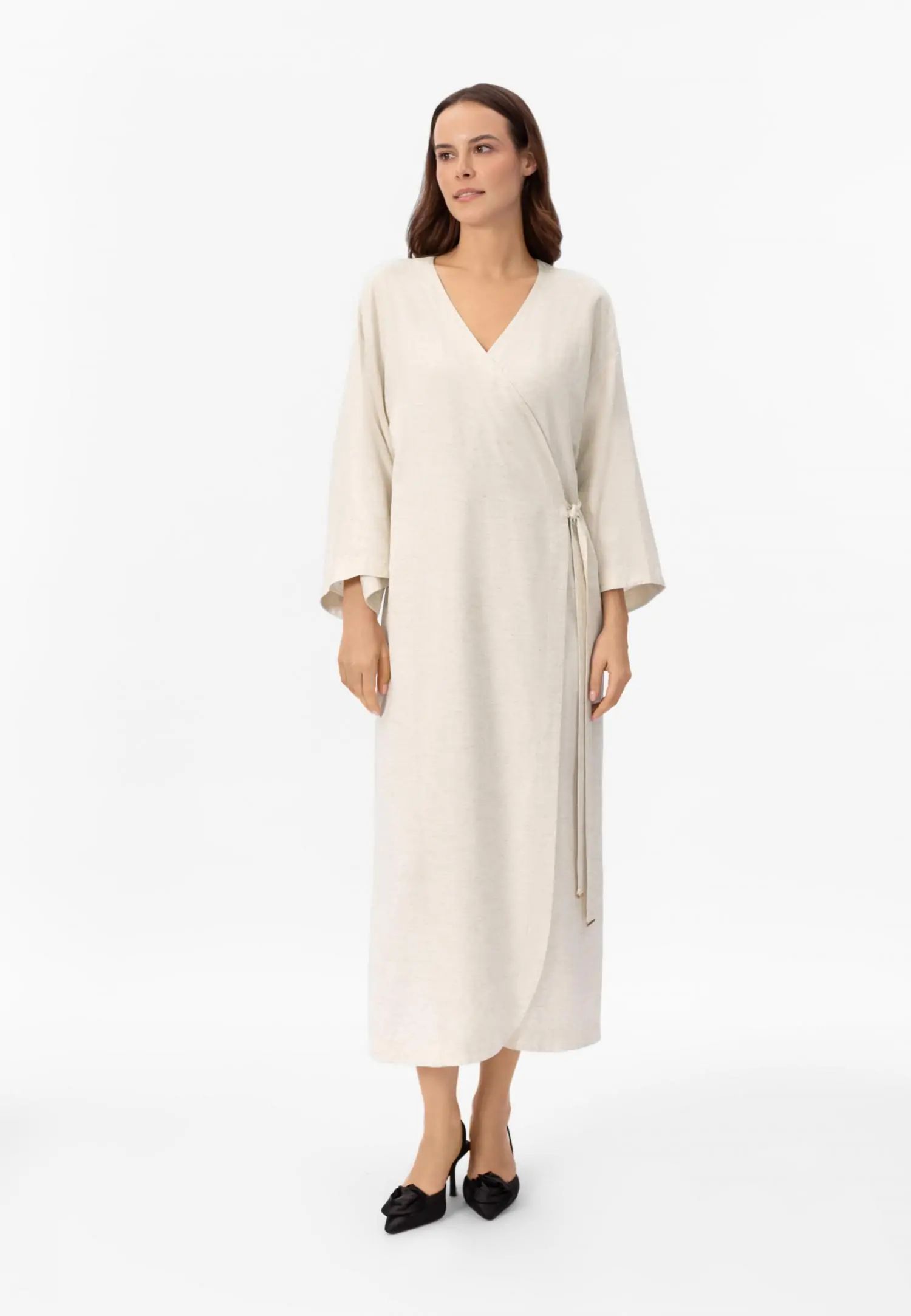 Рокля тип кимоно с дължина миди и 3/4 ръкави, която може да се носи като рокля, леко лятно яке или плажно кимоно. Странични джобове и колан с връзване създават практичен и елегантно адаптивен силует. Серията SHINY LINEN съчетава естествената дишаемост и охлаждащия ефект на лена с елегантна драпировка. Бързосъхнещият и нежен към кожата материал предлага комфорт дори в горещите летни дни, а меката текстура създава луксозно и практично цяло. Това е колекция, която внася лекота и увереност в лятото. Продуктът е проектиран и разработен в Естония.