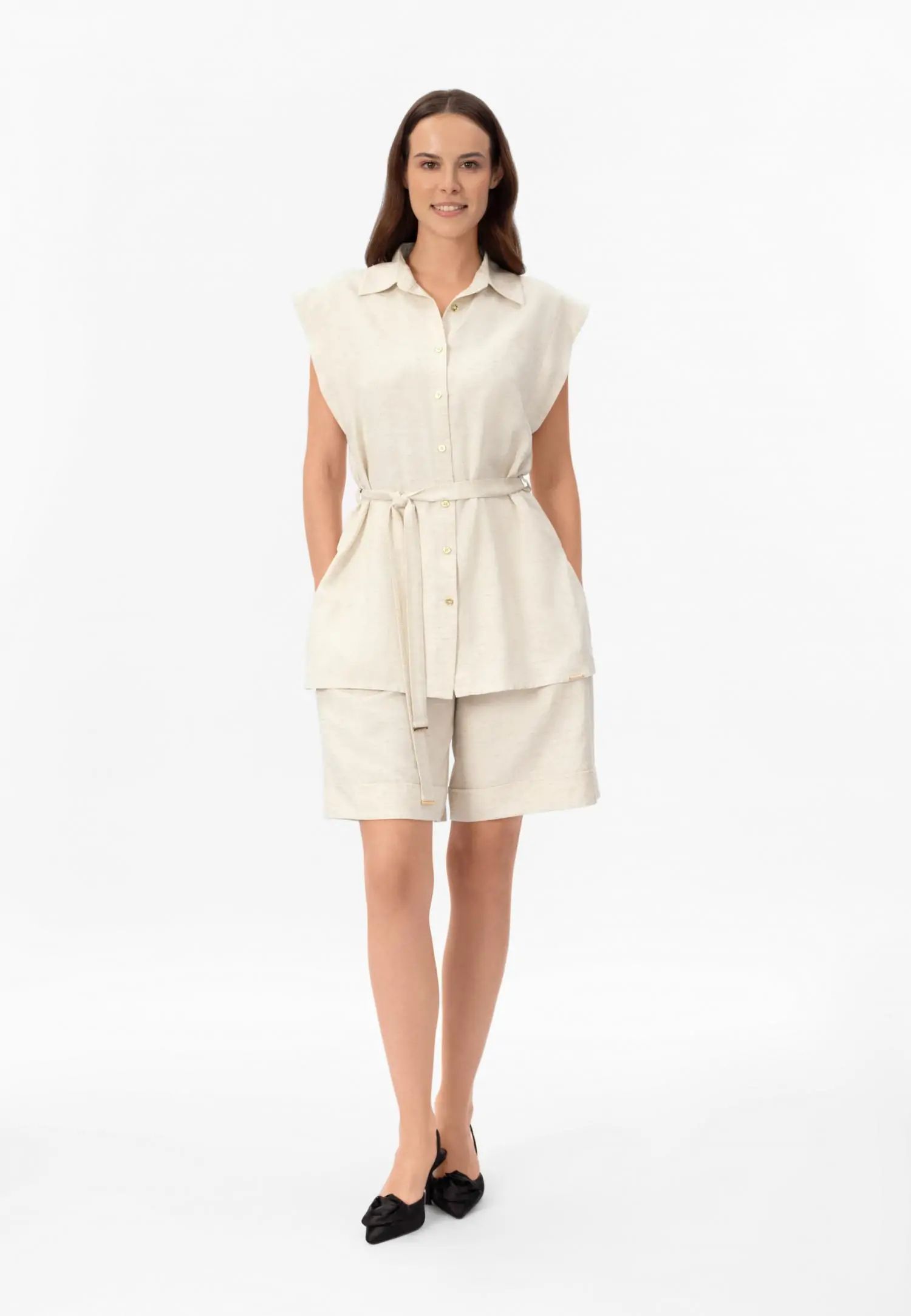 Къси панталони със свободна кройка и странични джобове, с лек чатал на гърба за удобно и гъвкаво прилягане. Семплата, вечна кройка е идеална както за плажа, така и за града. Серията SHINY LINEN съчетава естествената дишаемост и охлаждащия ефект на лена с елегантен драп. Бързосъхнещият и нежен към кожата материал предлага комфорт дори в горещите летни дни, а меката текстура създава луксозно и практично цяло. Това е колекция, която внася лекота и увереност в лятото. Продуктът е проектиран и разработен в Естония.