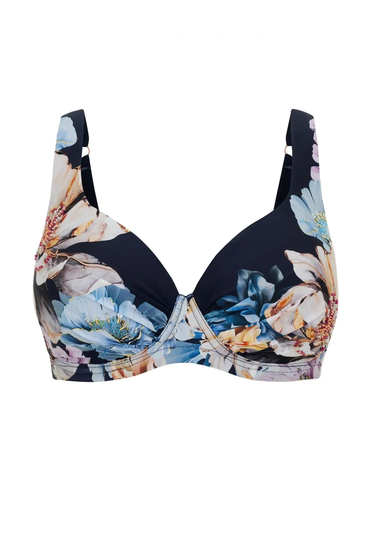 Колекция MIDNIGHT BLOOM - елегантна и феерична! Създаден специално за Marc & André от италианската дизайнерска къща, моделът оживява на наситен тъмносин фон, където луксозните цветя са украсени с фини мъниста и пайети, създавайки триизмерен ефект. Класическите и обичани кройки подчертават вечността и изтънчеността на колекцията. Това е красива и детайлна колекция, която въплъщава перфектния баланс между елегантност и модерност. Горнище на бански с формовани чашки и банели. По-широки и поддържащи презрамки, които се регулират по дължина. Метална закопчалка без съдържание на никел на гърба. Продуктът е проектиран и разработен в Естония!